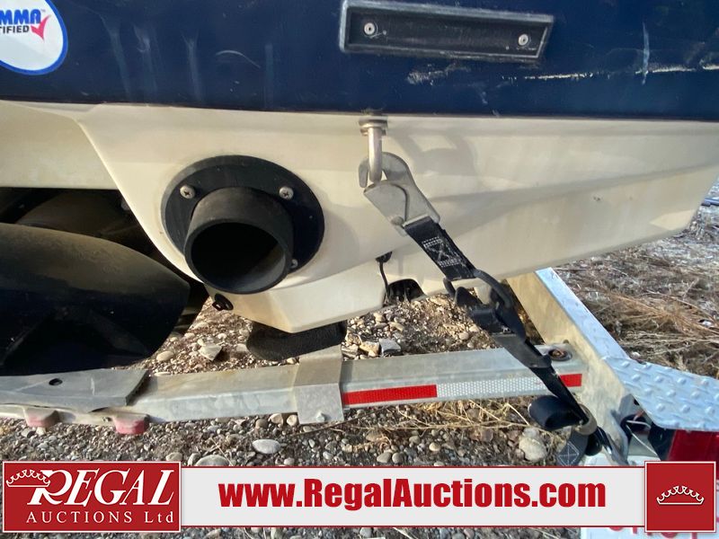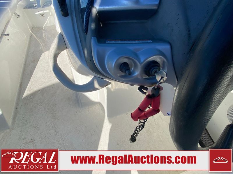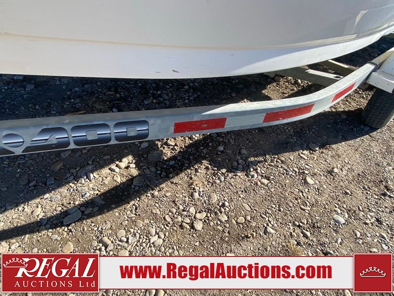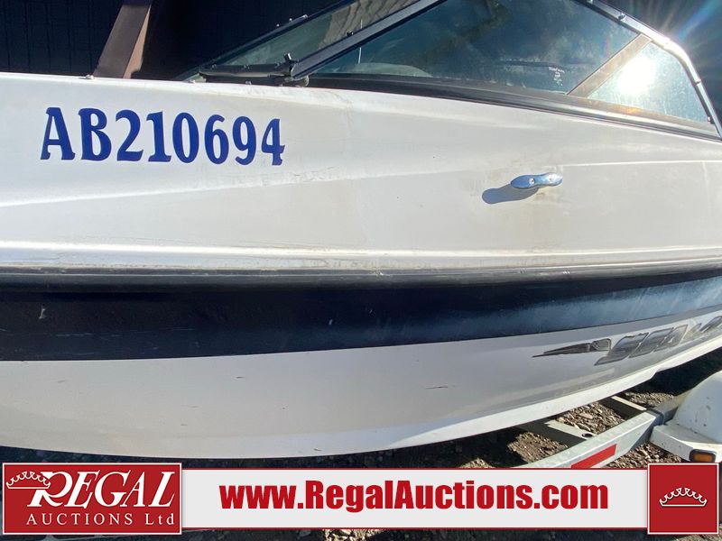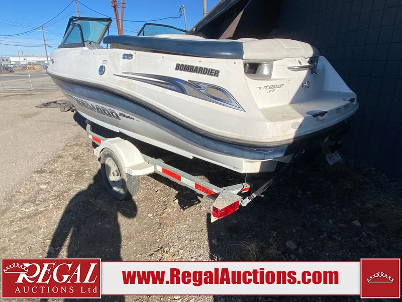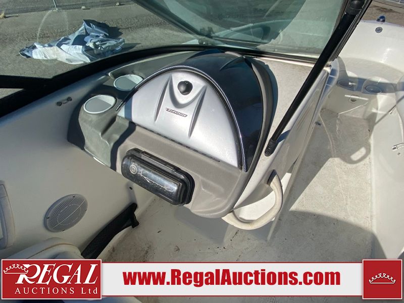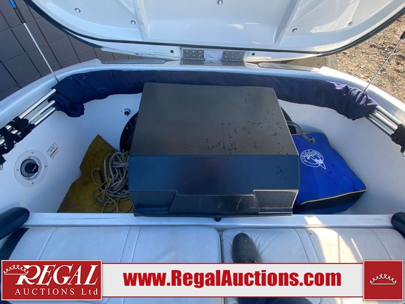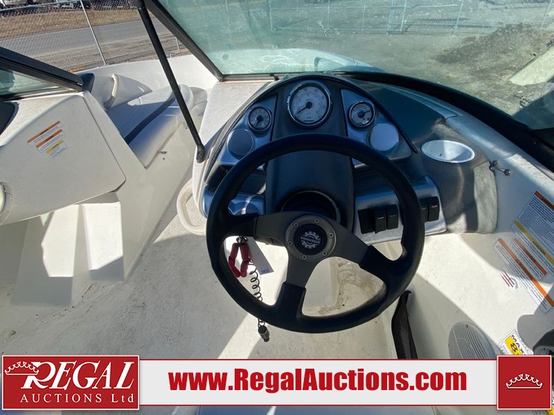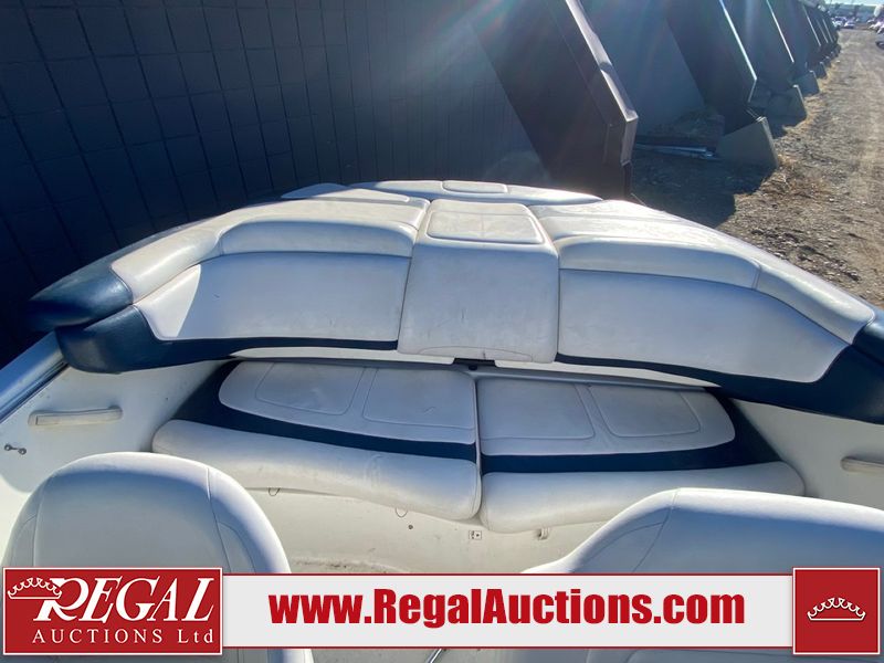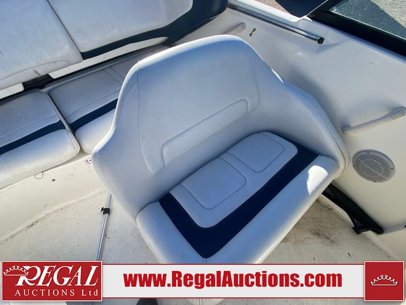 This watercraft is a 18.5' 2004 Sea-Doo Utopia 185 bowrider model with a fibreglass V- Type hull. This unit has a maximum capacity of 8 persons or 1,320 pounds. This unit is not equipped with an hour metre. The interior is in fair overall condition for its year. The seats are showing some signs of wear. The hull has scratches, scrapes, and some fading. The bow has several large chips. Some decals are peeling. The boat comes with a single axle trailer. The tires have been mounted to steel rims and appeared to be in good enough condition for use. The has not been tested. This unit is powered by a 2 stroke 200 HP 2.5L Mercury OptiMax 200 V6 engine with a mercury jet drive. The inlet and Jet unit appear to be in good enough condition for use. This unit is equipped with a stereo system and a Bimini top.