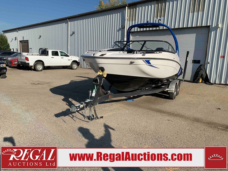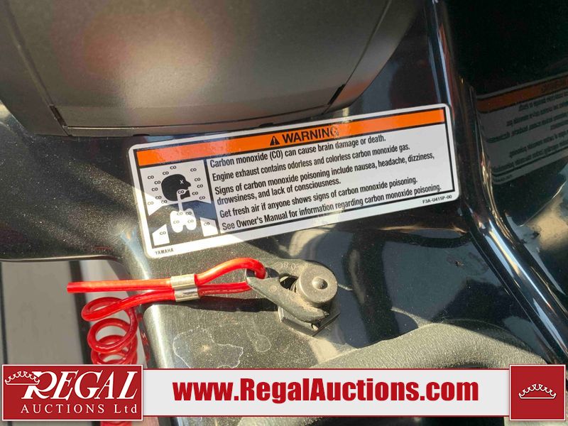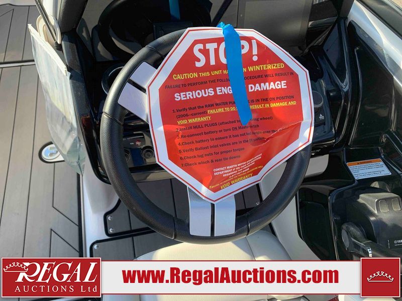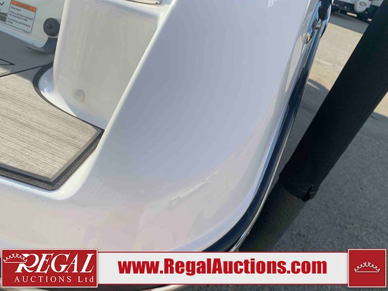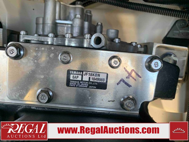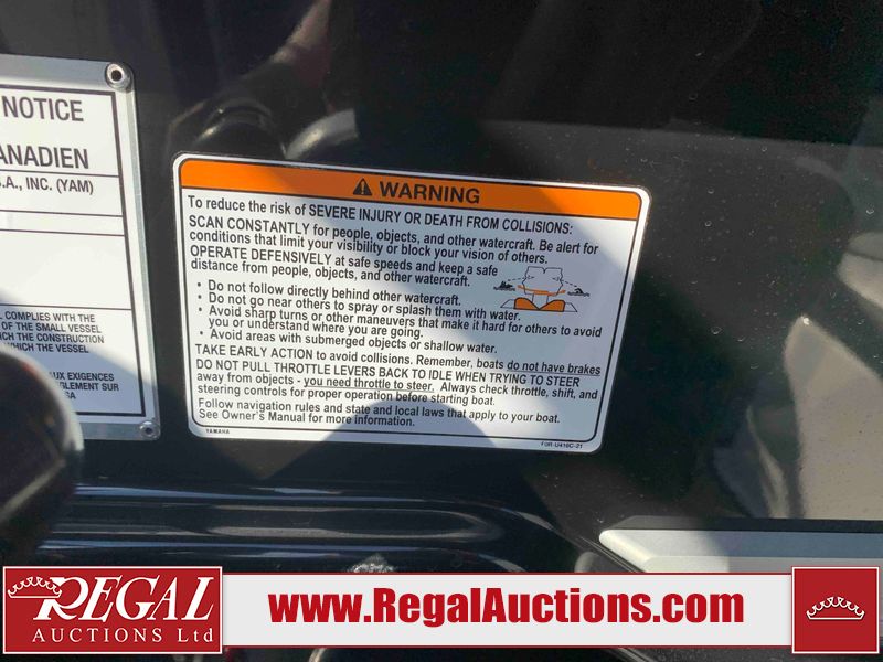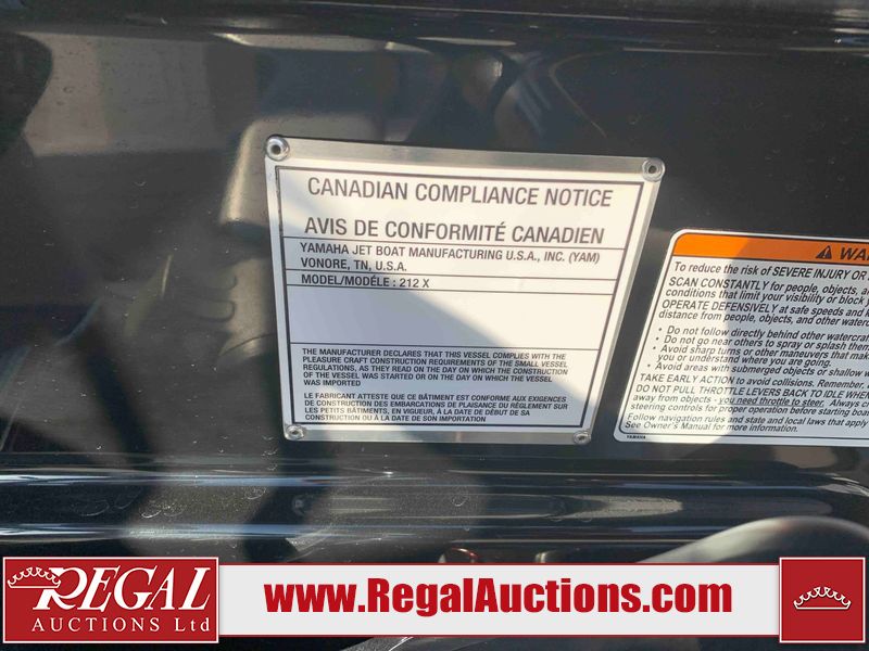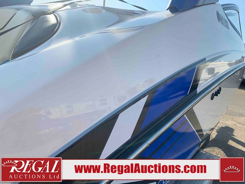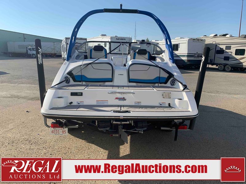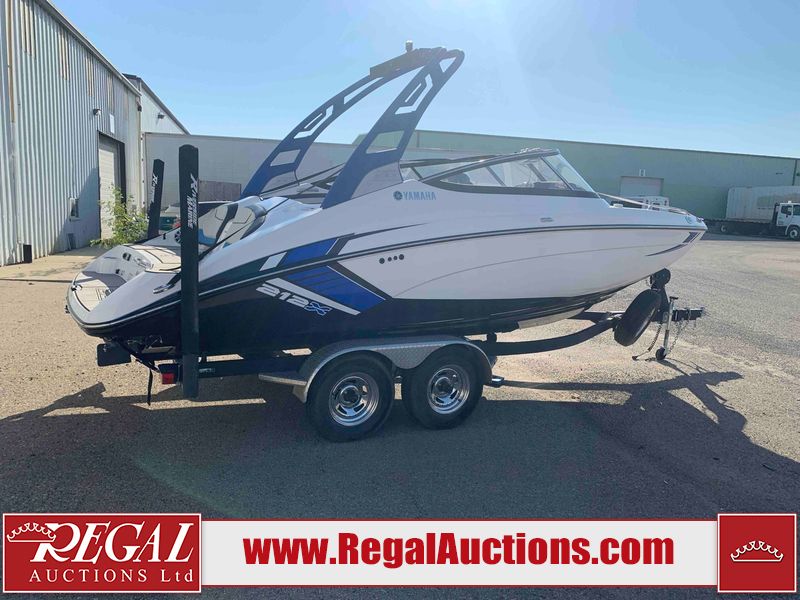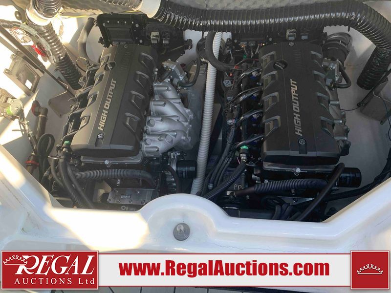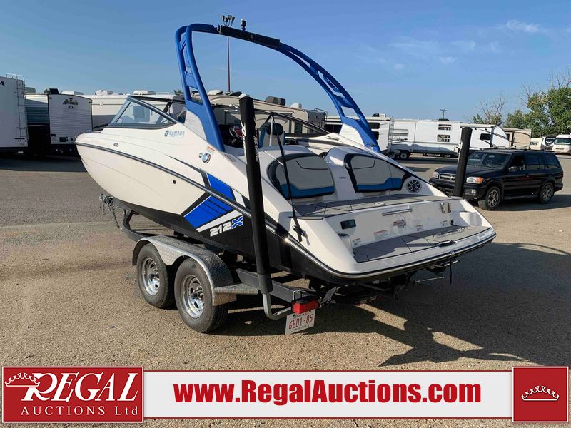 This watercraft is a 2019 Yamaha 212X model V type haul 21 foot jet boat. The odometer shows 97 and 96 engine hours. The interior is clean. Some of the plastic trims and Bimini top are showing light scuffs. The hull has scratches and scuffs. The bow and outboard have scuffs. Some of the decals have scratches. The front end of the trailer has minor chips. This unit is powered by two Yamaha four-cylinder engines. The tires have been mounted to alloy rims and appear to be good enough condition for use. It is equipped with a stereo system, Bimini top and an outboard.