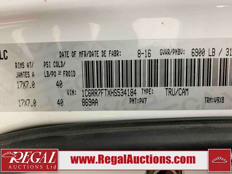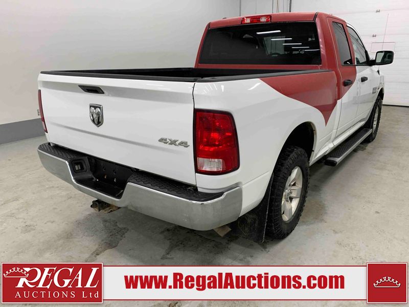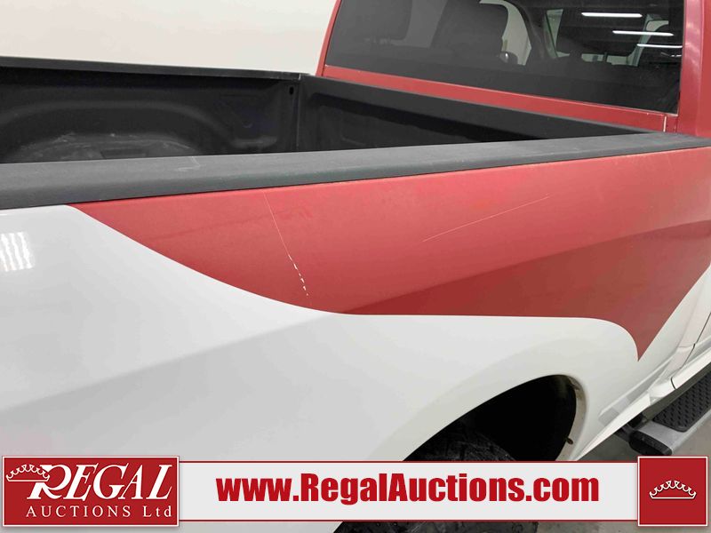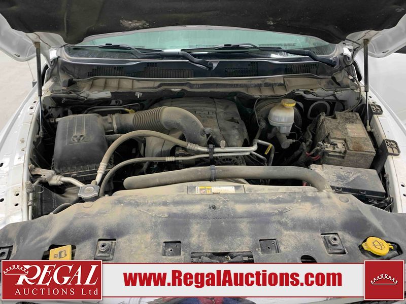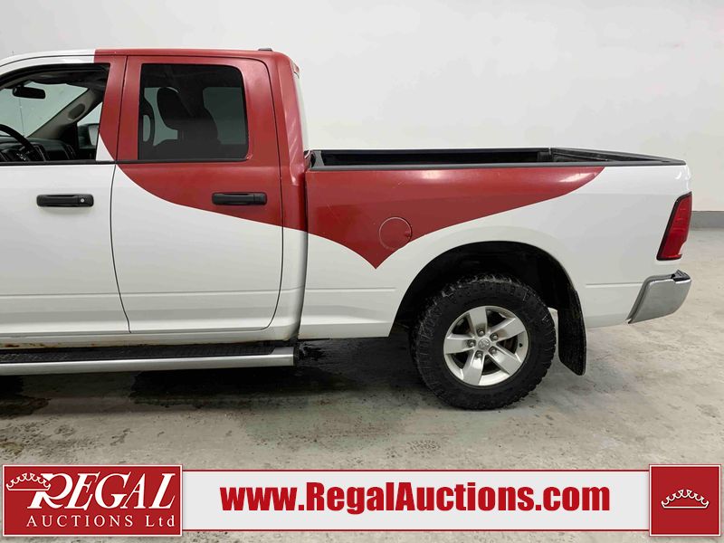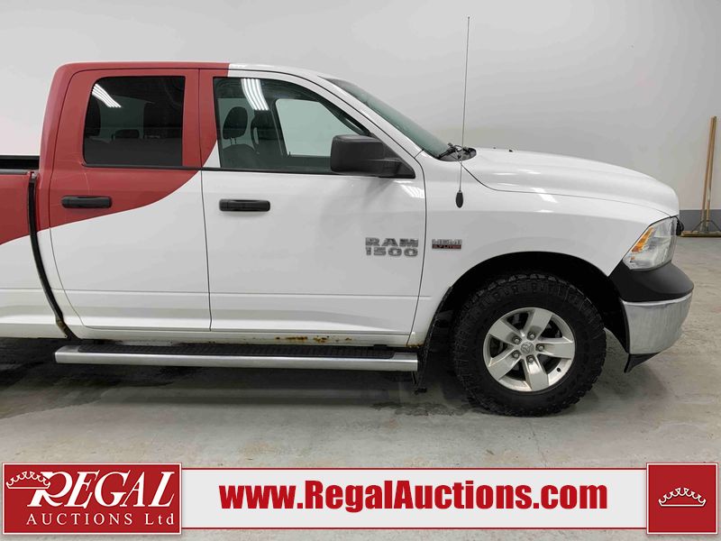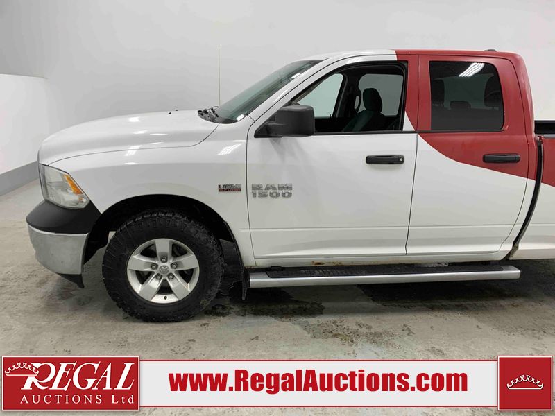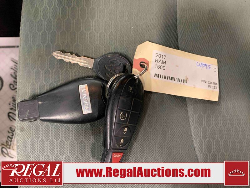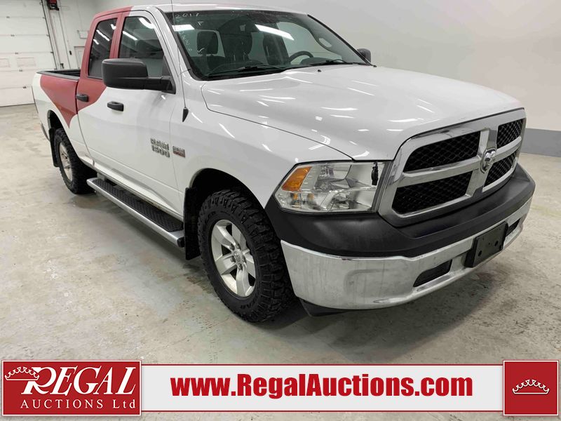 This 2017 RAM 1500 QUAD CAB 4WD is powered by a 5.7L V8 gasoline engine and an automatic transmission. It is equipped with four-wheel drive. The truck has seats for 6 people. The mileage is average considering the truck's age. The body looks to be in fair condition overall. There are chips on the front bumper, hood, left front fender, left rear fender, and right rear fender. There is incidental rust on the front bumper, left rear fender, and tailgate. There is minor dent damage on the front bumper and hood. There is paint peeling on the hood. There are scratches on the left rear fender, rear bumper, tailgate, and right rear fender. There are very minor chips in many areas around the body. There are very minor scratches in some areas around the body. There is very minor dent damage on the left rear fender. The interior looks to be in good condition overall. The driver's seat is worn. The driver's seat and rear seats are stained. The windshield is cracked. All of the tires have lots of tread remaining. This truck is being sold by the fleet department of a corporation or government body. The vehicle will be sold with the following declarations: Fleet Vehicle (See Footnote 1). Footnotes: 1) This vehicle is a commercially owned work vehicle. Regal Auctions Ltd. makes no guarantee or warranty, either express or implied, with respect to the data provided in this report. The information has been provided from the consignor and from sources generally believed to be reliable, however the accuracy of this information cannot be guaranteed by Regal Auctions.
