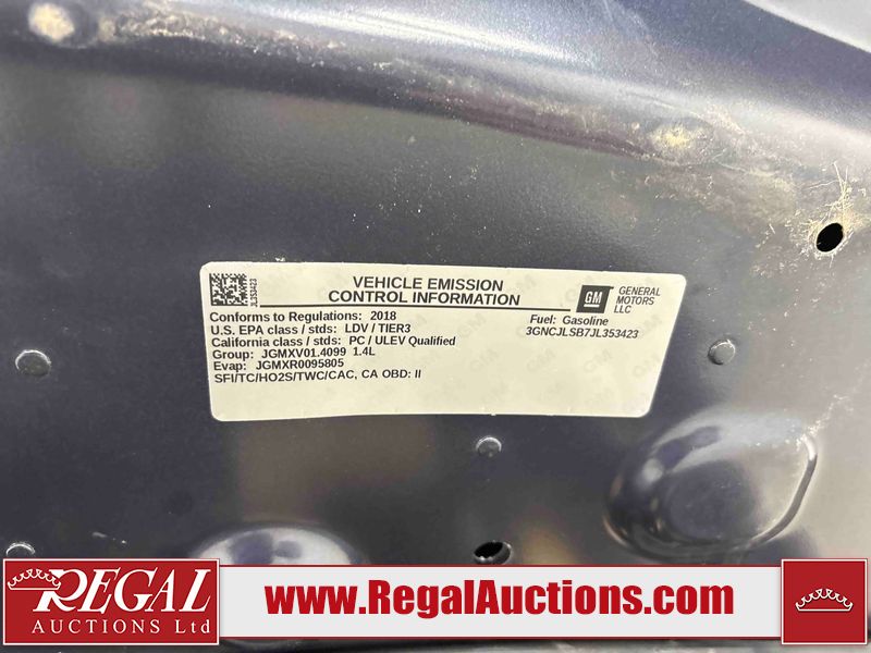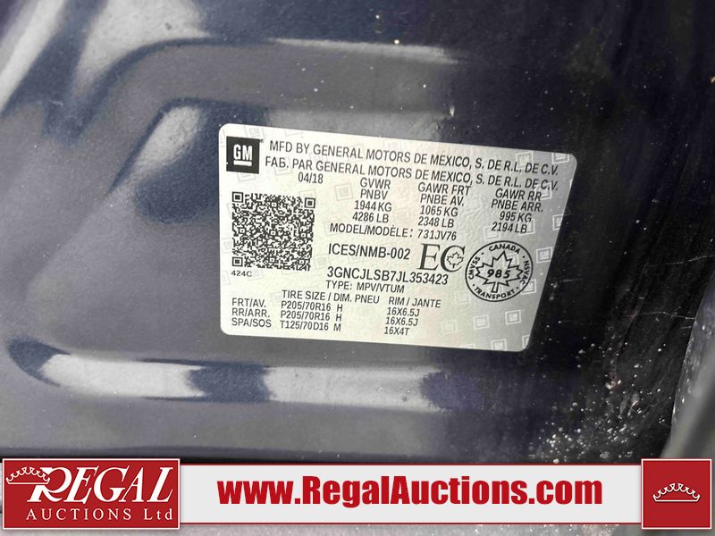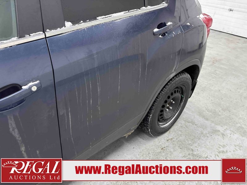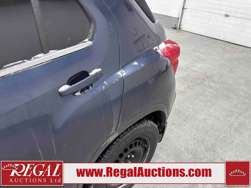 This 2018 CHEVROLET TRAX LT 4D UTILITY is powered by a turbocharged 1.4L 4-cylinder gasoline engine and an automatic transmission. It is a two-wheel drive model. The SUV has seats for 5 people. The mileage is average considering the SUV's age. The vehicle has high-value options including a backup camera. The Tire Pressure light is on. The body looks to be in good condition overall. There is slight dent damage on the left front fender. There are minimal scratches on the left rear door. There is rust on the rear door. There are very minor chips in many areas around the body. There are very minor scratches in many areas around the body. The interior looks to be in good condition overall. The windshield looks to be in good condition. The front tires are nearly bald and should be replaced. The rear tires have lots of tread. This SUV is being sold by an automotive broker. The vehicle will be sold with the following declarations: Out of Province - SK (See Footnote 1). Footnotes: 1) The vehicle's last registered jurisdiction is Saskatchewan. The purchaser must have the vehicle undergo and pass an Out of Province inspection before it can be registered in Alberta. Regal Auctions Ltd. makes no guarantee or warranty, either express or implied, with respect to the data provided in this report. The information has been provided from the consignor and from sources generally believed to be reliable, however the accuracy of this information cannot be guaranteed by Regal Auctions.