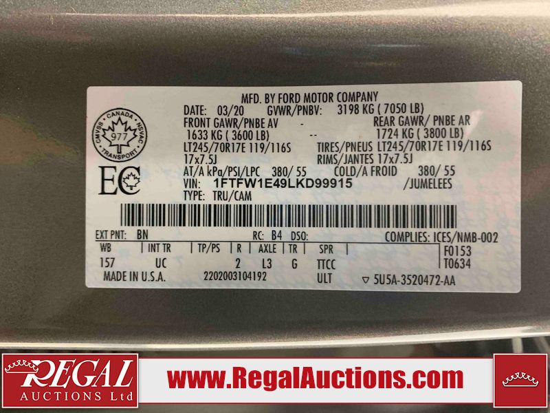 This 2020 FORD F-150 XLT CREW CAB 4WD is powered by a turbocharged 3.5L V6 gasoline engine and an automatic transmission. It is equipped with four-wheel drive. The truck has seats for 5 people. The truck has high mileage for its age. The vehicle has high-value options including power seats and a backup camera. The Tire Pressure light is on The body looks to be in fair condition overall. There are chips on the front bumper, hood, left front fender, left rear fender, and right front fender. There are scratches on the front bumper, left rear fender, right rear fender, right rear door, and right front door. There is dent damage on the tailgate. There are very minor chips in many areas around the body. There are very minor scratches in some areas around the body. The interior looks to be in good condition overall. There are stains on the driver seat. The windshield looks to be in good condition. All of the tires have lots of tread remaining. This truck is being sold by an automotive broker. The vehicle will be sold with the following declarations: Out of Province - SK (See Footnote 1) and Out of Province - AB OVERRIDE (See Footnote 2). Footnotes: 1) The vehicle's last registered jurisdiction is Saskatchewan. The purchaser must have the vehicle undergo and pass an Out of Province inspection before it can be registered in Alberta. 2) Out of province inspection for registering the vehicle in Alberta has been completed. Regal Auctions Ltd. makes no guarantee or warranty, either express or implied, with respect to the data provided in this report. The information has been provided from the consignor and from sources generally believed to be reliable, however the accuracy of this information cannot be guaranteed by Regal Auctions.