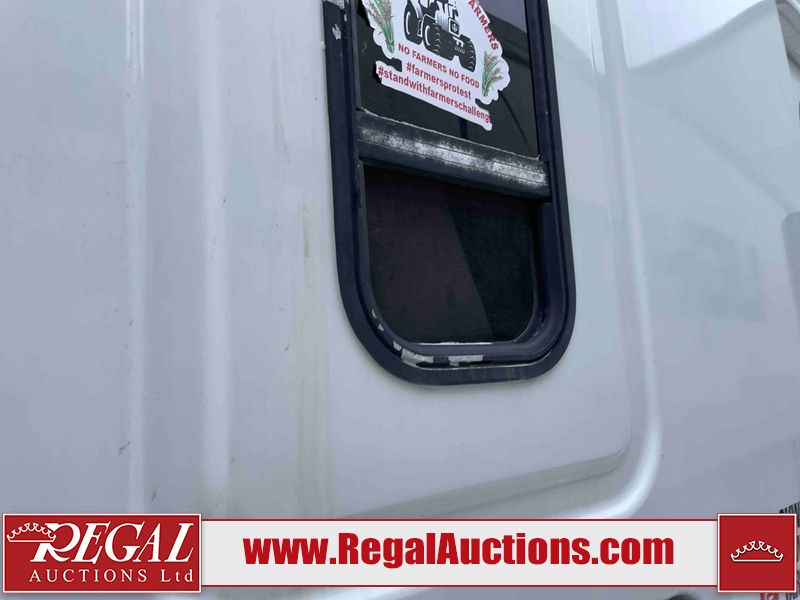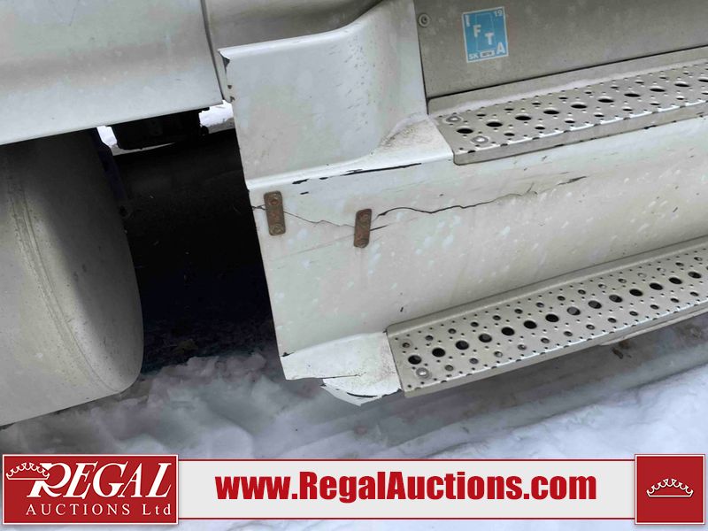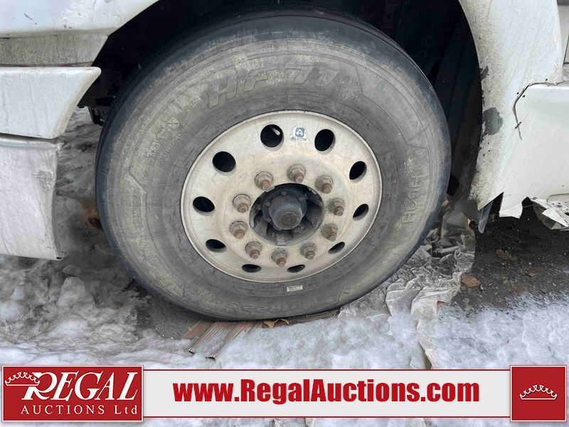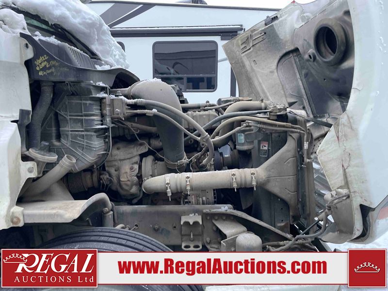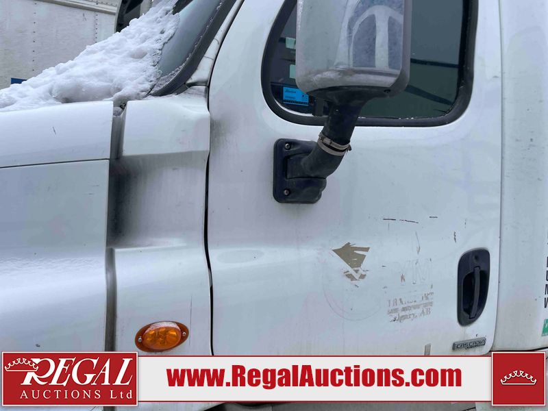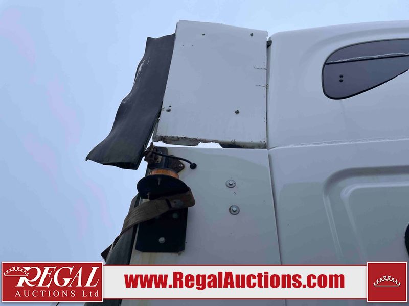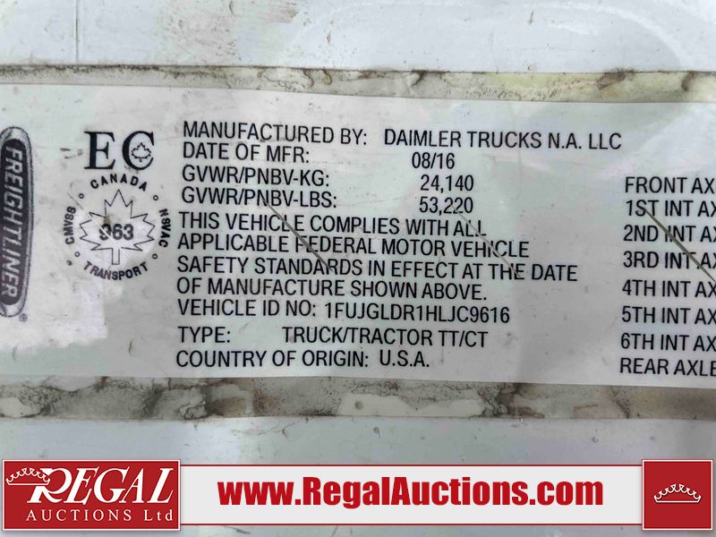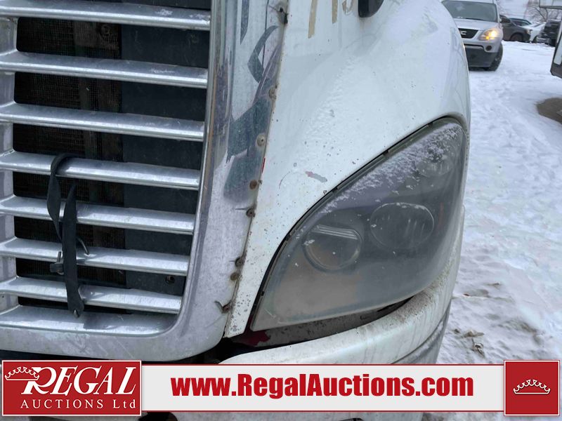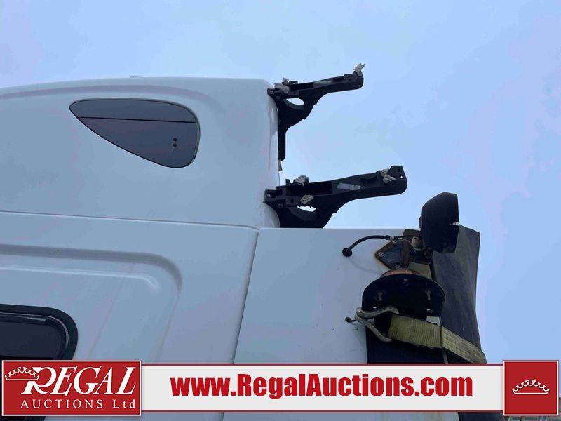 This unit is a 2017 Freightliner Cascadia 125 model tandem axle sleeper highway tractor. The odometer reads kilometers 1,477,910, The engine hours are not accessible. This unit has a GVWR of 53,220 lbs. Its CVIP is 07/2024. The interior is dirty. It is equipped with a microwave, refrigerator, CB radio, and rear climate control. This unit is covered in dust and dirt, not all damages can be determined. The front bumper is gouged and misaligned. The engine cover is chipped and has peeling paint. The windshield is cracked. Both front doors and side cabs are showing scratches and scuffs. Both door mirrors are poorly reattached. The cab side air deflector are broken. The rear of the cab is showing signs of usage. This unit starts and runs with a boost. The engine runs rough and stalls. The exhaust has been removed. The unit is not building air. This engine light is on. This unit is powered by a 14.8 L in-line six cylinder turbo diesel engine and an automatic transmission. The tires are mounted to steel rims, the right rear tire will need to be replaced. There is no emissions sticker. The truck has a 13,220 pound front axle and 40,000 pound rear axles. This unit is equipped with rear locking axles, air suspension, air brakes and ABS.
