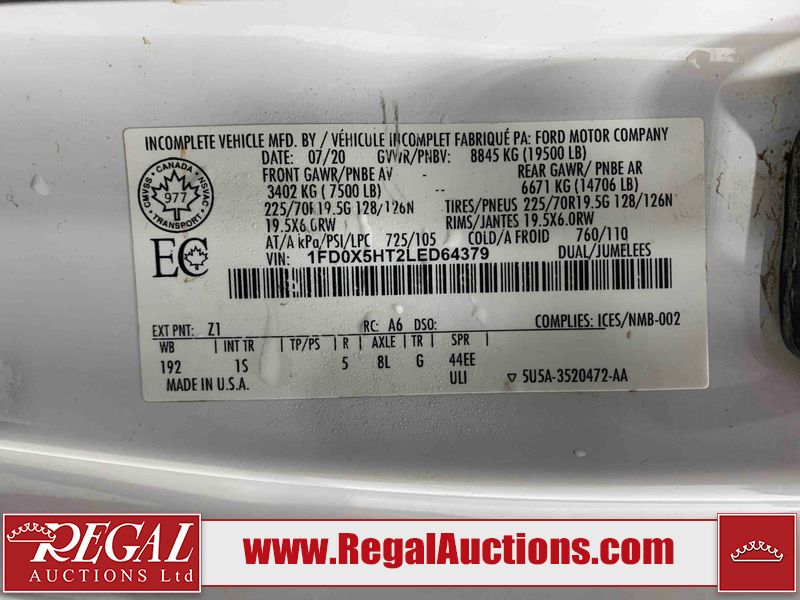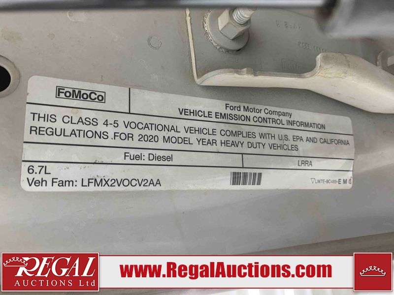 This 2020 FORD F-550 XL SUPERCAB is powered by a 8 cylinder diesel engine and an automatic transmission. It is equipped with four wheel drive. The truck has seats for 3 people. The truck has high mileage for its age. The vehicle has high value options including a backup camera. The Airbag light is on. The body looks to be in good condition overall. There are chips on the front bumper, hood, and right rear door. There is minimal dent damage on the hood and left rear door. There are minimal scratches on the left front fender and rear bumper. There are very minor chips in a few areas around the body. There are very minor scratches in a few areas around the body. There is very minor dent damage on the right front door. The interior looks to be in fair condition overall. The driver's seat is worn. The roofliner is dirty. The windshield is cracked. All of the tires have lots of tread remaining. This truck is being sold by the fleet department of a corporation or government body. The vehicle will be sold with the following declarations: Fleet Vehicle (See Footnote 1) and Claims Total $5000 - $9999 (See Footnote 2). Footnotes: 1) This vehicle is a commercially owned work vehicle. 2) The vehicle's total recorded insurance claims history is between $5,000 - $9,999. This is the amount of money that was paid out by an insurance company for repairs to cover claims against the vehicle's insurance policy. This information is provided by CarFax. Regal Auctions Ltd. makes no guarantee or warranty, either express or implied, with respect to the data provided in this report. The information has been provided from the consignor and from sources generally believed to be reliable, however the accuracy of this information cannot be guaranteed by Regal Auctions.