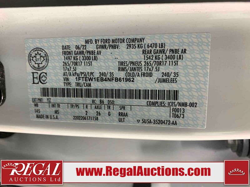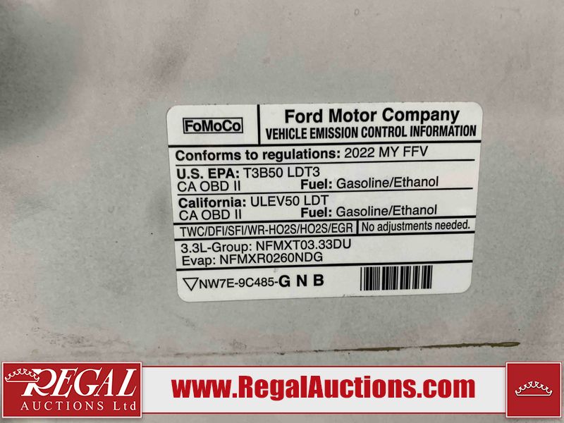 This 2022 FORD F-150 CREW CAB PICKUP 4D is powered by a 3.3L V6 gasoline engine and an automatic transmission. It is equipped with four-wheel drive. The truck has seats for 6 people. The truck has high mileage for its age. The vehicle has high-value options including heated seats. The body looks to be in good condition overall. There are incidental scratches on the left front fender. There are very minor chips in many areas around the body. There are very minor scratches in many areas around the body. The interior looks to be in good condition overall. The windshield is cracked. All of the tires have lots of tread remaining. This truck is being sold by an automotive broker. Regal Auctions Ltd. makes no guarantee or warranty, either express or implied, with respect to the data provided in this report. The information has been provided from the consignor and from sources generally believed to be reliable, however the accuracy of this information cannot be guaranteed by Regal Auctions.