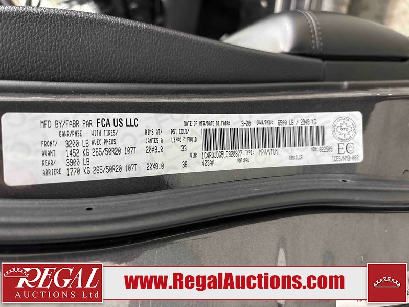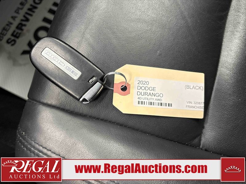 This 2020 DODGE DURANGO GT 4D UTILITY AWD is powered by a 3.6L V6 gasoline engine and an automatic transmission. It is equipped with all-wheel drive. The SUV has seats for 7 people. The mileage is average considering the SUV's age. GT is a very popular trim level. The vehicle has high-value options including a sunroof, leather upholstery, power seats, heated seats, navigation, and a backup camera. The Check Engine and Tire Pressure lights are on. The body looks to be in good condition overall. The right front fender is broken. There are very minor chips in many areas around the body. There are very minor scratches in many areas around the body. There is very minor dent damage on the right front fender. The interior looks to be in good condition overall. The windshield looks to be in good condition. The passenger side rear tire is worn. All of the other tires have lots of tread remaining. This SUV is being sold by a franchise dealership. The vehicle will be sold with the following declarations: Dealership Trade-In (See Footnote 1) and Out of Province - BC (See Footnote 2). Footnotes: 1) This vehicle is being sold on behalf of a franchise dealership. Franchise Dealerships are automotive sales companies who are directly connected to an automotive manufacturer like Ford, Tesla, Honda, BMW, or similar. 2) The vehicle's last registered jurisdiction is British Columbia. The purchaser must have the vehicle undergo and pass an Out of Province inspection before it can be registered in Alberta. Regal Auctions Ltd. makes no guarantee or warranty, either express or implied, with respect to the data provided in this report. The information has been provided from the consignor and from sources generally believed to be reliable, however the accuracy of this information cannot be guaranteed by Regal Auctions.