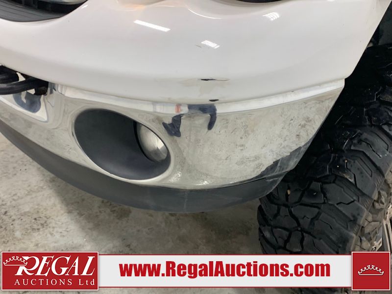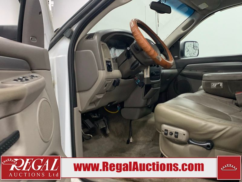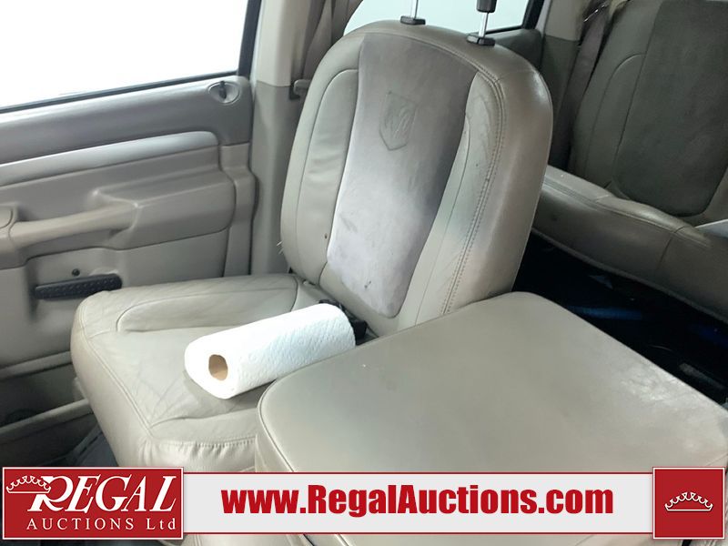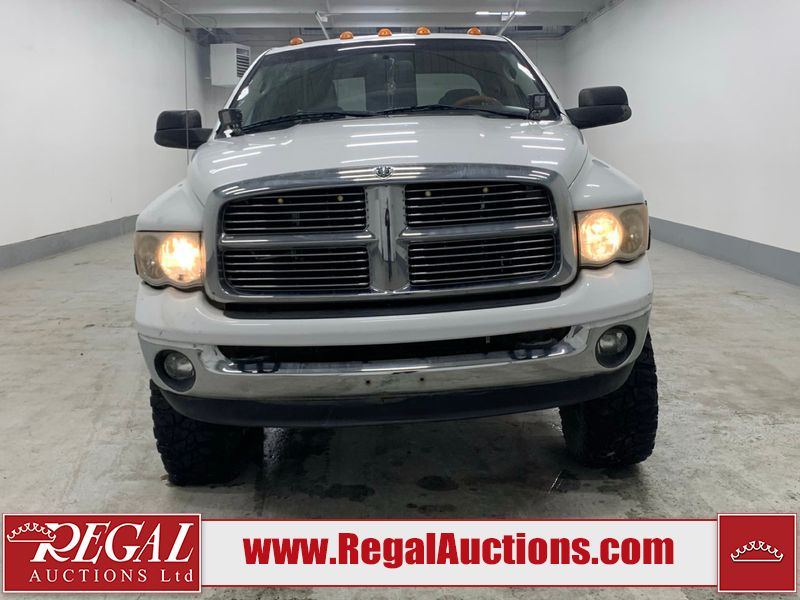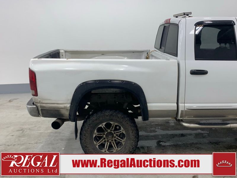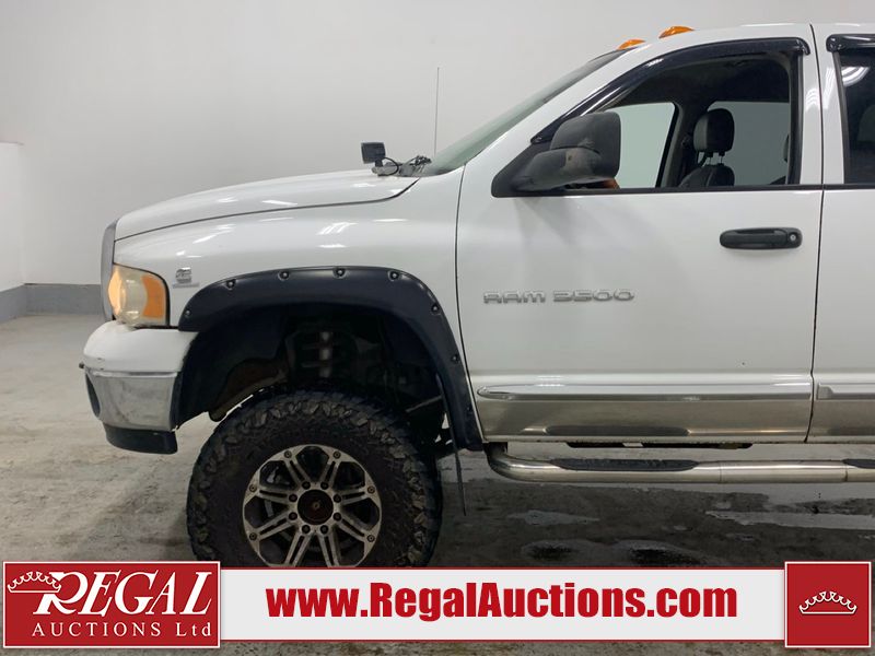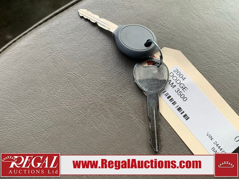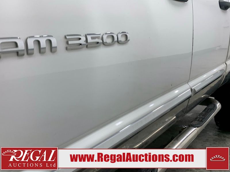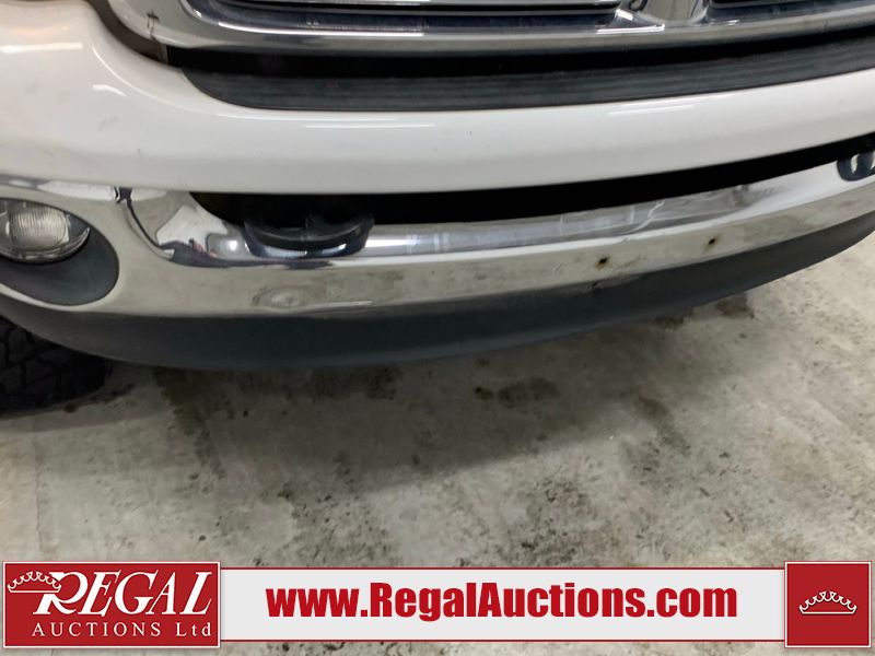 This 2004 DODGE RAM 3500 LARAMIE CREW CAB SWB 4WD 5.9L is powered by a turbocharged 6 cylinder diesel engine and an automatic transmission. It is equipped with four wheel drive. The truck has seats for 5 people. The truck has high mileage for its age. The vehicle has high value options including heated seats. The vehicle has some mechanical problems. The battery is dead. The vehicle requires a boost to start and may require a booster pack in order to stay running. The body looks to be in rough condition overall. There are severe scratches on the front bumper. The tail gate and right rear fender have been repainted poorly. There is some hail on the hood and roof. There is a fair amount of rust on the rear bumper and tail gate. There is some paint peeling on the tail gate. There are incidental chips on the front bumper, grille, left front fender, left front door, left rear door, left rear fender, rear bumper, tail gate, and right rear fender. There is rust on the front bumper, roof, left front door, left rear door, left rear fender, and right rear fender. There is dent damage on the front bumper, left rear fender, rear bumper, tail gate, right front door, and right front fender. There are minimal scratches on the left front fender, left rear fender, right rear fender, right front door, and right front fender. There is incidental paint peeling on the left front fender and left rear fender. There are very minor chips in many areas around the body. There are very minor scratches in many areas around the body. There is very minor dent damage in some areas around the body. The tail lights are broken. The aftermarket side step foot holds are coming off. Aftermarket sidesteps have been installed. An aftermarket infotainment centre has been installed. Aftermarket lights have been installed on the hood. Aftermarket wiring has been ran all through the engine bay and the cab. The truck has had a lift kit installed. The interior looks to be in fair condition overall. The driver's seat, passenger seat, and rear seats are worn. The carpet is dirty. The roofliner is dirty. The windshield is chipped. The passenger side mirror is broken. All of the tires have lots of tread remaining. The right front tire is flat.