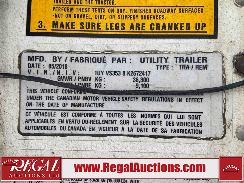This unit is a 2019 53 foot Utility VS3RA Tridem reefer trailer. It is equipped with a Carrier 7300 X4 model refrigeration unit. It’s engine hours are 16,906 hours and 28,609 switch on hours. It’s GVWR is 80,000 pounds. It has a CVIP of 03–2026. The interior walls are showing scratches and scuffs. This unit is equipped with a steel/aluminum combination frame. All walls are showing scratches, scuffs, and dents. The reefer cover is gouged. The reefer unit starts without a boost. The tires are mounted to steal rims and a pair to be in good enough condition for use. This unit is equipped with air suspension, and ABS