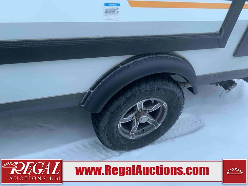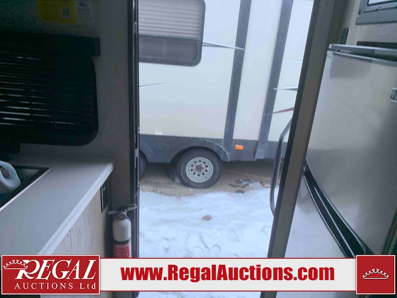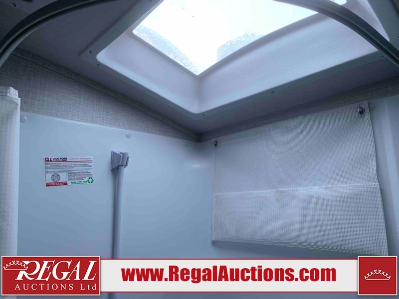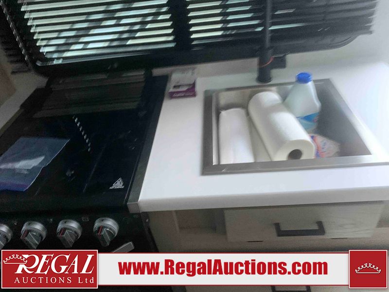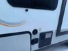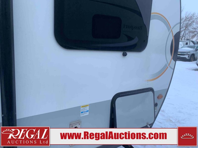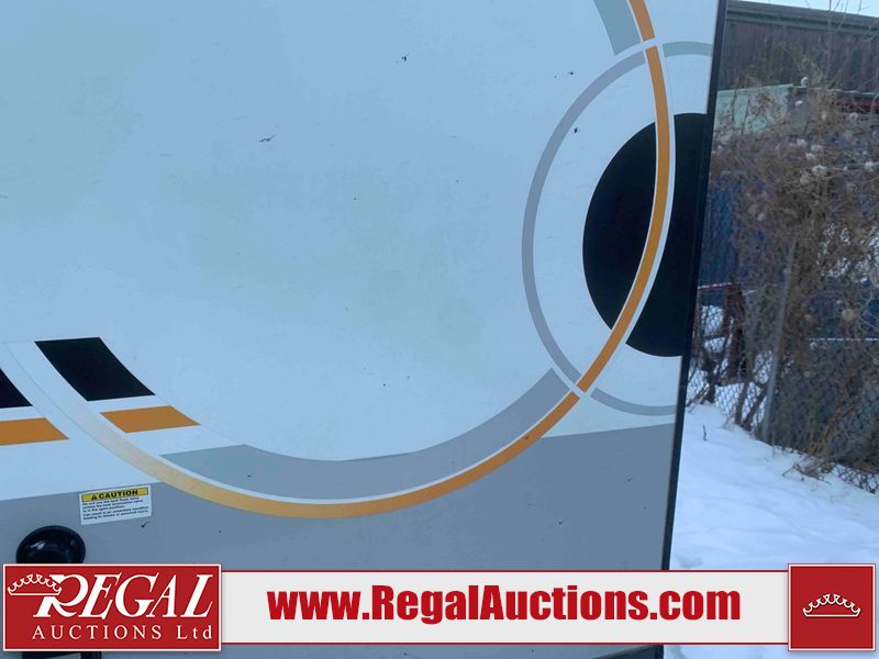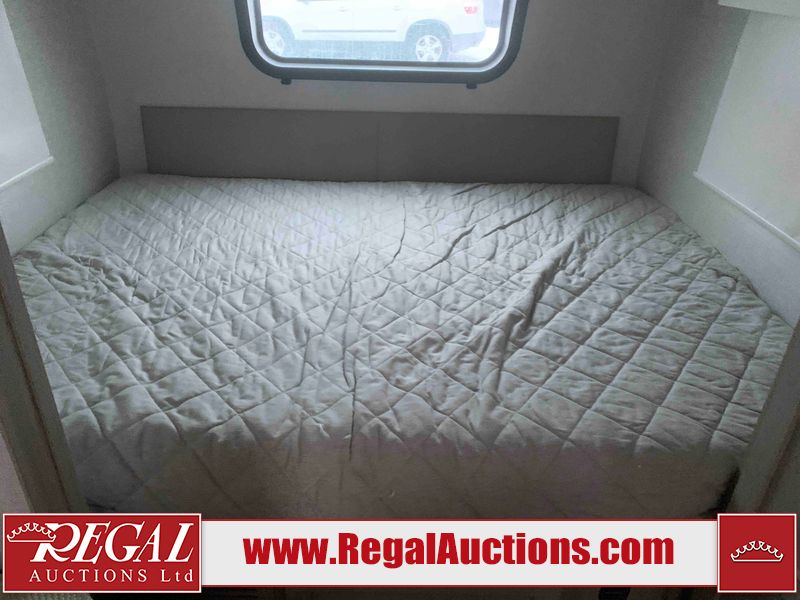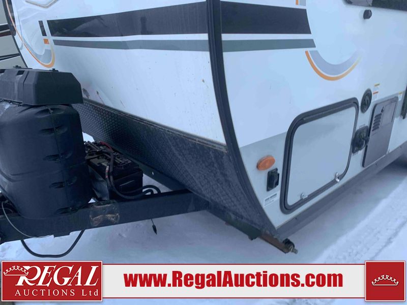 This RV is a Forest River Rockwood G19 FBS Geo pro model bumper pull travel trailer. This unit has a single entry door, roof air, and a single slide out accommodating the living area. The interior is dirty. The exterior walls are made of hardwall fibreglass. Some walls are showing scratches and scuffs. This unit does not get power with external power supply. The batteries may be dead. The slide out cannot be tested. This unit is equipped with two batteries and two propane tanks. Alloy rims are mounted, the tires appear to be in good enough condition for use. This unit is equipped with a three burner stove top, oven, microwave, refrigerator, television, and a stereo system. The layout consist of a bed in the front, kitchenette/living area in the center, and a bathroom in the rear.
