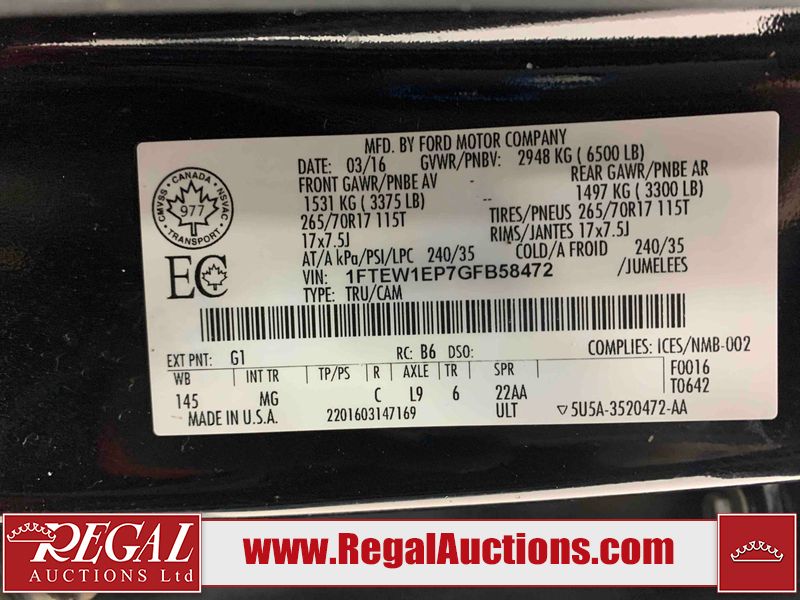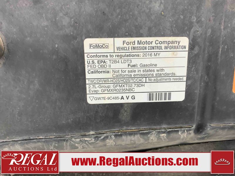 This 2016 FORD F-150 XLT SUPERCREW is powered by a turbocharged 325HP 2.7L 6CYL GAS 6 cylinder gasoline engine and an automatic transmission. It is equipped with four wheel drive. The truck has seats for 5 people. The truck has high mileage for its age. The vehicle has high value options including a backup camera. The body looks to be in fair condition overall. There is a fair amount of dent damage on the front bumper. There are a fair amount of scratches on the pickup bed. There are chips on the front bumper, hood, left front fender, left rear fender, right rear fender, and right front fender. The fascia is broken on the front bumper. There are minor scratches on the hood, left front door, left rear door, left rear fender, right rear fender, right rear door, right front door, and right front fender. There is incidental dent damage on the tail gate and pickup bed. There are very minor chips on the grille. The tail lights are broken. The interior looks to be in fair condition overall. There are some stained on the driver's seat, passenger seat, and rear seats. The windshield is cracked. All of the tires have lots of tread remaining. This truck is being sold by an automotive broker. Regal Auctions Ltd. makes no guarantee or warranty, either express or implied, with respect to the data provided in this report. The information has been provided from the consignor and from sources generally believed to be reliable, however the accuracy of this information cannot be guaranteed by Regal Auctions.