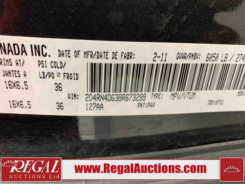 This 2011 DODGE GRAND CARAVAN 4D VAN is powered by a 3.6L V6 gasoline engine and an automatic transmission. The van has seats for 7 people. The van has high mileage for its age. The vehicle has high-value options including power seats. The body looks to be in rough condition overall. There is considerable rust on the left front door, left rear fender, and right rear fender. There are some scratches on the hood, roof, and right rear door. There is noteworthy rust on the left front fender. There is a fair amount of dent damage on the rear door. There are incidental chips on the front bumper and right front fender. There is incidental paint peeling on the hood. There is slight paint overspray on the left front fender and left rear fender. There are minimal scratches on the left front door, left rear door, left rear fender, rear bumper, right rear fender, and right front door. There is dent damage on the rear bumper and right front door. There is rust on the rear door. There are very minor chips in a few areas around the body. There is very minor dent damage on the hood. There are very minor scratches in a few areas around the body. The headlight lenses are hazy. The taillights are broken. The interior looks to be in fair condition overall. The driver's seat and passenger seat are stained. The driver's seat and doors are torn. The carpet is dirty. The windshield is cracked. The passenger side front tire is nearly bald and should be replaced. The driver's side rear tire is worn. The other tires have lots of tread remaining. This van is being sold by a franchise dealership. The vehicle will be sold with the following declarations: Dealership Trade-In (See Footnote 1). Footnotes: 1) This vehicle is being sold on behalf of a franchise dealership. Franchise Dealerships are automotive sales companies who are directly connected to an automotive manufacturer like Ford, Tesla, Honda, BMW, or similar. Regal Auctions Ltd. makes no guarantee or warranty, either express or implied, with respect to the data provided in this report. The information has been provided from the consignor and from sources generally believed to be reliable, however the accuracy of this information cannot be guaranteed by Regal Auctions.