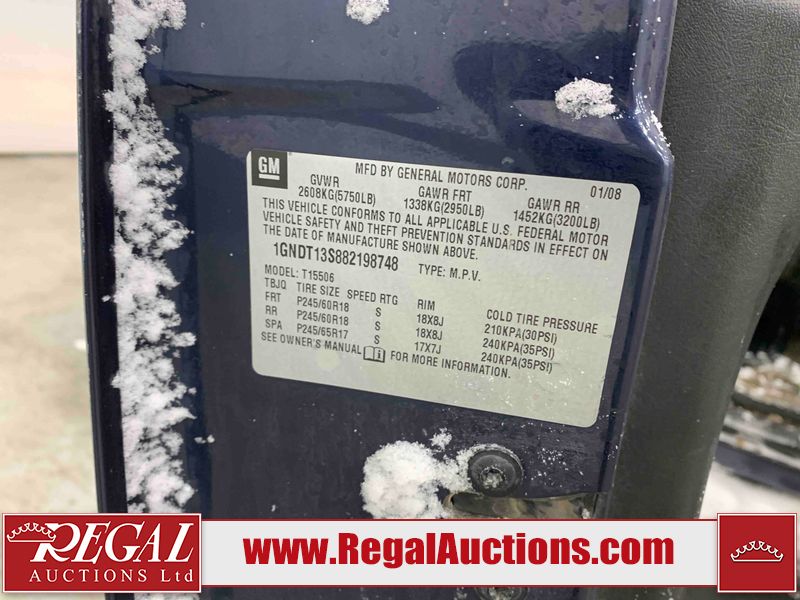 This 2008 CHEVROLET TRAILBLAZER LT 4D UTILITY is powered by a 4.2L 6CYL GAS engine and an automatic transmission. It is equipped with four wheel drive. The SUV has seats for 5 people. The SUV has high mileage for its age. The vehicle has high value options including a sunroof, leather upholstery, power seats, and heated seats. The Tire Pressure light is on. The body looks to be in rough condition overall. There is severe rust on the right rear fender, right rear door, and right front door. There is noteworthy rust on the left rear door. There are slight chips on the front bumper, grille, hood, roof, left front fender, left rear door, left rear fender, rear bumper, right rear fender, right rear door, and right front door. There are scratches on the front bumper, hood, left front fender, left front door, left rear door, left rear fender, rear bumper, rear door, right rear fender, right rear door, and right front door. There is rust on the hood, roof, left rear fender, and right front fender. There is paint peeling on the left rear door, right rear fender, and right front door. There is incidental dent damage on the right front fender. There is very minor dent damage on the hood. There are very minor scratches in a few areas around the body. There are very minor chips in a few areas around the body. The headlight lenses are hazy. The interior looks to be in good condition overall. The windshield looks to be in good condition. All of the tires have lots of tread remaining. This SUV is being sold by an automotive broker. Regal Auctions Ltd. makes no guarantee or warranty, either express or implied, with respect to the data provided in this report. The information has been provided from the consignor and from sources generally believed to be reliable, however the accuracy of this information cannot be guaranteed by Regal Auctions.