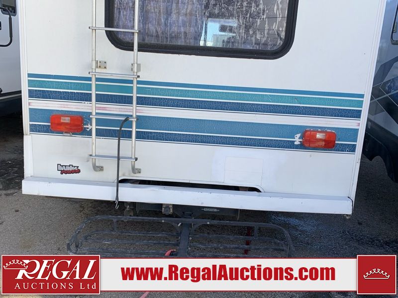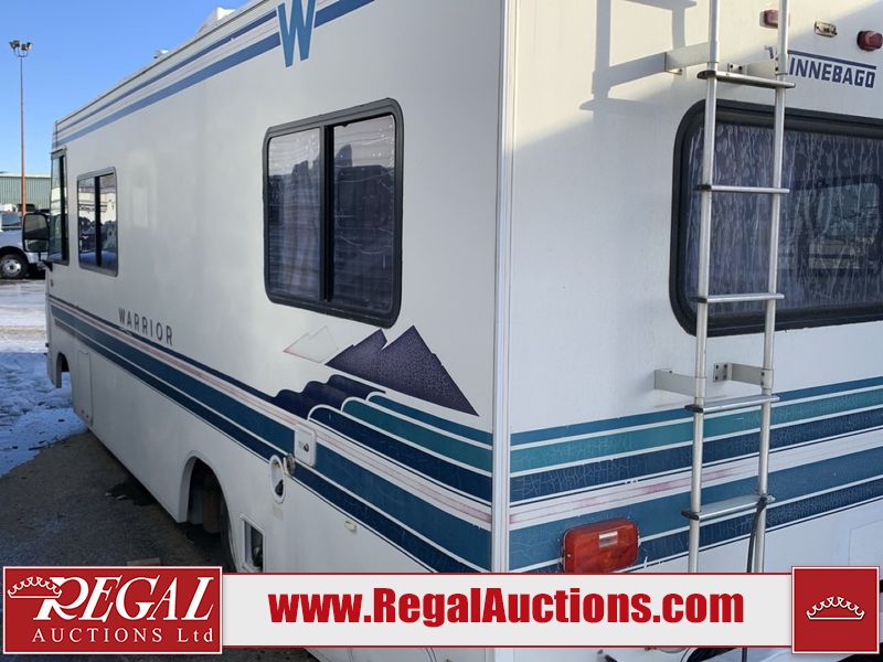 This class C motorhome is a 1995 Winnebago warrior WCD 25RU model coach on a Chevrolet P30 chassis. The odometer read 69,101 miles. This unit has a single entry door and roof air. It also has a front air conditioning system and a stereo system. The interior is dirty, full of personal items and garbage. Due to the amount of garbage not all interior damages can be determined. The interior has been poorly remodeled. The floors have gaps. There is peeling paint all around. The carpet has cuts and stains. Both seats are worn. The roof has cracks and water damage. Some of the cabinet glass is cracked. The stove top is damaged. The exterior walls are made of hardware fiberglass. The fibreglass has cracks. Both side panels have water elimination. The right rear corner is cracked and has been poorly repaired. The water heater cover is missing. Most decals are cracked. Aftermarket have been installed, the factory drill holes have been poorly repaired. The vents are broken. The marker lights are broken. The windshield is cracked. The key to open the generator compartment and other side compartments does not work. The engine starts at runs without a boost. The unit is powered by a 7.4 L eight cylinder, GM engine and an automatic transmission. This unit is equipped with a generator. The Hobbs metre reads 816 hours. Steel rims are mounted with aluminum hubcaps, the tires appear to be in good enough condition for use. This unit is equipped with a two burner stove, top, microwave and a refrigerator. The layout consists of a living area/dining out at the front and a master bedroom at the rear.