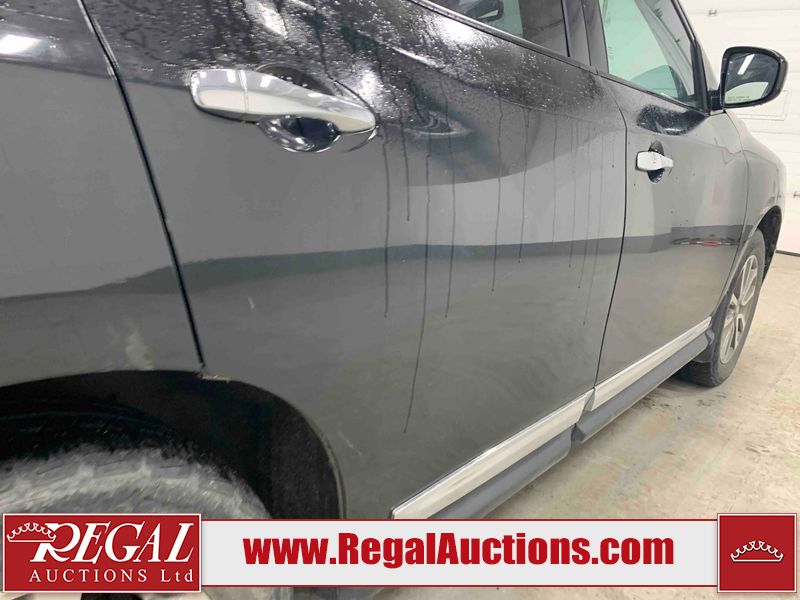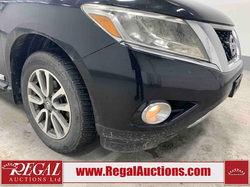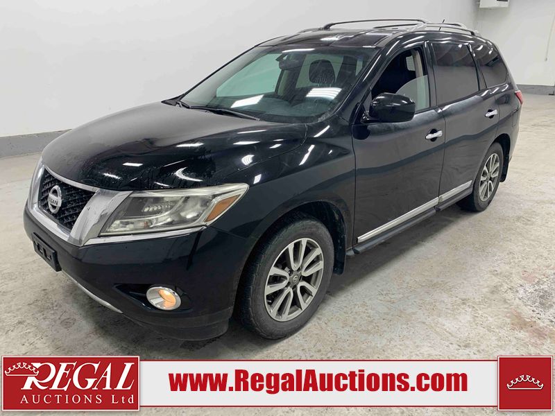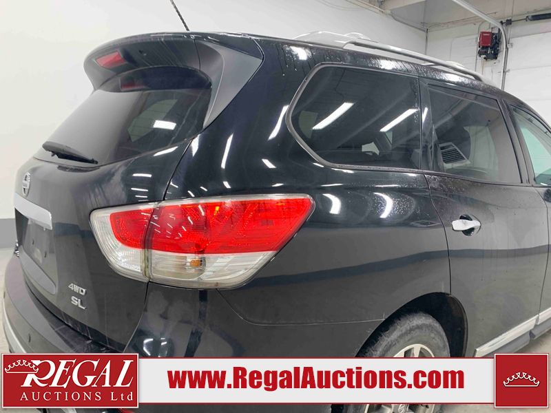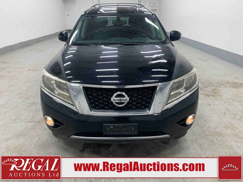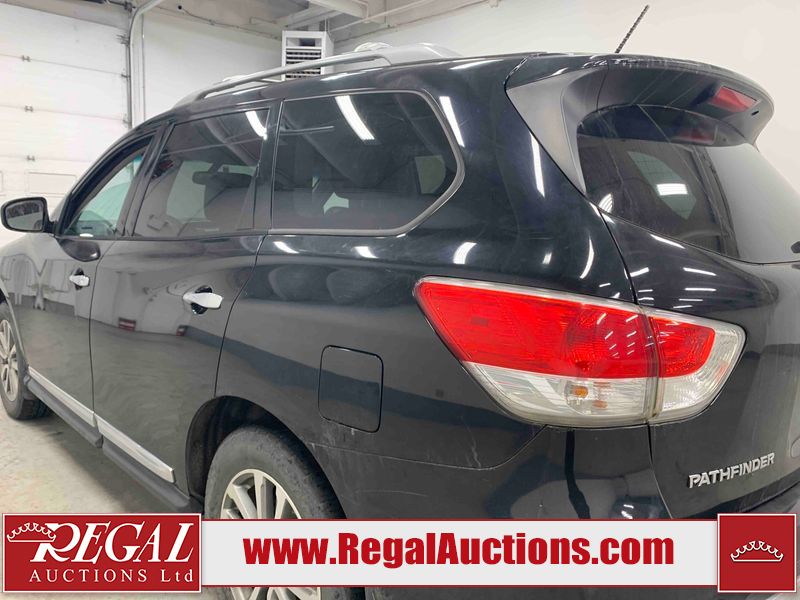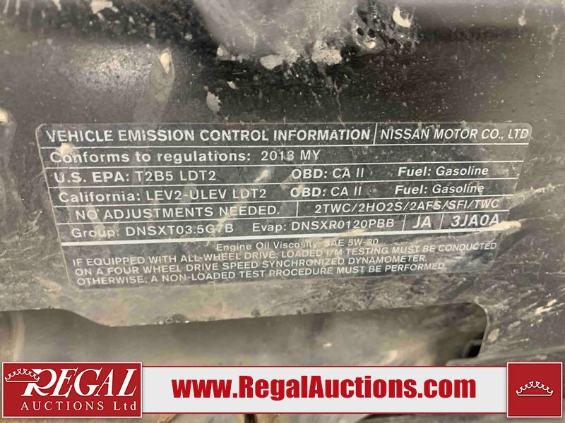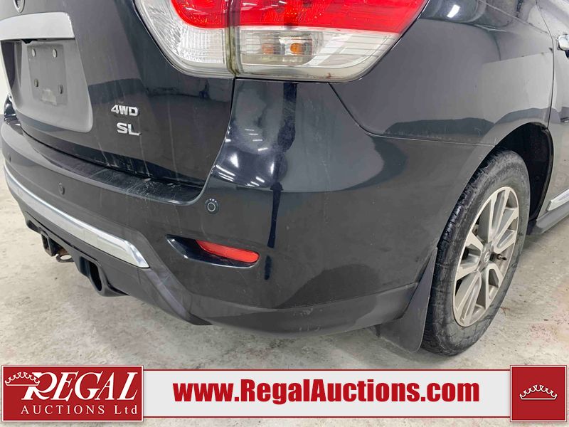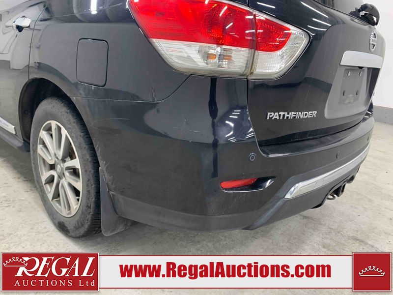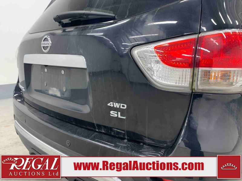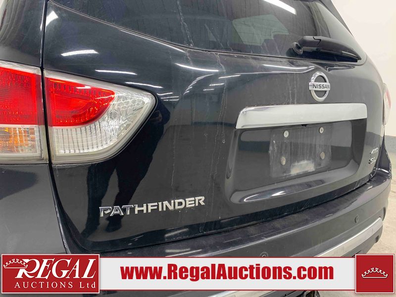 This 2013 NISSAN PATHFINDER SL 4D UTILITY 4WD is powered by a 3.5L V6 gasoline engine and an automatic transmission. It is equipped with four-wheel drive. The SUV has seats for 5 people. The mileage is average considering the SUV's age. The vehicle has high-value options including leather upholstery, power seats, heated seats, a backup camera, and a power liftgate. The Stability Control light is on. The body looks to be in fair condition overall. There are chips on the front bumper, grille, hood, roof, and rear bumper. There are slight scratches on the front bumper, hood, roof, left front fender, left front door, left rear door, left rear fender, rear bumper, rear door, right rear fender, right rear door, right front door, and right front fender. There is slight dent damage on the right front door. There are very minor chips in many areas around the body. The interior looks to be in good condition overall. The driver's seat, passenger seat, rear seats, and doors are dirty. The carpet is dirty. The windshield looks to be in good condition. The tires are all worn. This SUV is being sold by an automotive broker. The vehicle will be sold with the following declarations: Out of Province - BC (See Footnote 1). Footnotes: 1) The vehicle's last registered jurisdiction is British Columbia. The purchaser must have the vehicle undergo and pass an Out of Province inspection before it can be registered in Alberta. Regal Auctions Ltd. makes no guarantee or warranty, either express or implied, with respect to the data provided in this report. The information has been provided from the consignor and from sources generally believed to be reliable, however the accuracy of this information cannot be guaranteed by Regal Auctions.