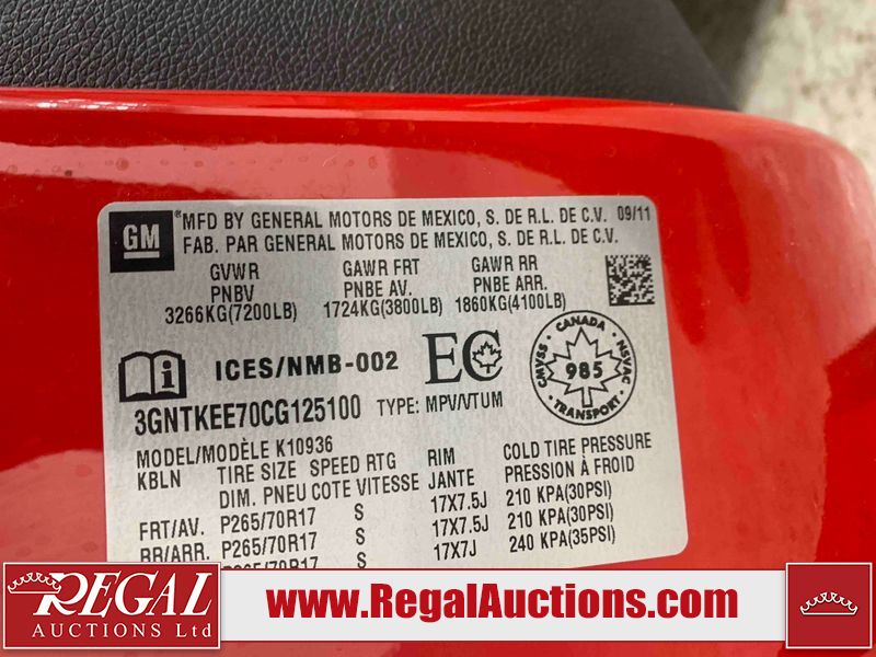 This 2012 CHEVROLET AVALANCHE 4D UTILITY 4WD is powered by a 5.3L V8 cylinder gasoline engine and an automatic transmission. It is equipped with four-wheel drive. The SUV has seats for 5 people. The SUV has low mileage for its age. The vehicle has high-value options including a sunroof and power seats. The Tire Pressure light is on. The body looks to be in fair condition overall. There is conspicuous paint overspray on the left rear fender. There are minor scratches on the front bumper, hood, roof, left front fender, left front door, left rear door, and right rear fender. There is paint peeling on the front bumper. There are slight chips on the hood and roof. There is incidental rust on the roof and left rear fender. There are very minor chips in many areas around the body. There are very minor scratches in many areas around the body. The interior looks to be in good condition overall. The windshield looks to be in good condition. All of the tires have lots of tread remaining. This SUV is being sold by an automotive broker. Regal Auctions Ltd. makes no guarantee or warranty, either express or implied, with respect to the data provided in this report. The information has been provided from the consignor and from sources generally believed to be reliable, however the accuracy of this information cannot be guaranteed by Regal Auctions.
