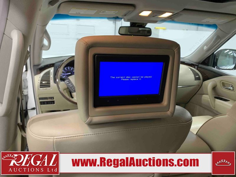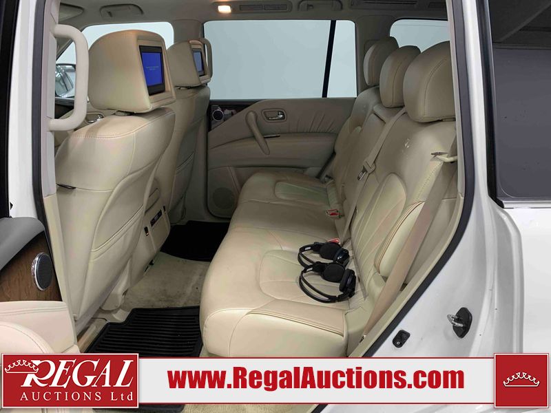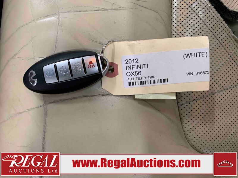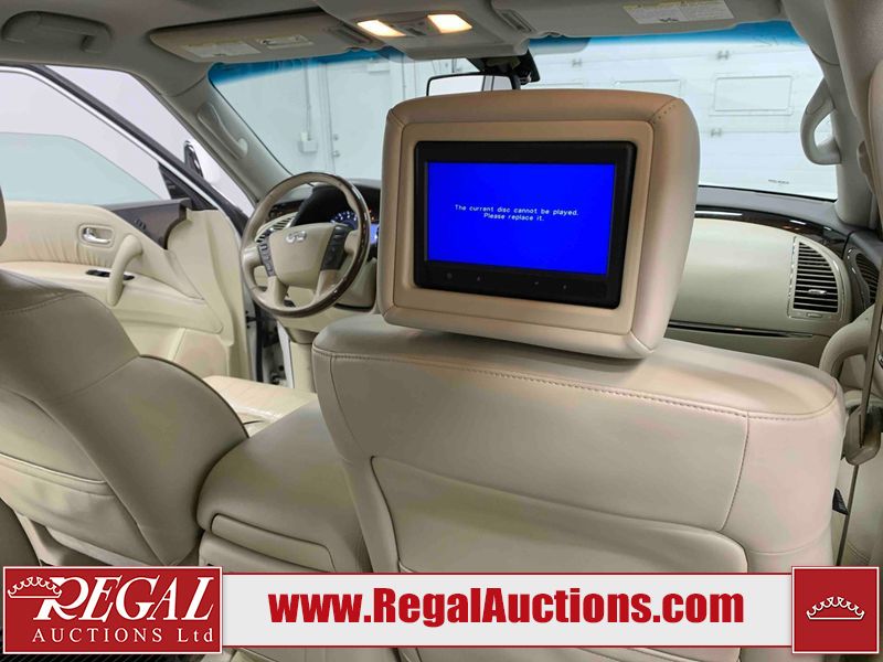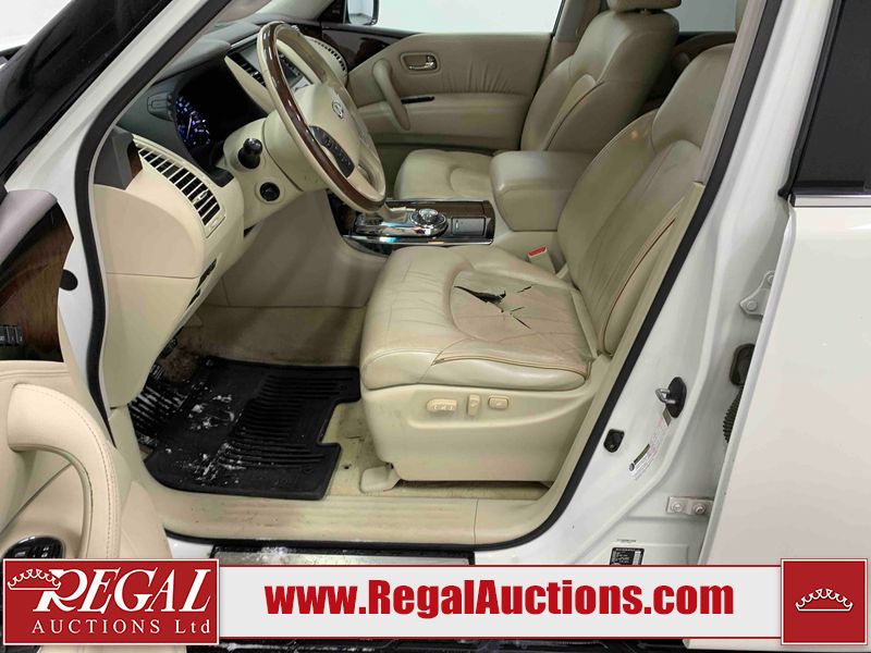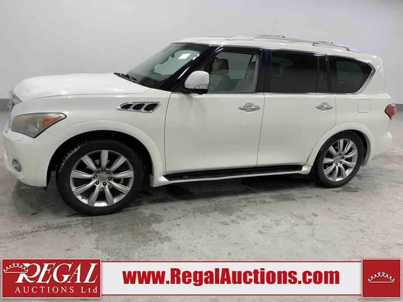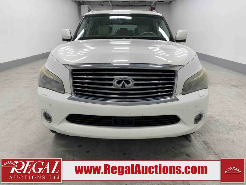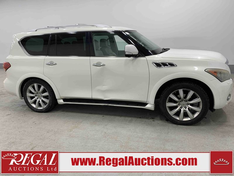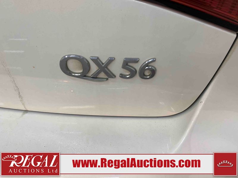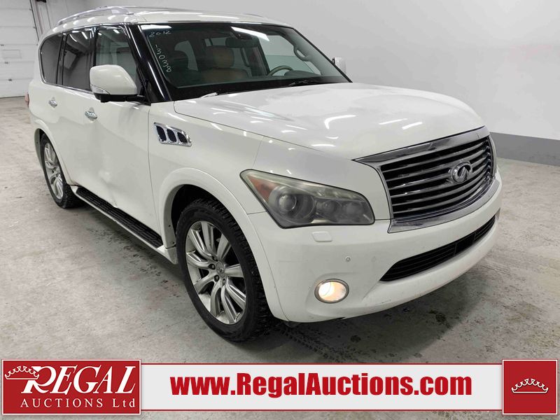 This 2012 INFINITI QX56 4D UTILITY 4WD is powered by a 5.6L 8 cylinder gasoline engine and an automatic transmission. It is equipped with four wheel drive. The SUV has seats for 7 people. The mileage is average considering the SUV's age. The vehicle has high value options including a sunroof, leather upholstery, power seats, heated seats, navigation, and a backup camera. The body looks to be in fair condition overall. There is extensive dent damage on the right front door. The front bumper and grille are cracked. There is noteworthy rust on the left rear fender. There are minimal chips on the front bumper and hood. There are scratches on the front bumper, rear bumper, and right rear fender. There is paint peeling on the roof. There is rust on the left rear door. There are very minor chips in many areas around the body. There are very minor scratches in some areas around the body. The headlight lenses are hazy. The interior looks to be in good condition overall. The driver's seat is torn. The windshield looks to be in good condition. All of the tires have lots of tread remaining. This SUV is being sold by an automotive broker. Regal Auctions Ltd. makes no guarantee or warranty, either express or implied, with respect to the data provided in this report. The information has been provided from the consignor and from sources generally believed to be reliable, however the accuracy of this information cannot be guaranteed by Regal Auctions.
