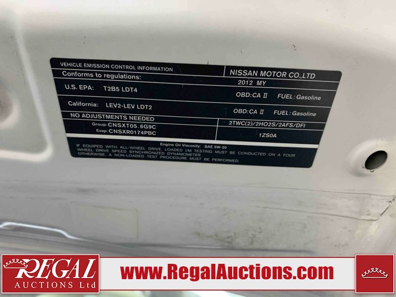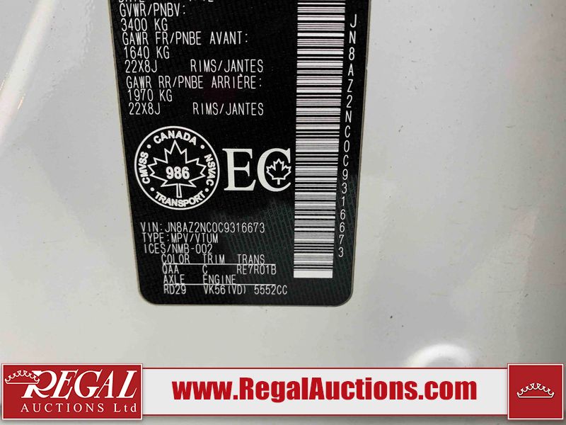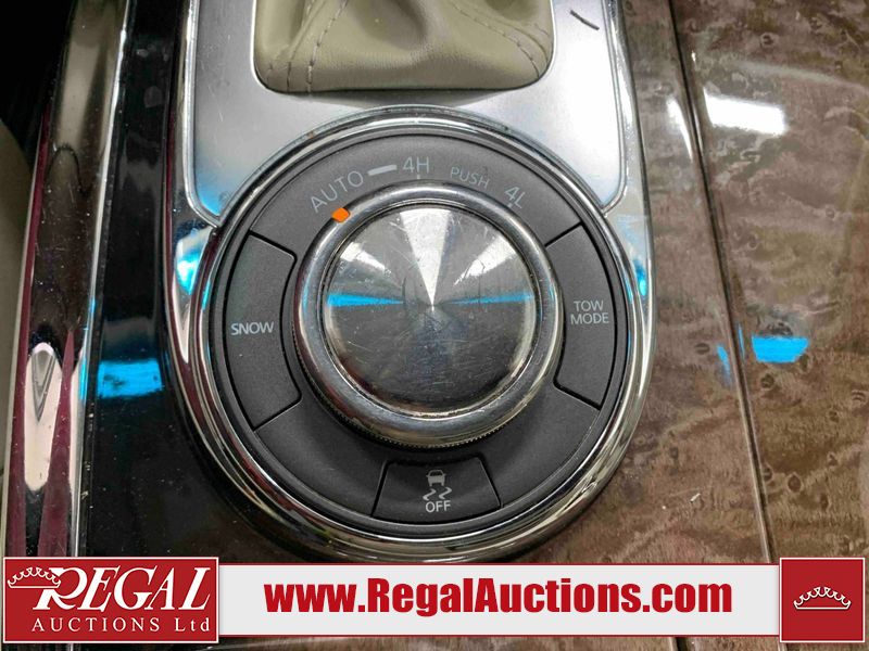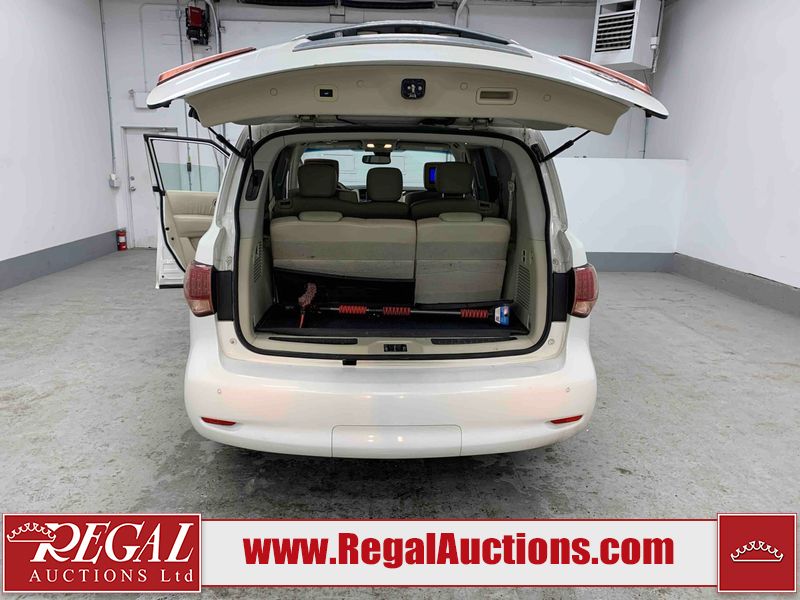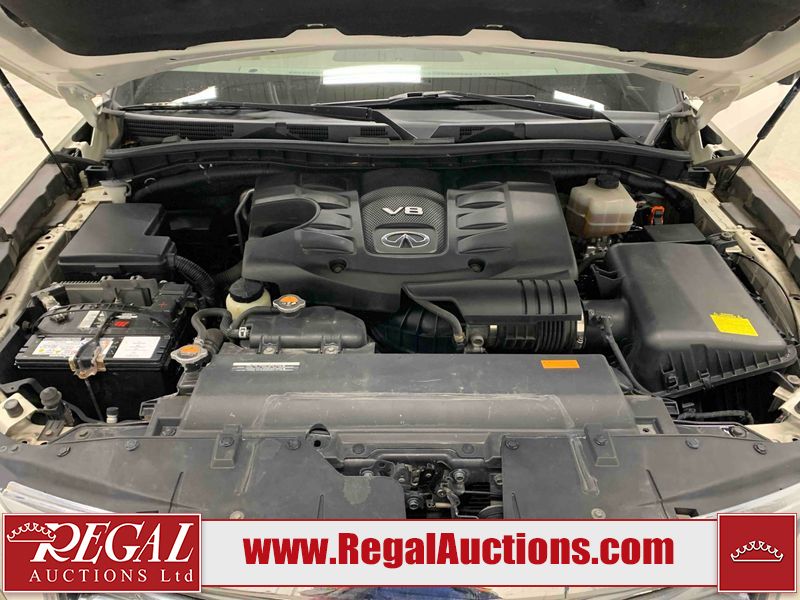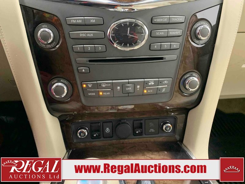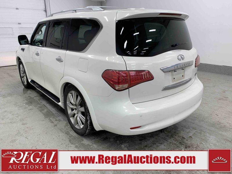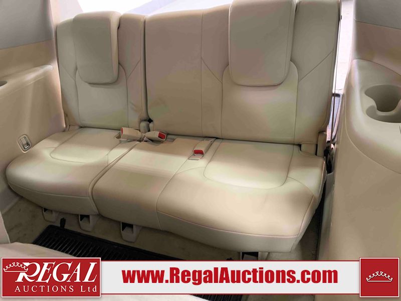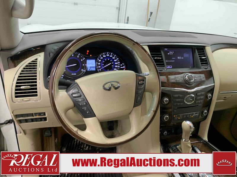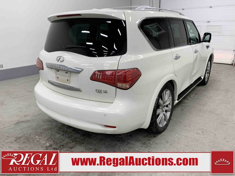 This 2012 INFINITI QX56 4D UTILITY 4WD is powered by a 5.6L 8 cylinder gasoline engine and an automatic transmission. It is equipped with four wheel drive. The SUV has seats for 7 people. The mileage is average considering the SUV's age. The vehicle has high value options including a sunroof, leather upholstery, power seats, heated seats, navigation, and a backup camera. The body looks to be in fair condition overall. There is extensive dent damage on the right front door. The front bumper and grille are cracked. There is noteworthy rust on the left rear fender. There are minimal chips on the front bumper and hood. There are scratches on the front bumper, rear bumper, and right rear fender. There is paint peeling on the roof. There is rust on the left rear door. There are very minor chips in many areas around the body. There are very minor scratches in some areas around the body. The headlight lenses are hazy. The interior looks to be in good condition overall. The driver's seat is torn. The windshield looks to be in good condition. All of the tires have lots of tread remaining. This SUV is being sold by an automotive broker. Regal Auctions Ltd. makes no guarantee or warranty, either express or implied, with respect to the data provided in this report. The information has been provided from the consignor and from sources generally believed to be reliable, however the accuracy of this information cannot be guaranteed by Regal Auctions.
