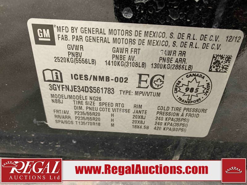 This 2013 CADILLAC SRX 4D UTILITY AWD is powered by a 3.6L V6 gasoline engine and an automatic transmission. It is equipped with all-wheel drive. The SUV has seats for 5 people. The mileage is average considering the SUV's age. The vehicle has high-value options including leather upholstery, power seats, heated seats, navigation, and a backup camera. The body looks to be in fair condition overall. There is noteworthy hail on the left rear fender and right rear fender. There are minimal scratches on the hood, roof, left front fender, left rear door, left rear fender, rear bumper, rear door, right rear fender, right rear door, right front door, and right front fender. There are minor chips on the rear bumper. There are very minor chips in many areas around the body. There are very minor scratches in a few areas around the body. The interior looks to be in good condition overall. The driver's seat is worn. The passenger seat and rear seats are dirty. The windshield is chipped. All of the tires have lots of tread remaining. This SUV is being sold by an automotive broker. The vehicle will be sold with the following declarations: Claims Total $15,000 - $19,999 (See Footnote 1), Out of Province - BC (See Footnote 2), and Out of Province - AB OVERRIDE (See Footnote 3). Footnotes: 1) The vehicle's total recorded insurance claims history is between $15,000 - $19,999. This is the amount of money that was paid out by an insurance company for repairs to cover claims against the vehicle's insurance policy. This information is provided by CarFax. 2) The vehicle's last registered jurisdiction is British Columbia. The purchaser must have the vehicle undergo and pass an Out of Province inspection before it can be registered in Alberta. 3) Out of province inspection for registering the vehicle in Alberta has been completed. Regal Auctions Ltd. makes no guarantee or warranty, either express or implied, with respect to the data provided in this report. The information has been provided from the consignor and from sources generally believed to be reliable, however the accuracy of this information cannot be guaranteed by Regal Auctions.