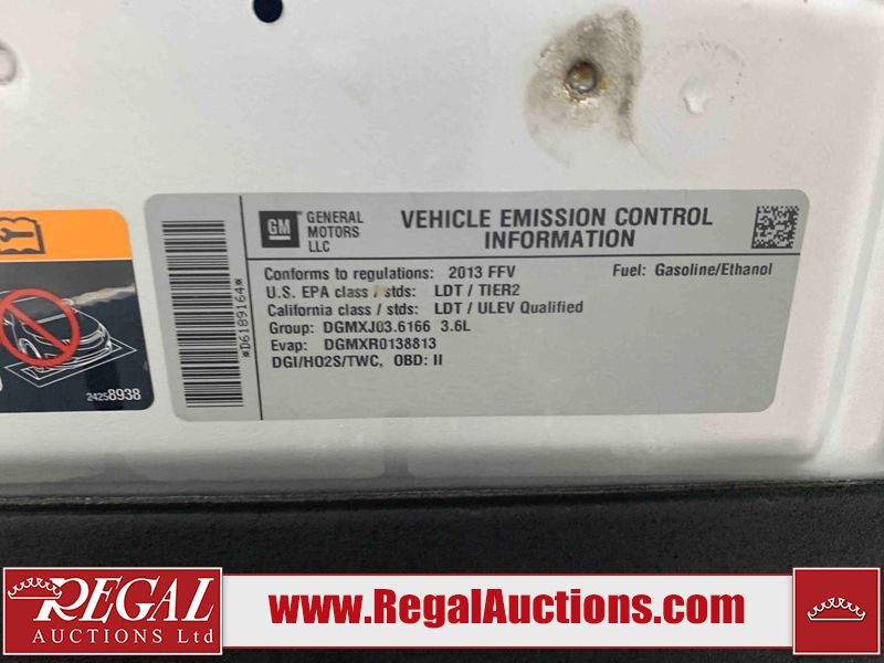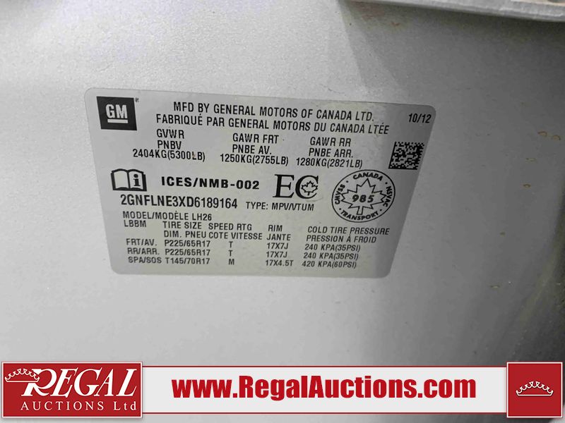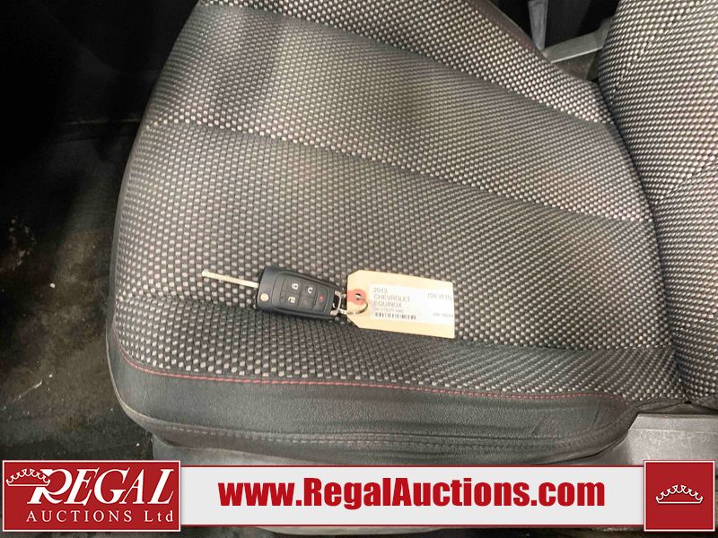 This 2013 CHEVROLET EQUINOX 4D UTILITY AWD is powered by a 3.6L V6 gasoline engine and an automatic transmission. It is equipped with all-wheel drive. The SUV has seats for 5 people. The SUV has low mileage for its age. The vehicle has high-value options including power seats, heated seats, and a backup camera. The body looks to be in fair condition overall. There are chips on the front bumper, hood, and rear bumper. There are scratches on the front bumper, hood, roof, and rear bumper. There is slight rust on the rear door. There are very minor chips in many areas around the body. There are very minor scratches in many areas around the body. The interior looks to be in good condition overall. The dashboard is dirty. The windshield looks to be in good condition. All of the tires have lots of tread remaining. This SUV is being sold by an automotive broker. The vehicle will be sold with the following declarations: Out of Province - BC (See Footnote 1). Footnotes: 1) The vehicle's last registered jurisdiction is British Columbia. The purchaser must have the vehicle undergo and pass an Out of Province inspection before it can be registered in Alberta. Regal Auctions Ltd. makes no guarantee or warranty, either express or implied, with respect to the data provided in this report. The information has been provided from the consignor and from sources generally believed to be reliable, however the accuracy of this information cannot be guaranteed by Regal Auctions.