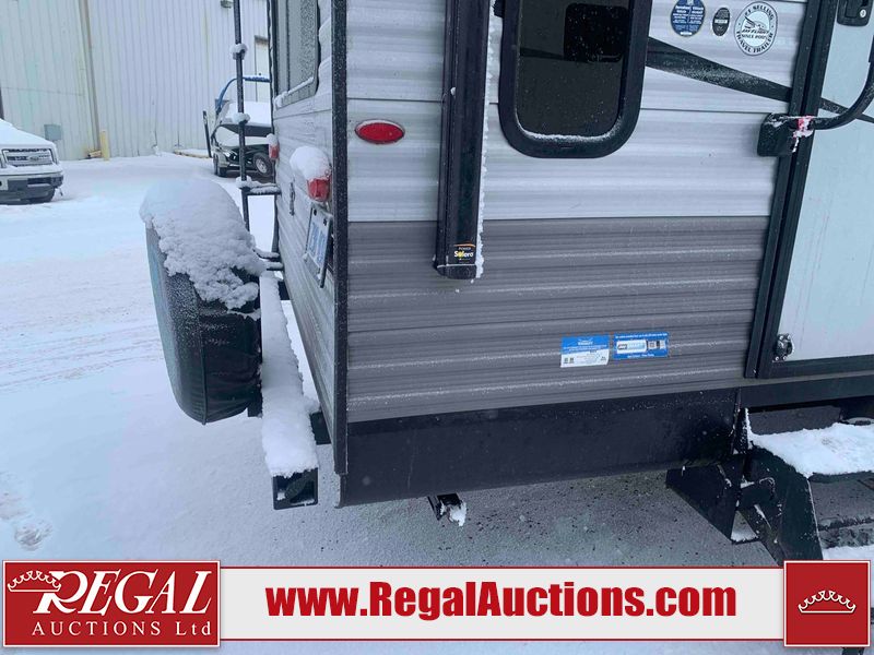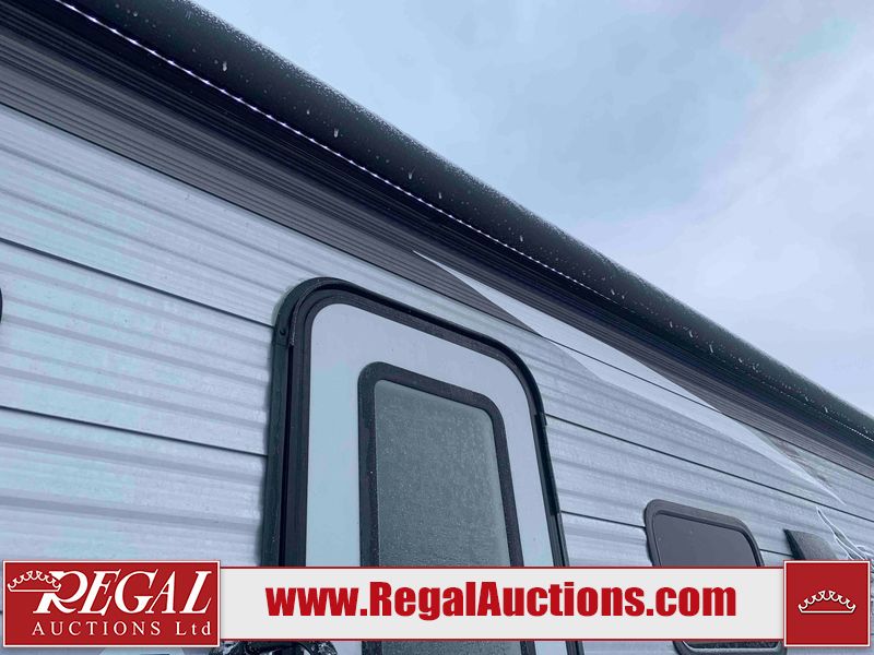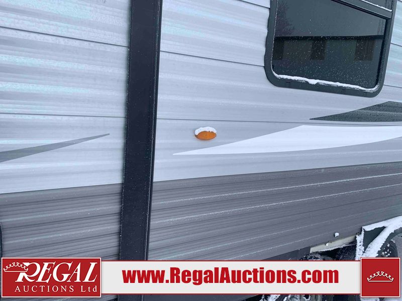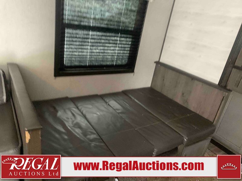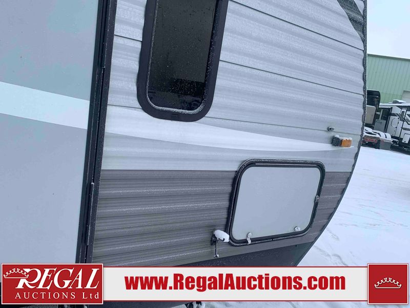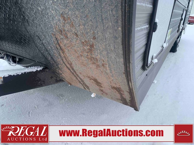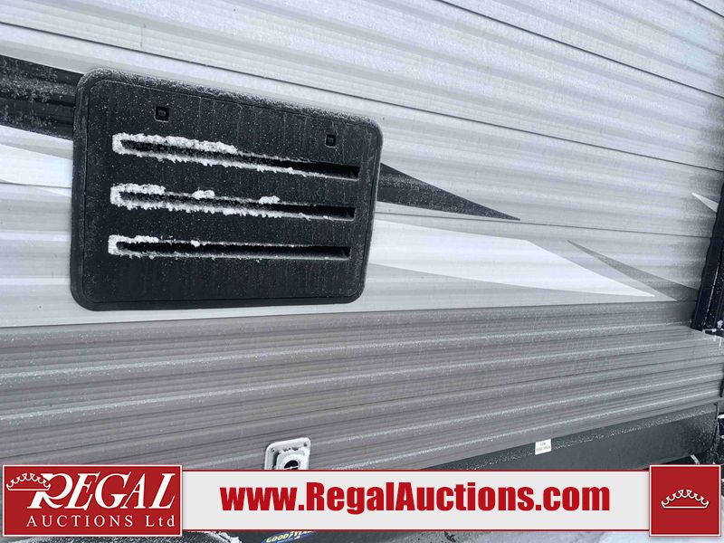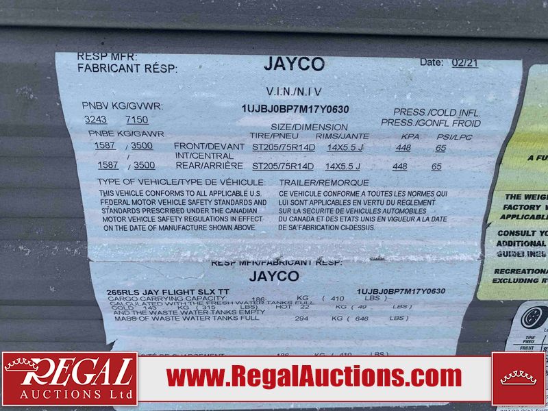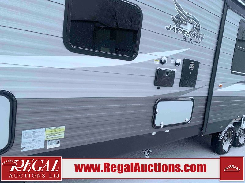 This RV is a 2021 Jayco Jay Flight 265RLS model tandem axle bumper pull trailer. it has a double door entry, roof air, and a single slide out accommodating the living area. The interior is dirty. Some walls are showing scratches and scuffs. The bed is worn. The trim panel has peeling paint. The kitchen at counter is peeling. The exterior walls are made of soft wall aluminum. Some walls are showing scratches and scuffs. The front wall has peeling paint. The left fender is broken. The left rear wall appears to have been hit and is damaged. This unit is with a battery, and two propane tanks. The tires are mounted to alloy rims and appear to be in good enough condition for use. The unit is equipped with a television, stereo system, refrigerator, microwave, oven, and a three burner stove top. The layout consist of a master bedroom/bathroom in the front, kitchenette/dinette in the center, and a living area in the rear.