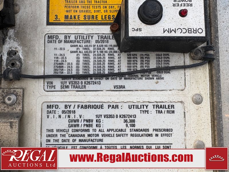 This unit is a 53ft 2019 Utility VS3RA model tridem axle reefer trailer with a Carrier 7300X4 model refrigeration unit. The engine hours show 16,904 hours and 29,446 switch on hours. The CVIP expiry is 07/2026. The interior of this unit is equipped with ducted floors and air chutes. The interior walls and floor have scratches and scuffs. The inner door paneling has minor scuffs but is otherwise in good condition. This unit is equipped with a steel/aluminum composite frame. The exterior walls have scrapes and scuffs. Both sidewalls have minor scratches and scuffs. The reefer compartment latch is operational. The lower crash bar is slightly bent on both sides. The unit starts and runs without a boost. The tires appear to be in acceptable condition for use. This unit is equipped with alloy rims, air brakes, and ABS.