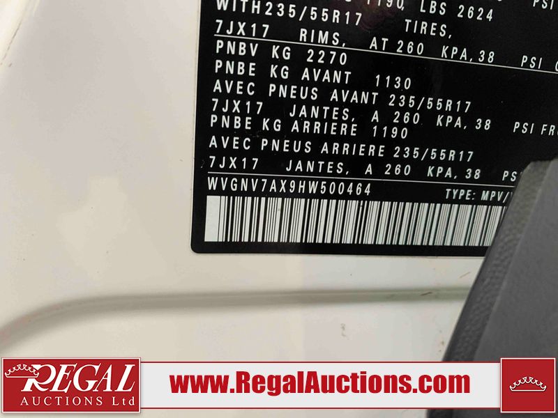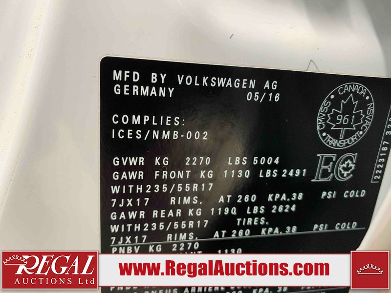This 2017 VOLKSWAGEN TIGUAN 4D UTILITY is powered by a turbocharged 2.0L 4-cylinder gasoline engine and an automatic transmission. It is equipped with all-wheel drive. The SUV has seats for 5 people. The SUV has low mileage for its age. The vehicle has high-value options including leather upholstery, power seats, heated seats, and a backup camera. The body looks to be in good condition overall. There are slight chips on the front bumper and hood. There are minor scratches on the rear bumper. There is minimal dent damage on the rear bumper and rear door. There are very minor chips in many areas around the body. There are very minor scratches in many areas around the body. The interior looks to be in good condition overall. The windshield looks to be in good condition. All of the tires have lots of tread remaining. This SUV is being sold by an automotive broker. The vehicle will be sold with the following declarations: Out of Province - BC (See Footnote 1) and Out of Province - AB OVERRIDE (See Footnote 2). Footnotes: 1) The vehicle's last registered jurisdiction is British Columbia. The purchaser must have the vehicle undergo and pass an Out of Province inspection before it can be registered in Alberta. 2) Out of province inspection for registering the vehicle in Alberta has been completed. Regal Auctions Ltd. makes no guarantee or warranty, either express or implied, with respect to the data provided in this report. The information has been provided from the consignor and from sources generally believed to be reliable, however the accuracy of this information cannot be guaranteed by Regal Auctions.