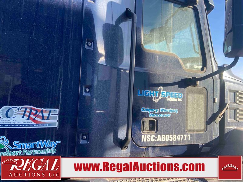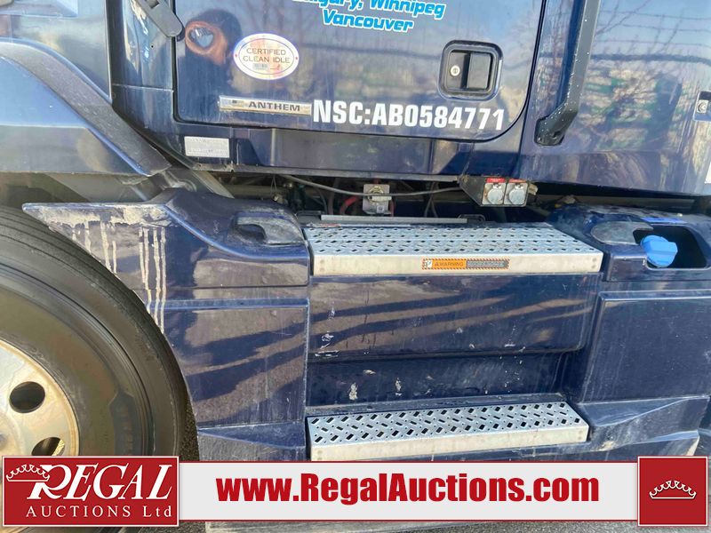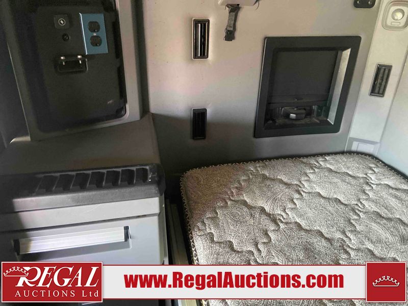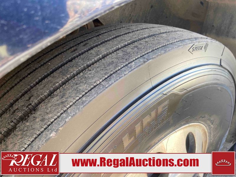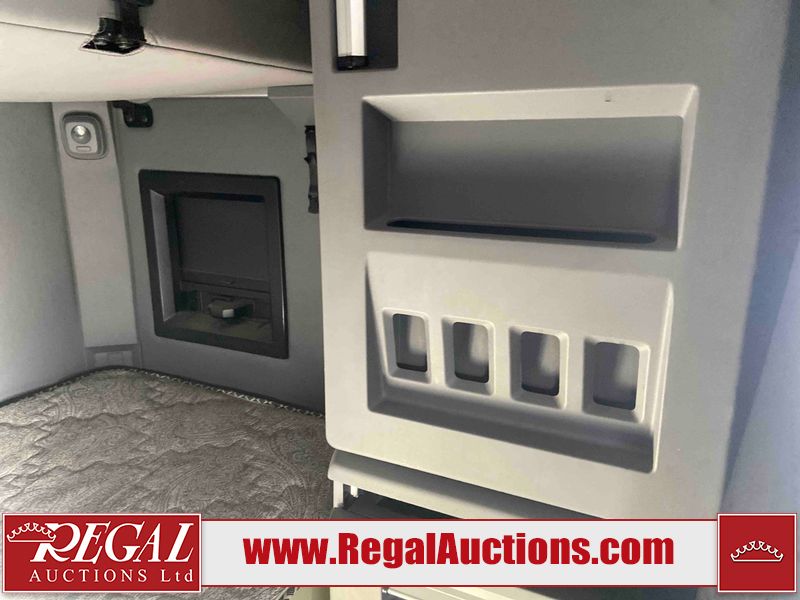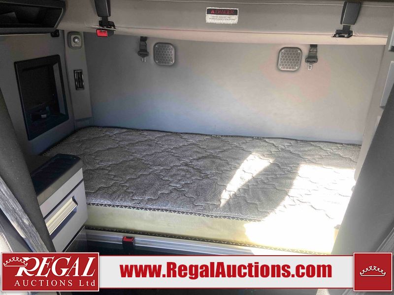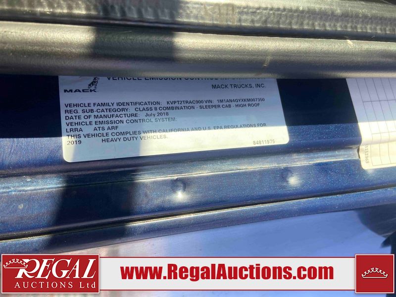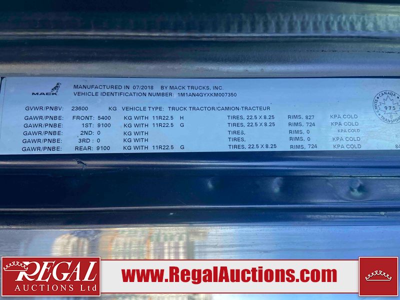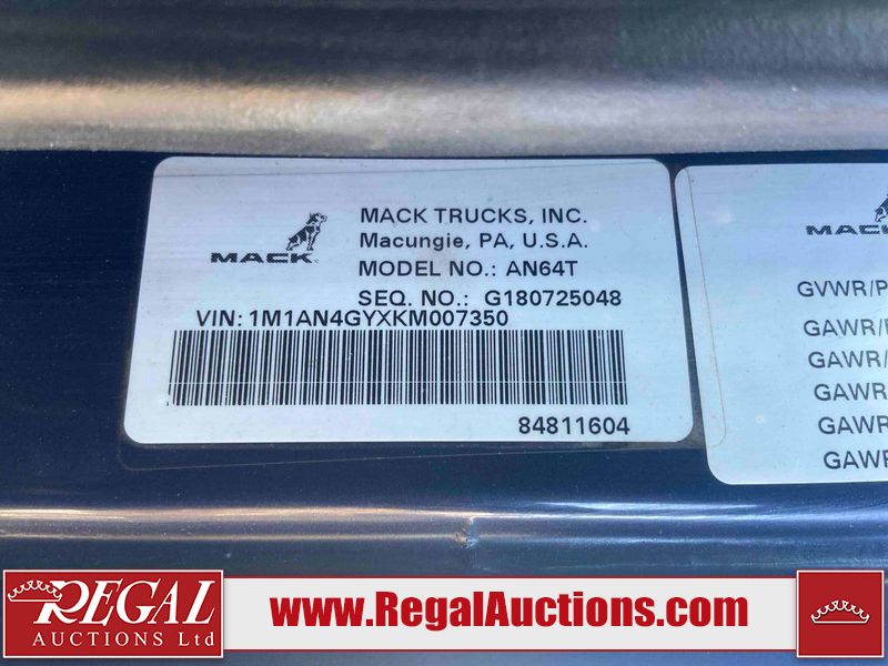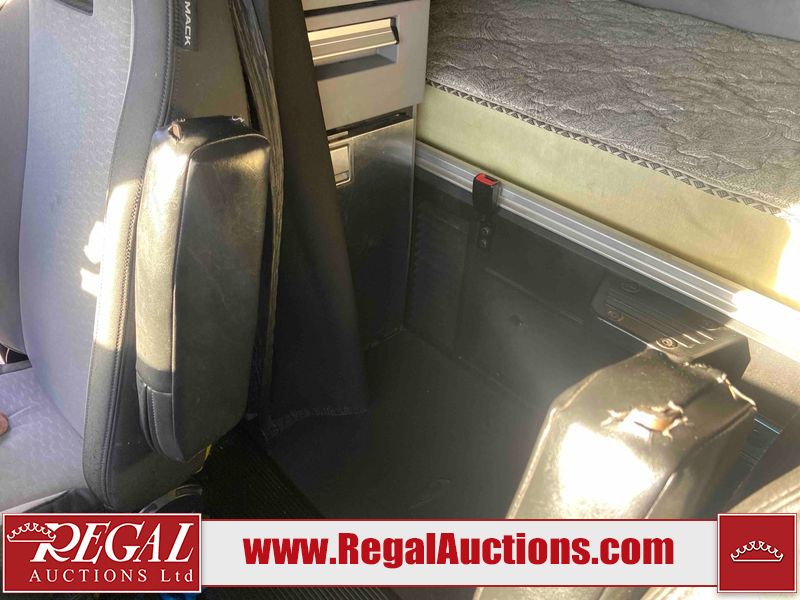 This unit is a 2019 Mack Anthem model tandem axle dual sleeper highway tractor. The odometer shows 953,951 km and 16,885 engine hours. It’s GVWR is 23,600 kg. Its CVIP is 04/2026. The interior is dirty. The passenger seat is stained. Both seat armrest are torn. There is adhesive damage on the dash. The rear cab wall and upper mattress are stained. The cab floor mat is lifting. This unit is equipped with a stereo system, rear climate control, and a refrigerator. All panels are showing chips, scratches, and scuffs. The crash bar fascia is cracked. The right front fender has peeling paint. The left front door panel is cracked and has peeling paint. This unit starts and runs without a boost. ACC unavailable code, missing communication from adaptive cruise control ECU codes. This unit is powered by a 12.8 L six cylinder turbo, diesel engine and an automatic transmission. The tires are mounted to alloy rims and appear to be good enough condition for use. This unit is equipped with air brakes, air, suspension, sliding fifth wheel, differential lock, and rear sliding axles. It has a 5400 KG front axle and 9100 KG rear axles.