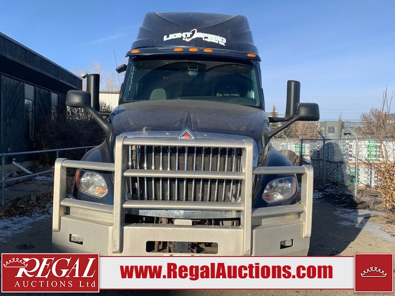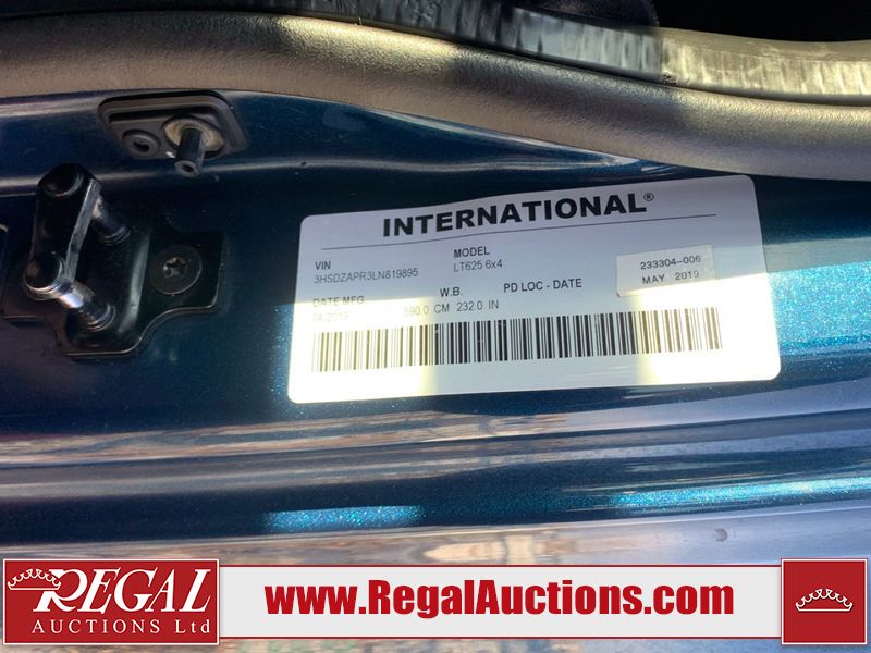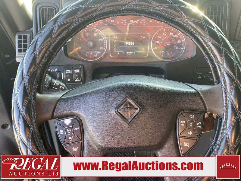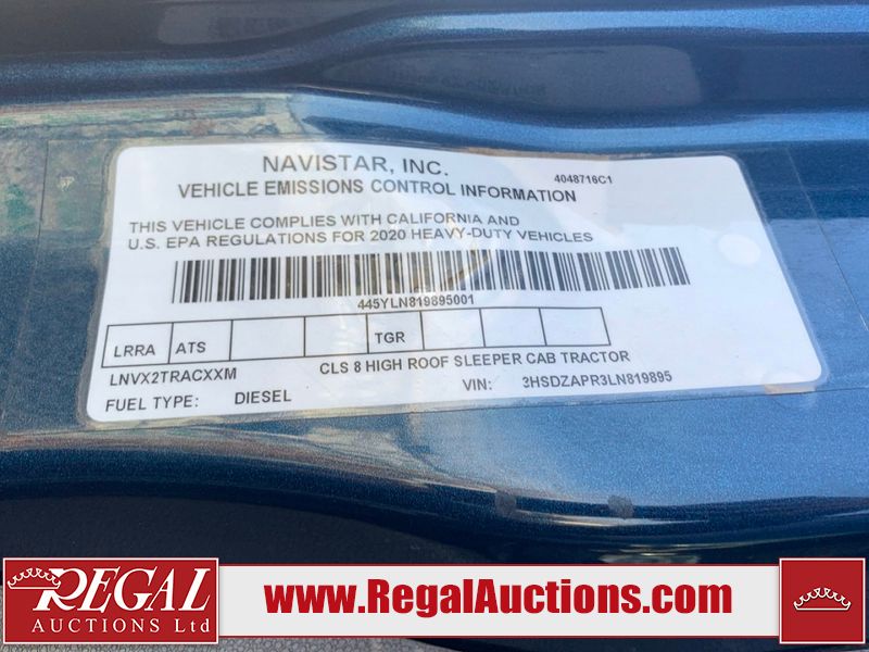 This unit is a 2020 International LT625 tandem axle sleeper highway tractor. The odometer reads 1,269,885 km and 19,894 engine hours. This unit has a CVIP expiry of 07/2026. The GVW is 53,200 pounds. The interior is clean. The seats are worn and have stains. The drivers window controls are broken. This unit is equipped with refrigerator and rear climate controls. It also has a dash cam and dash mounted tablet. There are chips on the engine, cover and cab. The engine cover has peeling paint. The cab has scratches. The windshield is chipped. The engine cover is cracked. The engine starts and runs without a boost. The unit is powered by a 14.9L Cummins X 15 six cylinder turbo diesel engine and an automatic transmission. This unit is equipped with air, brakes, air, suspension, and rear, locking differentials. All rims are mounted, the tires have plenty of tread remaining. The unit has a 13,200 pound front axle and 40,000 pound rear axles.