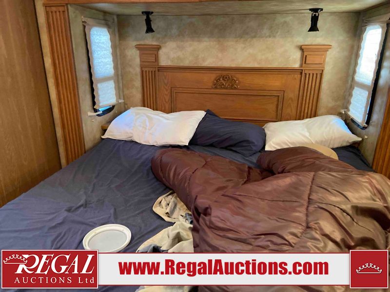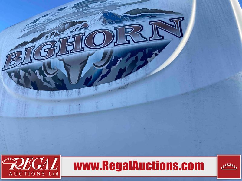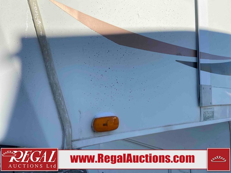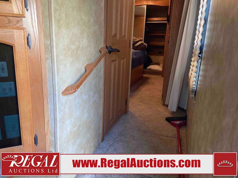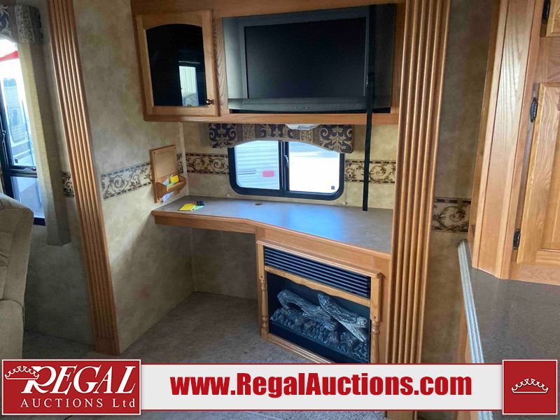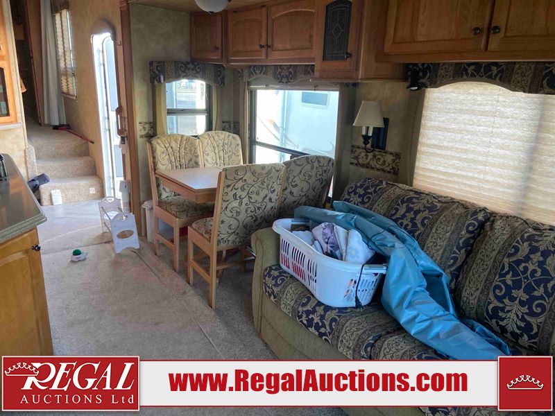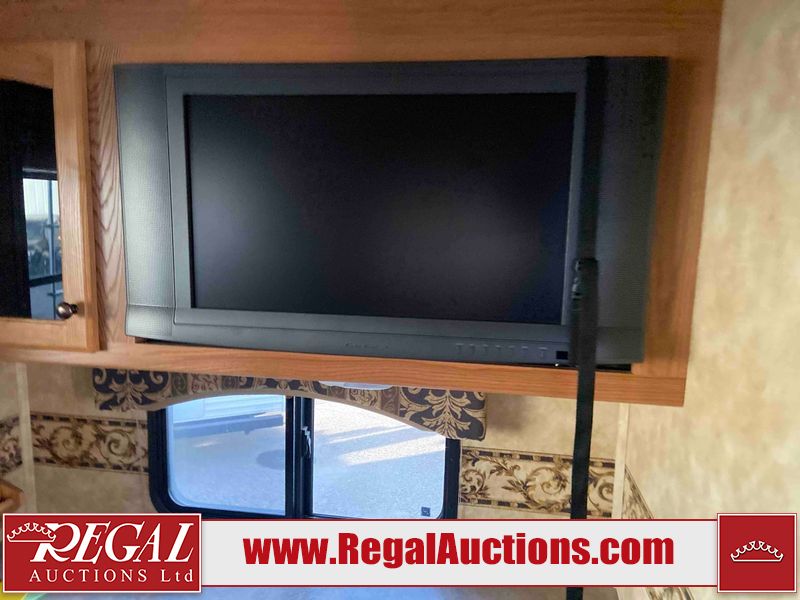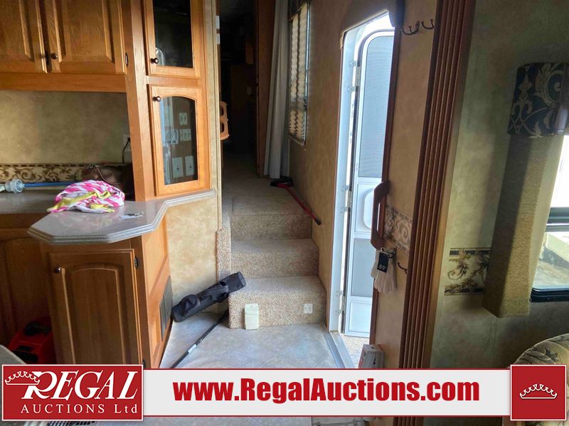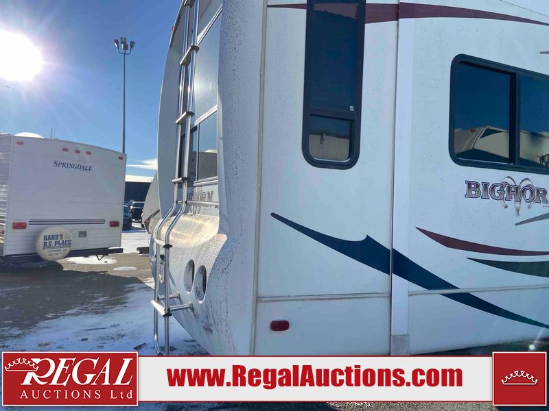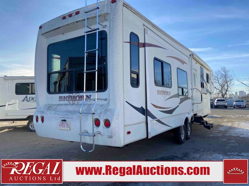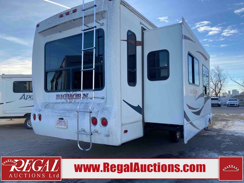 This RV is a 2008 Jayco bighorn heartlands 3670RL model tandem axle 5th wheel trailer. This unit has a single door entry, roof air, and four slide outs, accommodating the living area. The interior is dirty. Some walls are showing scratches and scuffs. The bedroom/kitchenette sky fan trim is cracked. The bed is worn. The bathroom ceiling and kitchenette wall is showing water damage. The kitchenette floor is lifting. The exterior walls are made of hard wall fiberglass. Most panels are showing scratches and scuffs. Some of the weatherstripping is peeling. The rear wall is showing mildew. The rear right fender is dented. Some decals are peeling. The battery is missing. There appears to be an electrical short in the slide out system as it lags continuously when extending or closing. This unit is equipped with two propane tanks. The tires are mounted to alloy rims and appeared to be in good enough condition for use. This unit is equipped with two televisions, refrigerator, microwave, three burner stove, top, oven, electrical fireplace, and a stereo system. The layout consist of a master bedroom/bathroom in the front, kitchenette/dinette in the center, and a living area in the rear.