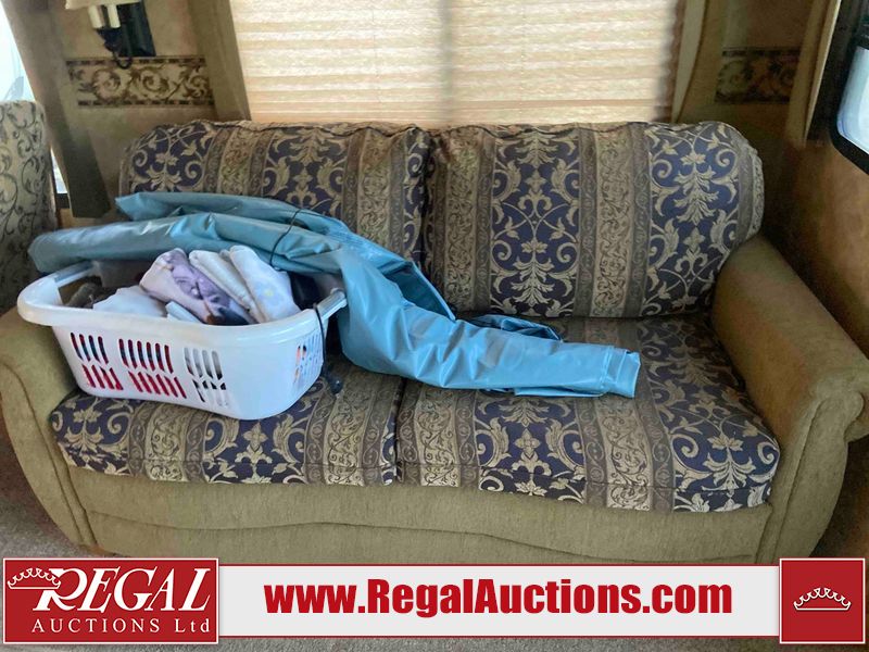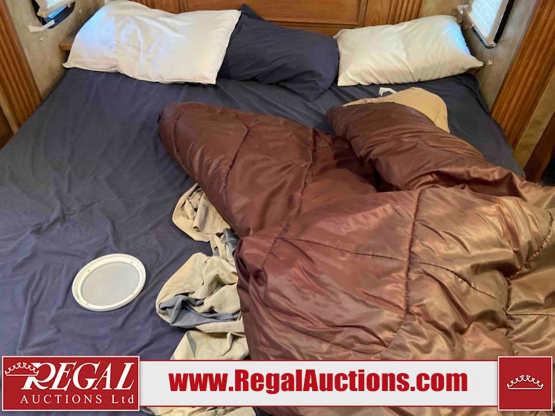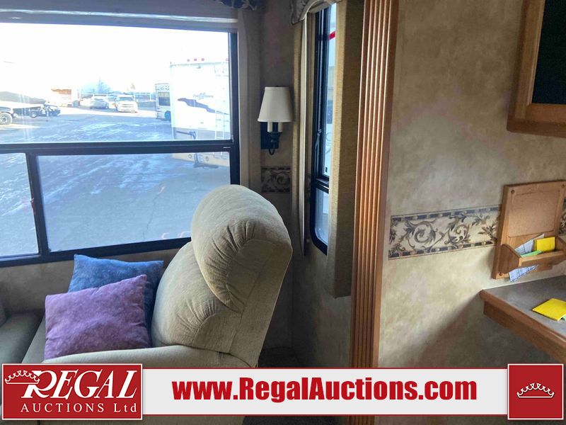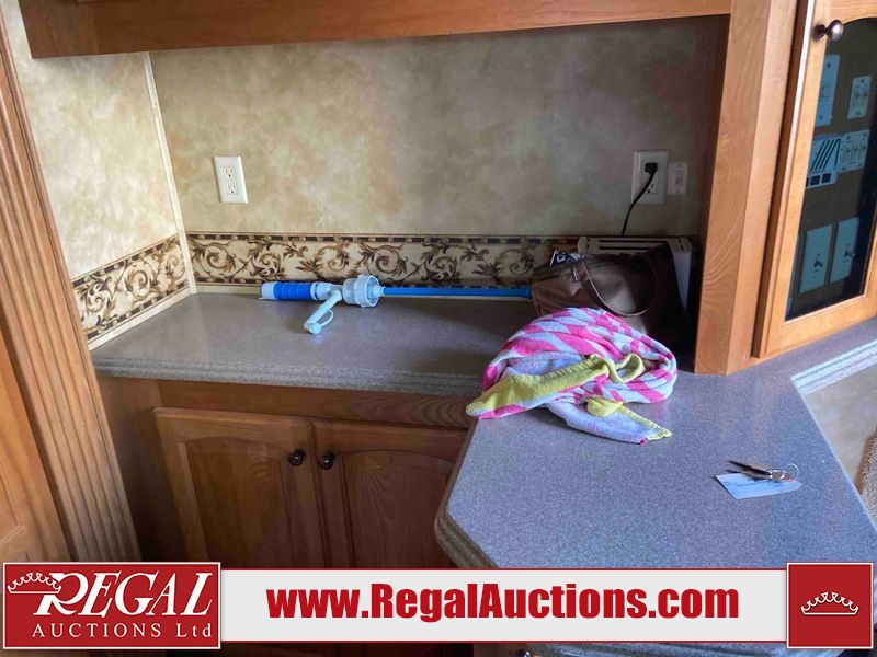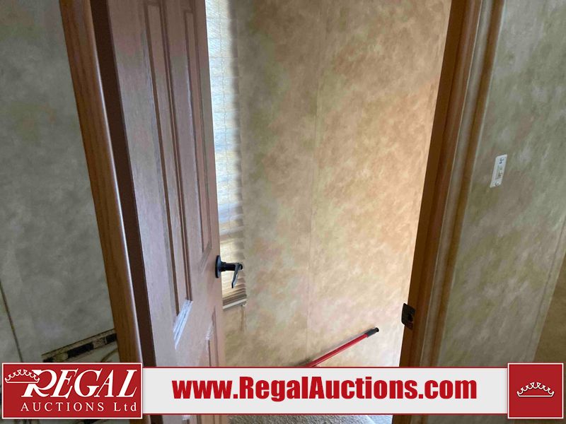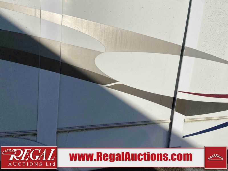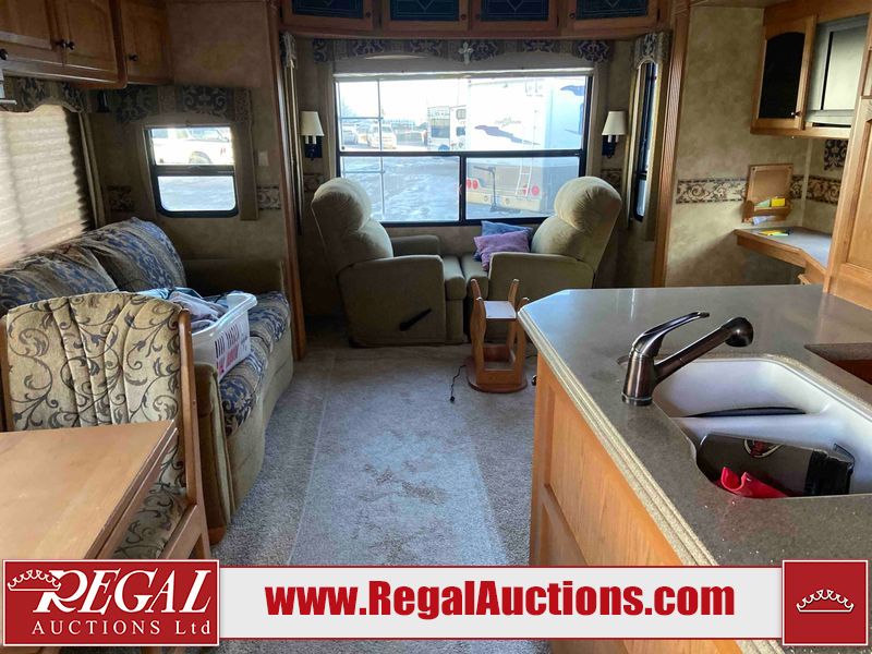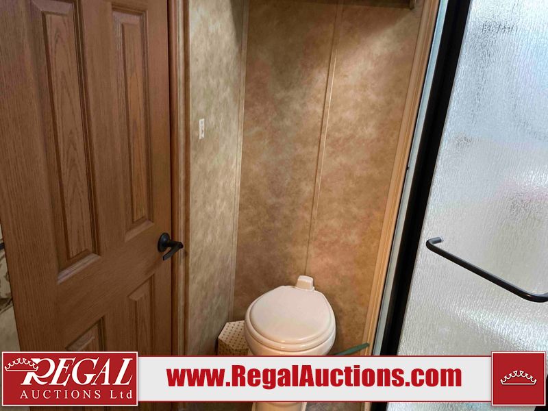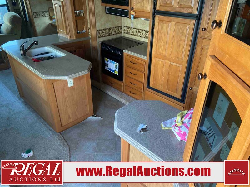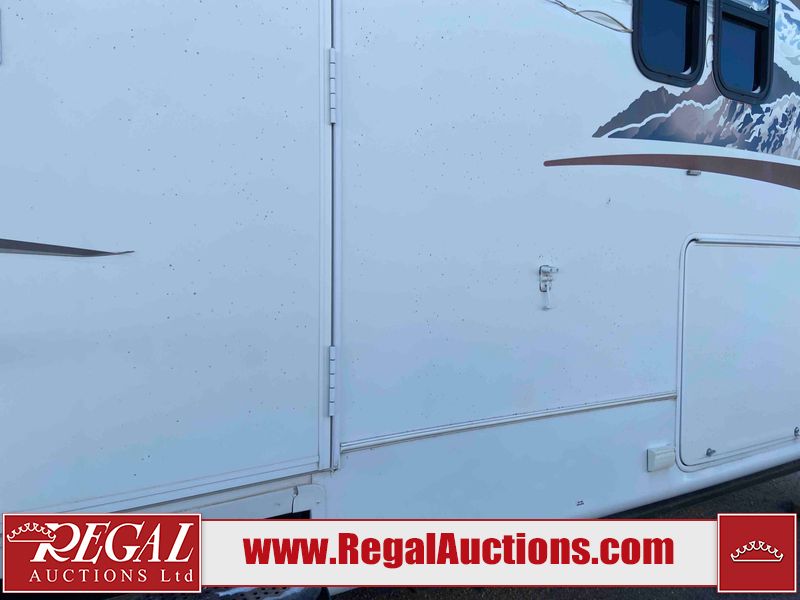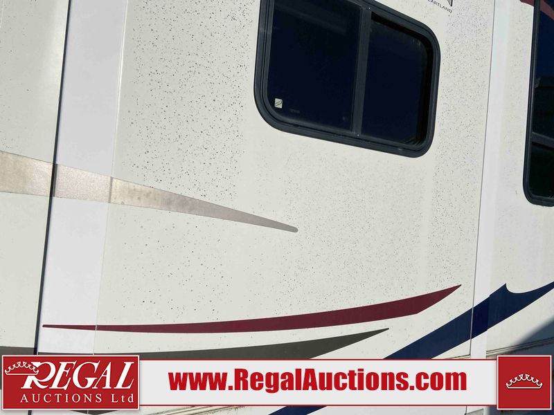 This RV is a 2008 Jayco bighorn heartlands 3670RL model tandem axle 5th wheel trailer. This unit has a single door entry, roof air, and four slide outs, accommodating the living area. The interior is dirty. Some walls are showing scratches and scuffs. The bedroom/kitchenette sky fan trim is cracked. The bed is worn. The bathroom ceiling and kitchenette wall is showing water damage. The kitchenette floor is lifting. The exterior walls are made of hard wall fiberglass. Most panels are showing scratches and scuffs. Some of the weatherstripping is peeling. The rear wall is showing mildew. The rear right fender is dented. Some decals are peeling. The battery is missing. There appears to be an electrical short in the slide out system as it lags continuously when extending or closing. This unit is equipped with two propane tanks. The tires are mounted to alloy rims and appeared to be in good enough condition for use. This unit is equipped with two televisions, refrigerator, microwave, three burner stove, top, oven, electrical fireplace, and a stereo system. The layout consist of a master bedroom/bathroom in the front, kitchenette/dinette in the center, and a living area in the rear.