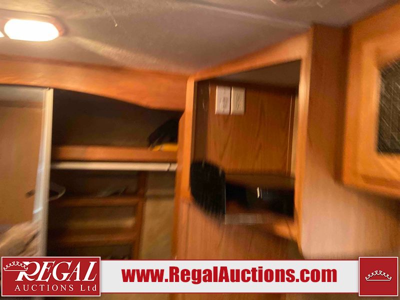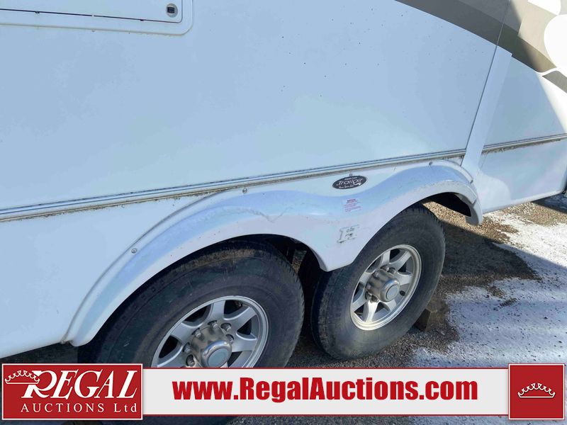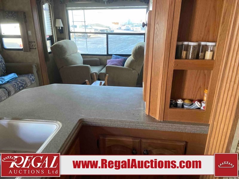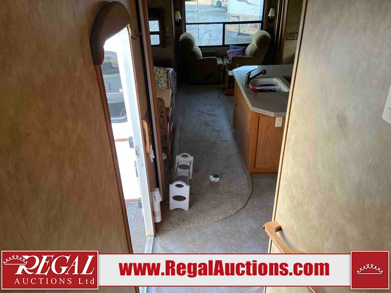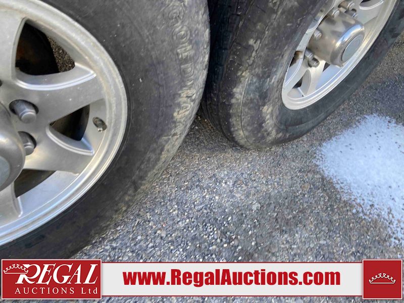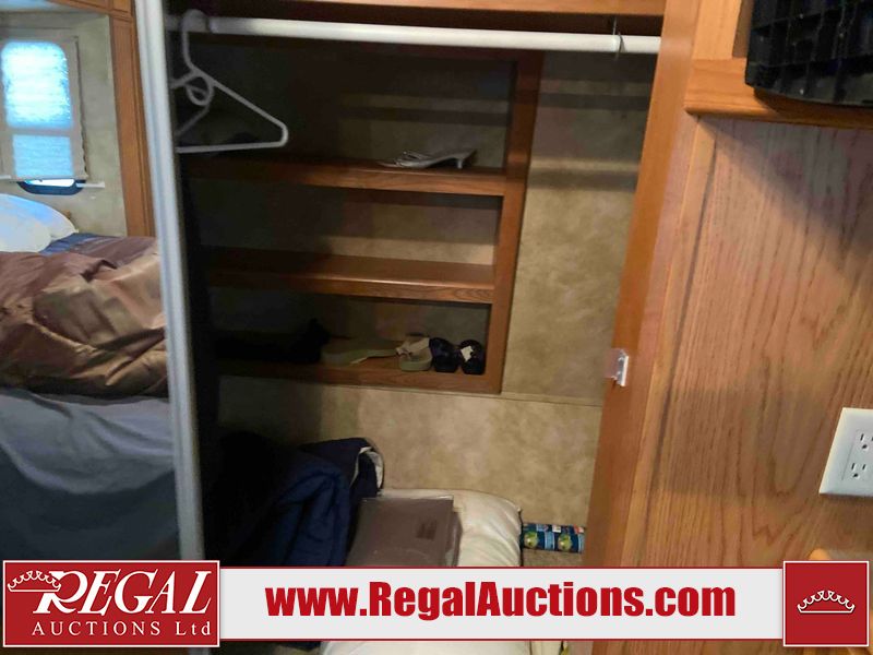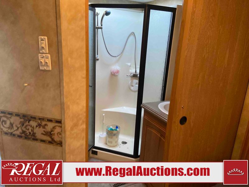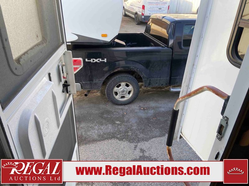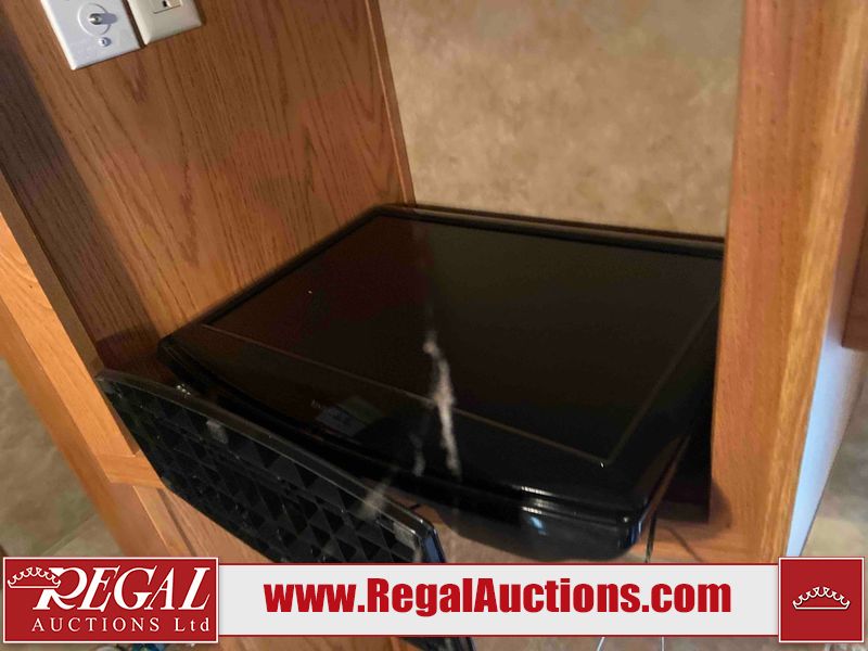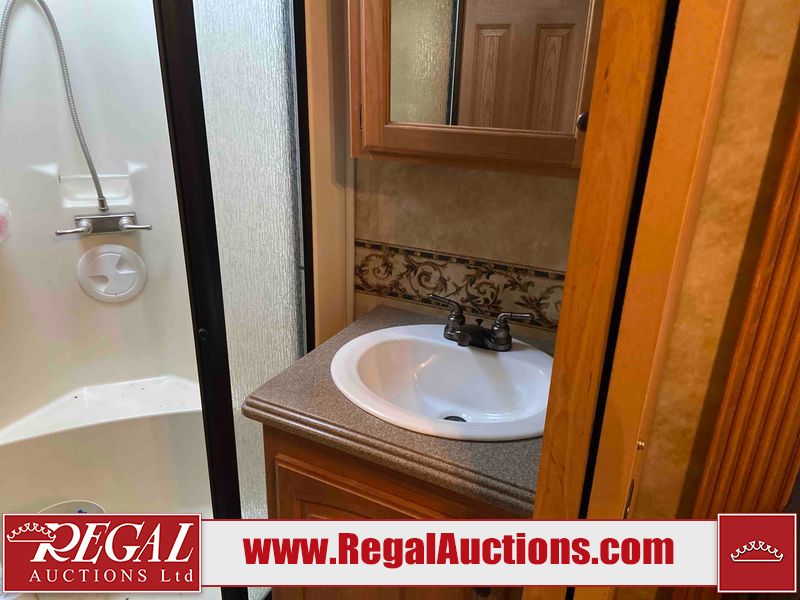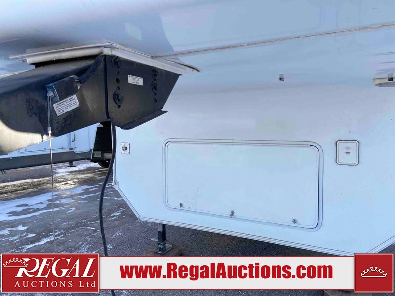 This RV is a 2008 Jayco bighorn heartlands 3670RL model tandem axle 5th wheel trailer. This unit has a single door entry, roof air, and four slide outs, accommodating the living area. The interior is dirty. Some walls are showing scratches and scuffs. The bedroom/kitchenette sky fan trim is cracked. The bed is worn. The bathroom ceiling and kitchenette wall is showing water damage. The kitchenette floor is lifting. The exterior walls are made of hard wall fiberglass. Most panels are showing scratches and scuffs. Some of the weatherstripping is peeling. The rear wall is showing mildew. The rear right fender is dented. Some decals are peeling. The battery is missing. There appears to be an electrical short in the slide out system as it lags continuously when extending or closing. This unit is equipped with two propane tanks. The tires are mounted to alloy rims and appeared to be in good enough condition for use. This unit is equipped with two televisions, refrigerator, microwave, three burner stove, top, oven, electrical fireplace, and a stereo system. The layout consist of a master bedroom/bathroom in the front, kitchenette/dinette in the center, and a living area in the rear.