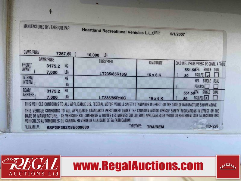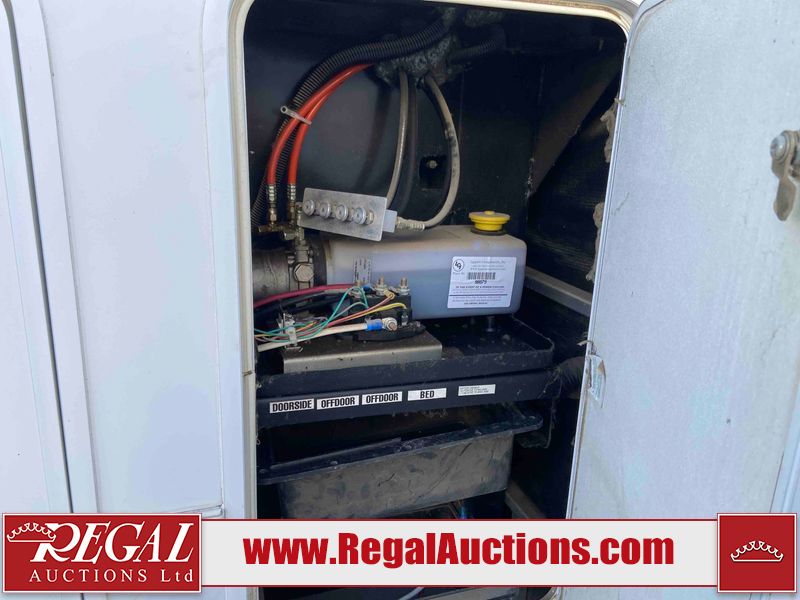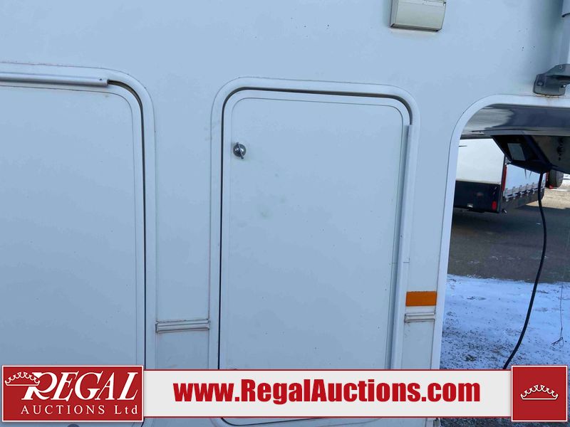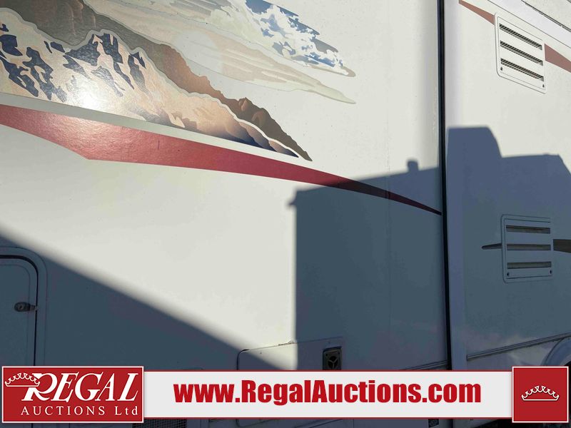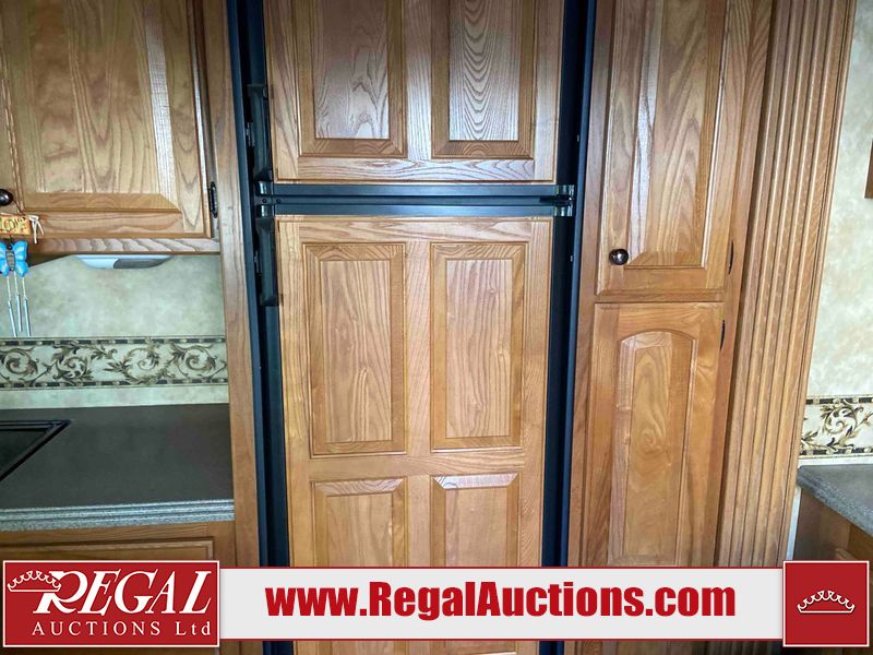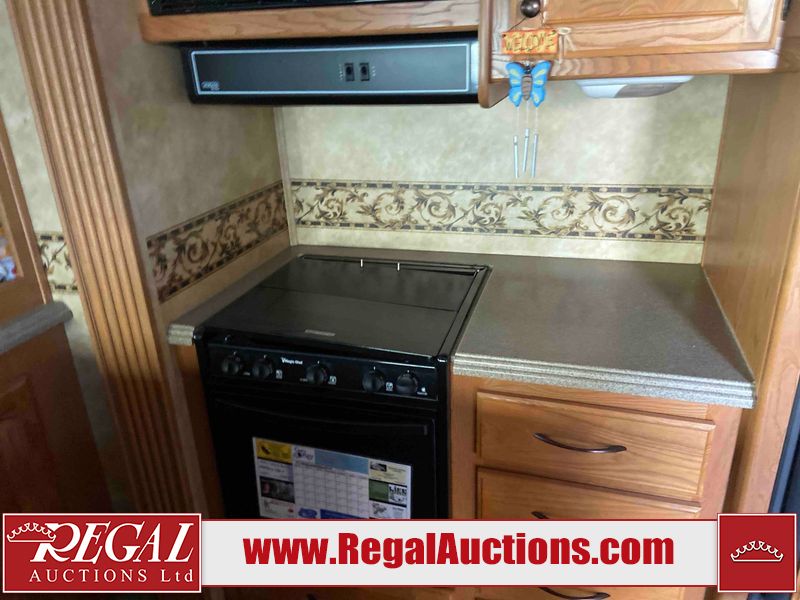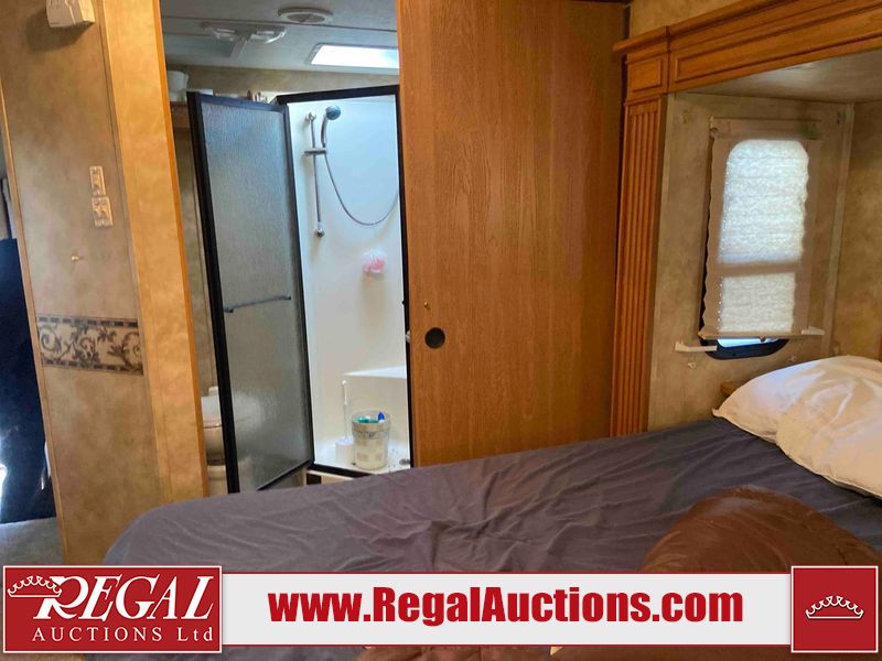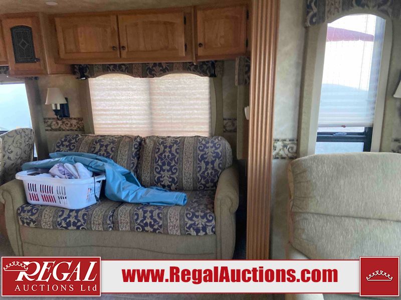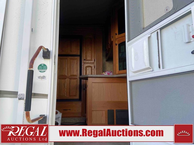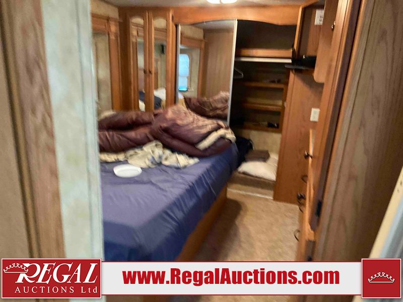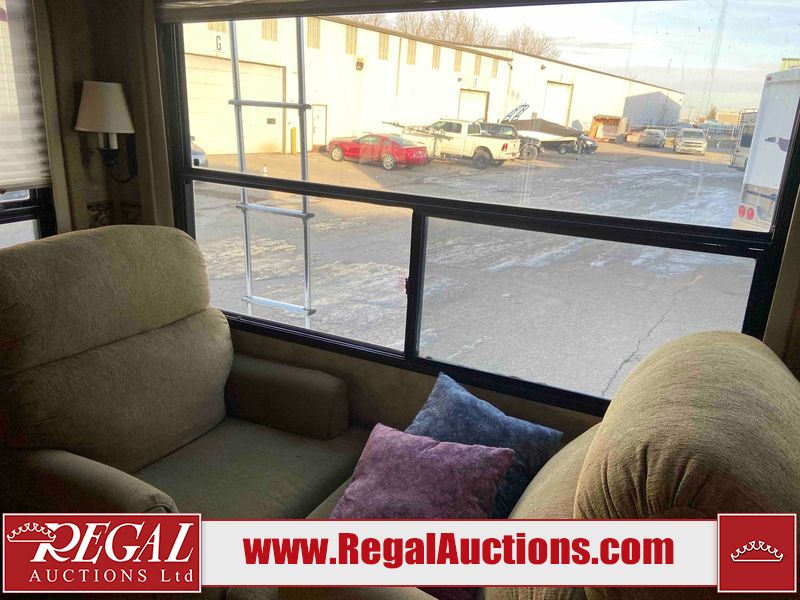 This RV is a 2008 Jayco bighorn heartlands 3670RL model tandem axle 5th wheel trailer. This unit has a single door entry, roof air, and four slide outs, accommodating the living area. The interior is dirty. Some walls are showing scratches and scuffs. The bedroom/kitchenette sky fan trim is cracked. The bed is worn. The bathroom ceiling and kitchenette wall is showing water damage. The kitchenette floor is lifting. The exterior walls are made of hard wall fiberglass. Most panels are showing scratches and scuffs. Some of the weatherstripping is peeling. The rear wall is showing mildew. The rear right fender is dented. Some decals are peeling. The battery is missing. There appears to be an electrical short in the slide out system as it lags continuously when extending or closing. This unit is equipped with two propane tanks. The tires are mounted to alloy rims and appeared to be in good enough condition for use. This unit is equipped with two televisions, refrigerator, microwave, three burner stove, top, oven, electrical fireplace, and a stereo system. The layout consist of a master bedroom/bathroom in the front, kitchenette/dinette in the center, and a living area in the rear.