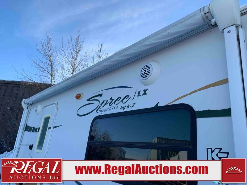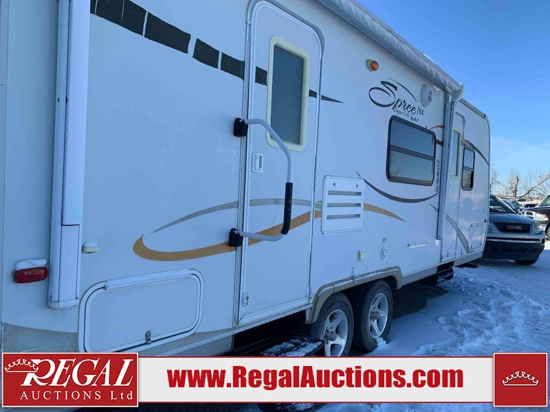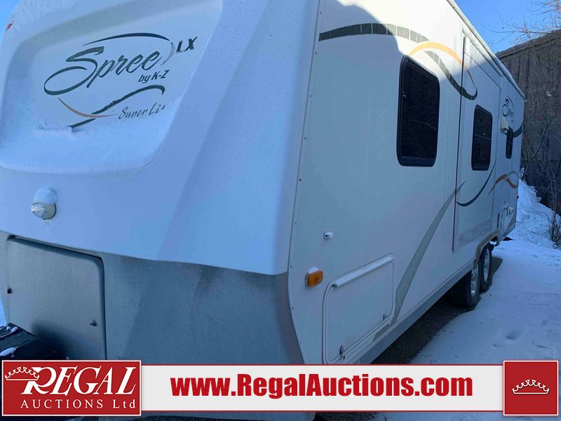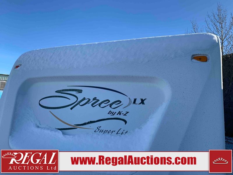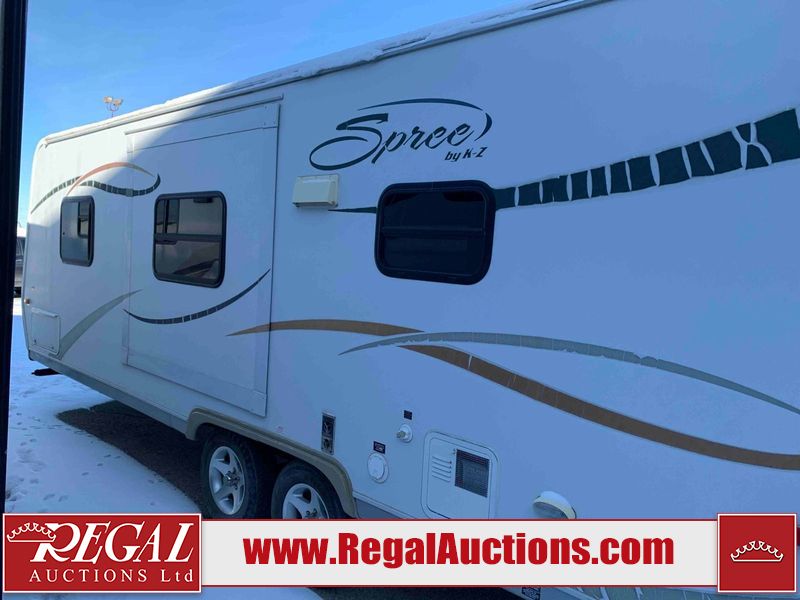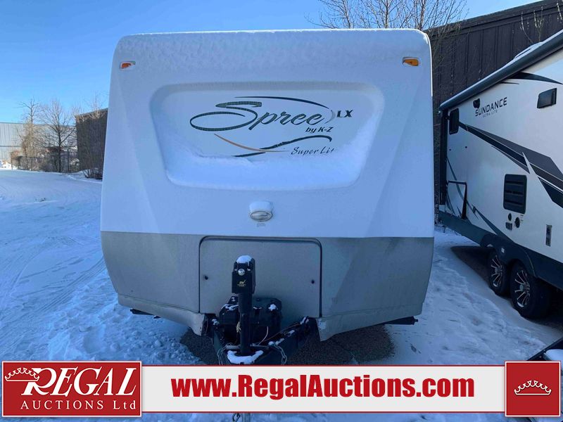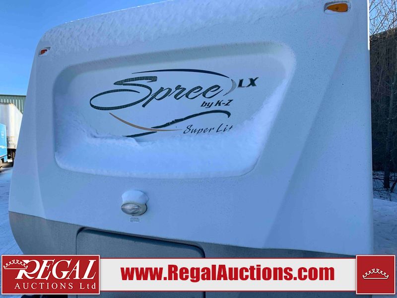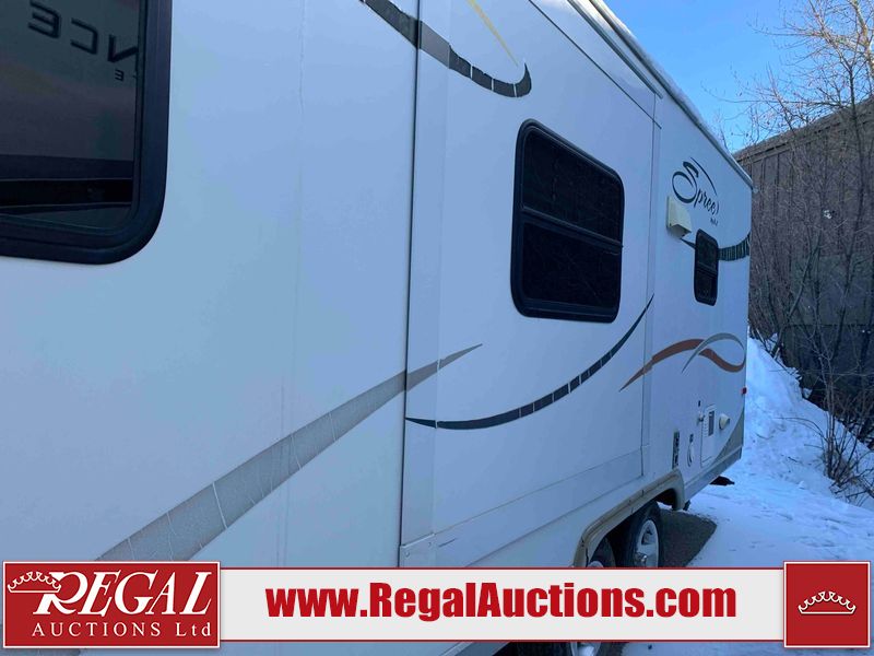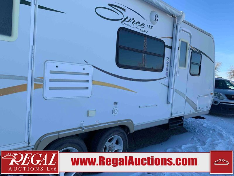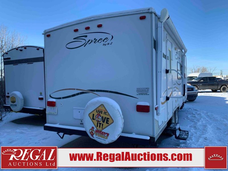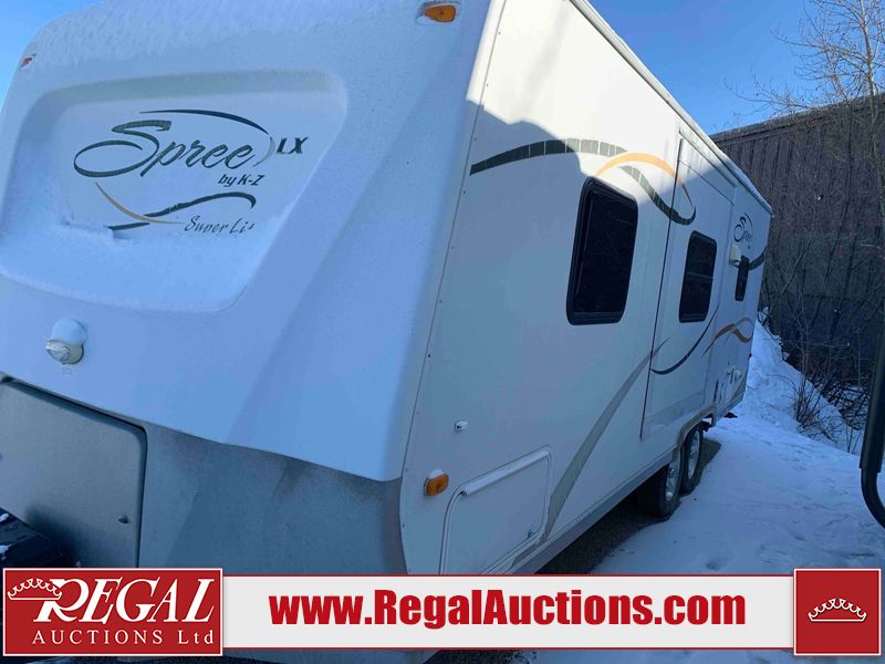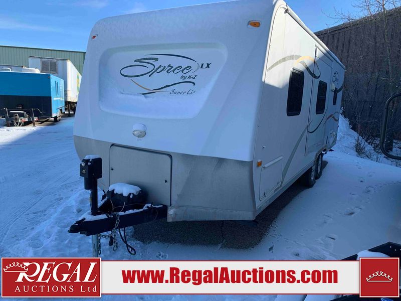 This RV is a 2009 KZ inc Spree 240 RBS model bumper pull travel trailer. This unit has two entry doors, roof air and a single slide out accommodating the living area/kitchen. The interior is dirty. The sink is cracked. The kitchen cabinets are poorly painted. Some of the wood paneling has scratches and scuffs. The slide out couch bed is missing trim. The kitchen drawer is broken. The bedroom roof has water damage. The exterior walls are made of hard wall fiberglass. The front end has moderate chips, scratches and peeling paint. Both plastic fenders are cracked. The rear walls have water delamination. Some of the wall trim is peeling and the decal is cracked. The awning is cracked. The slide is operational. This unit is equipped with one battery and two propane tanks. The tires are mounted on alloy rims. The side walls are cracked and will need to be replaced. The layout of this unit consists of a master bedroom at the front kitchen, living area at the centre and a washroom at the rear. This unit is equipped with a three burner stove top, oven microwave, a flat screen television for and a refrigerator .