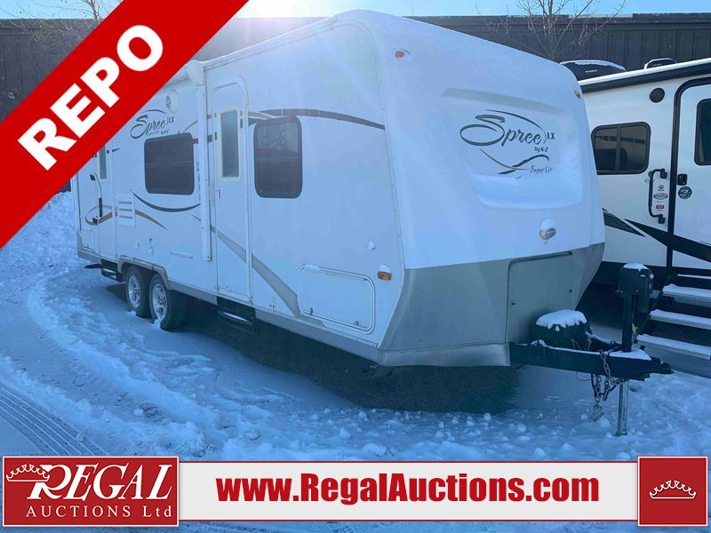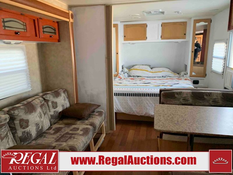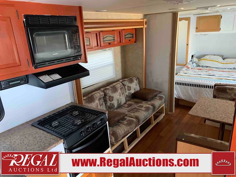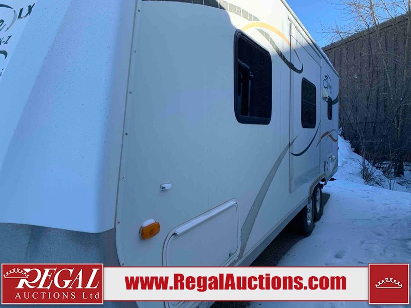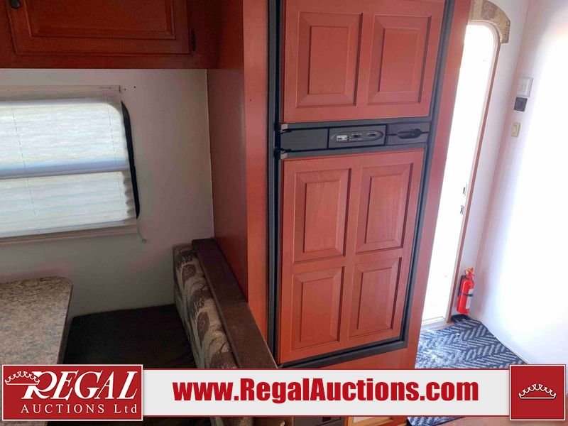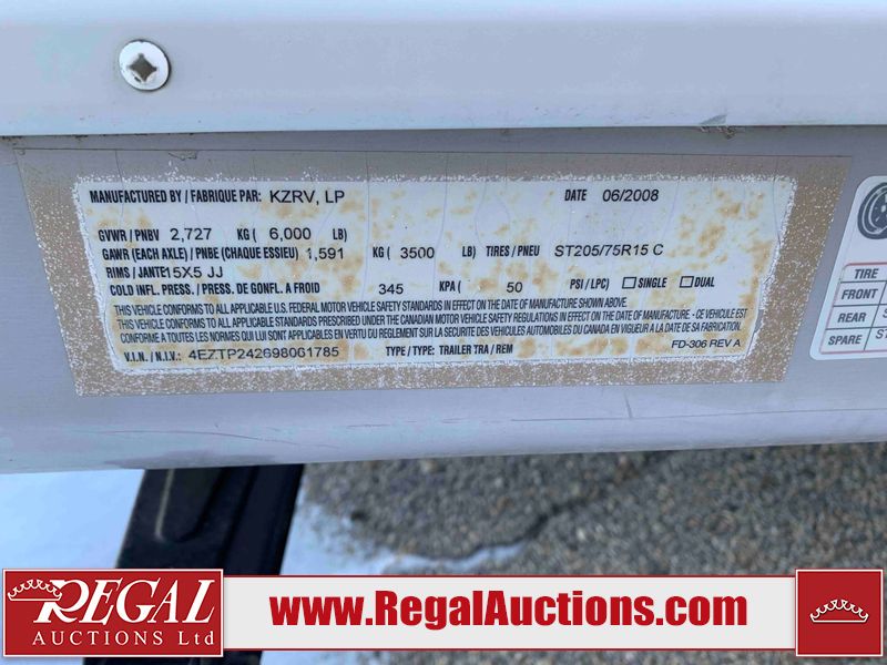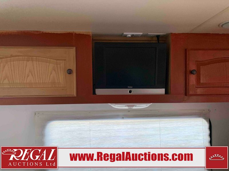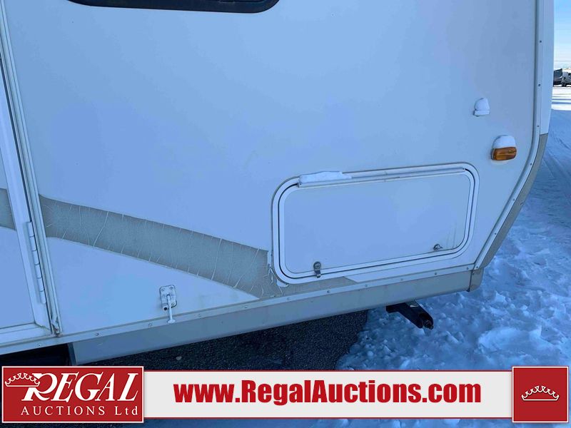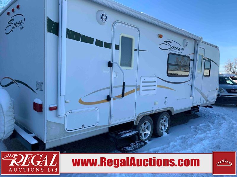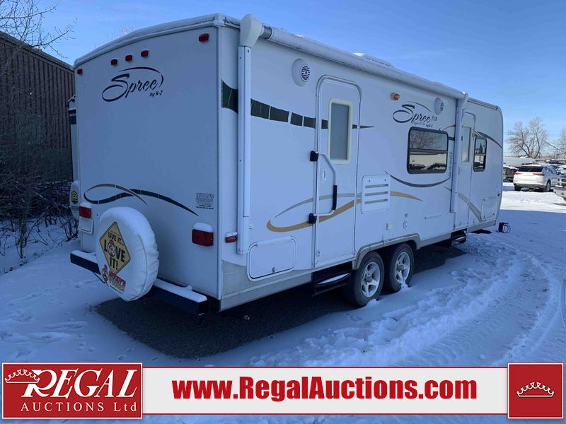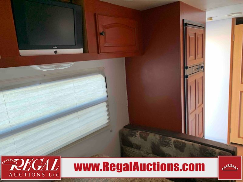This RV is a 2009 KZ inc Spree 240 RBS model bumper pull travel trailer. This unit has two entry doors, roof air and a single slide out accommodating the living area/kitchen. The interior is dirty. The sink is cracked. The kitchen cabinets are poorly painted. Some of the wood paneling has scratches and scuffs. The slide out couch bed is missing trim. The kitchen drawer is broken. The bedroom roof has water damage. The exterior walls are made of hard wall fiberglass. The front end has moderate chips, scratches and peeling paint. Both plastic fenders are cracked. The rear walls have water delamination. Some of the wall trim is peeling and the decal is cracked. The awning is cracked. The slide is operational. This unit is equipped with one battery and two propane tanks. The tires are mounted on alloy rims. The side walls are cracked and will need to be replaced. The layout of this unit consists of a master bedroom at the front kitchen, living area at the centre and a washroom at the rear. This unit is equipped with a three burner stove top, oven microwave, a flat screen television for and a refrigerator .