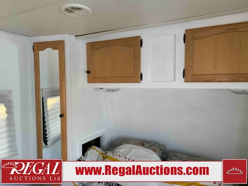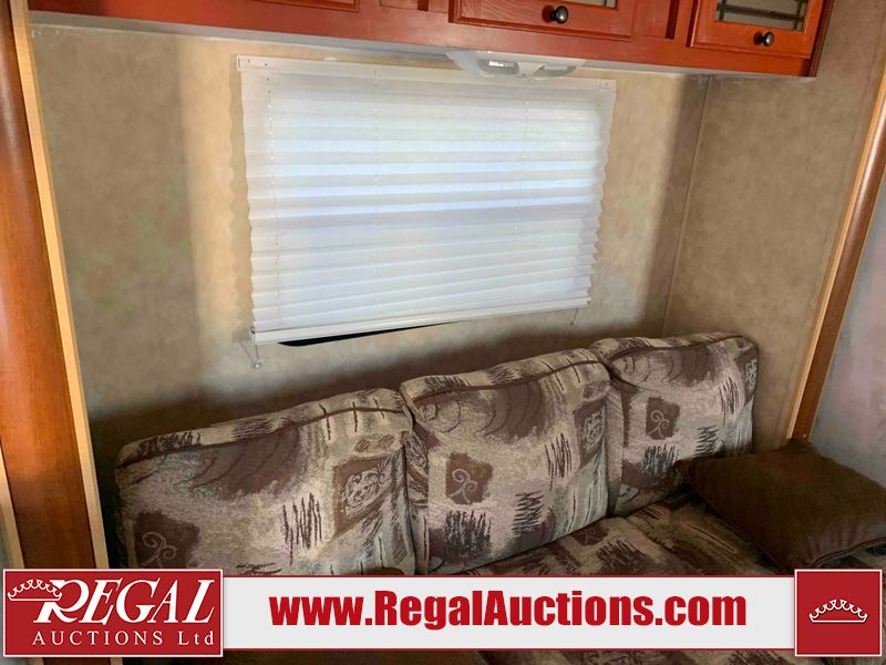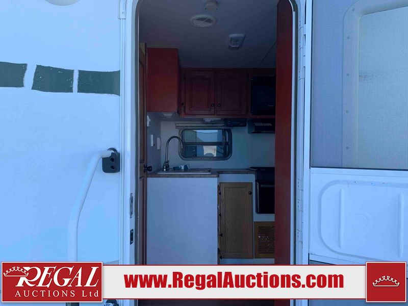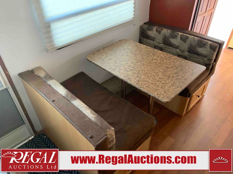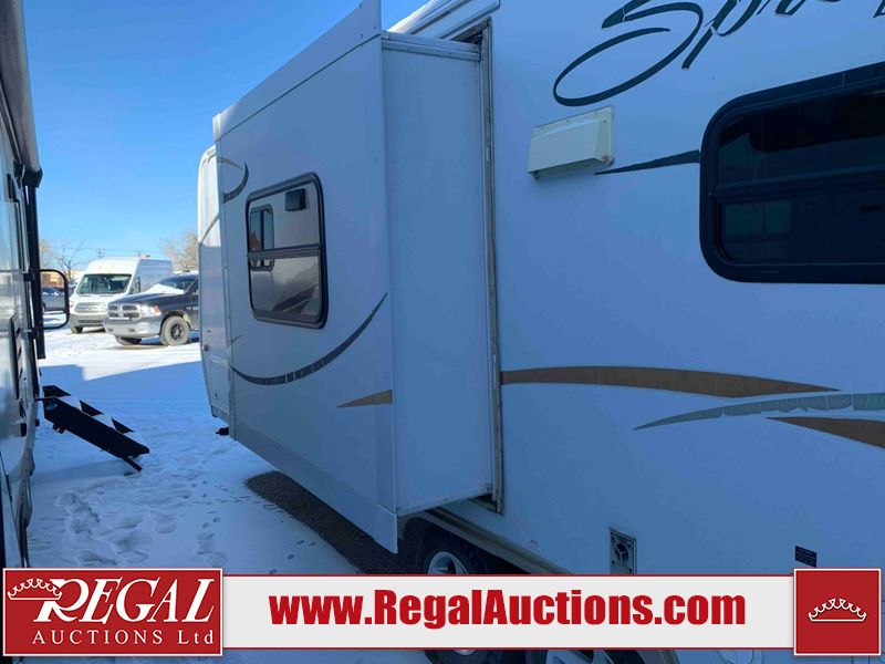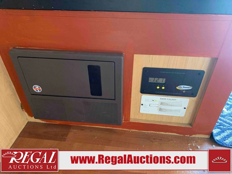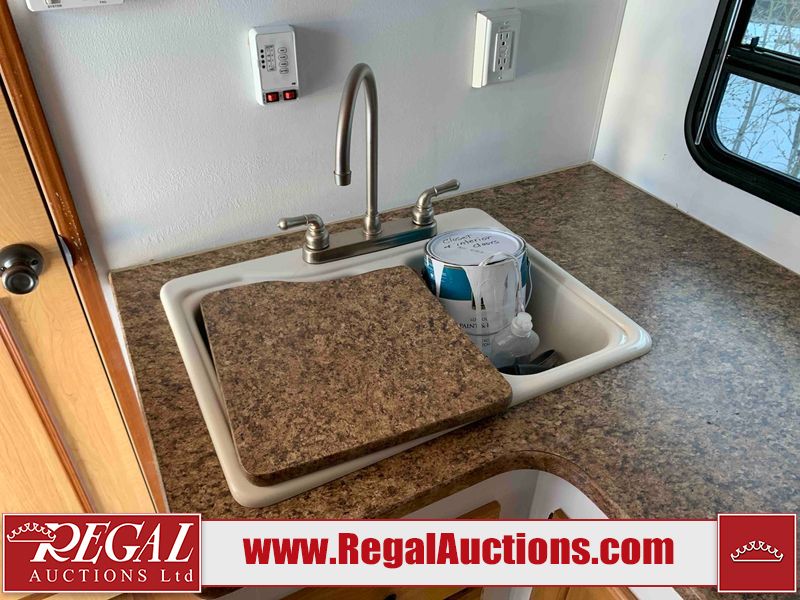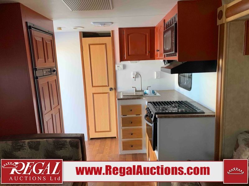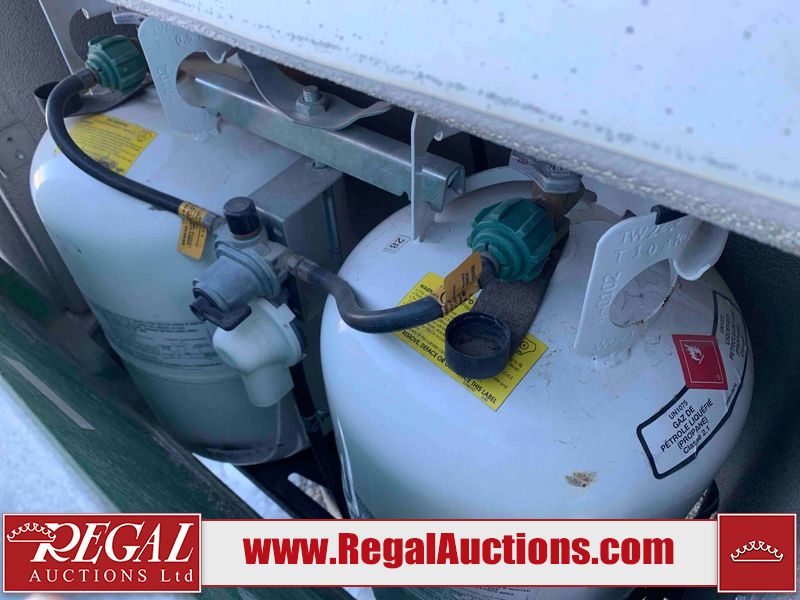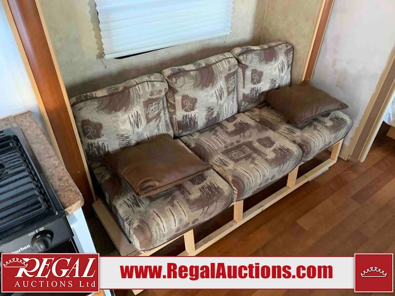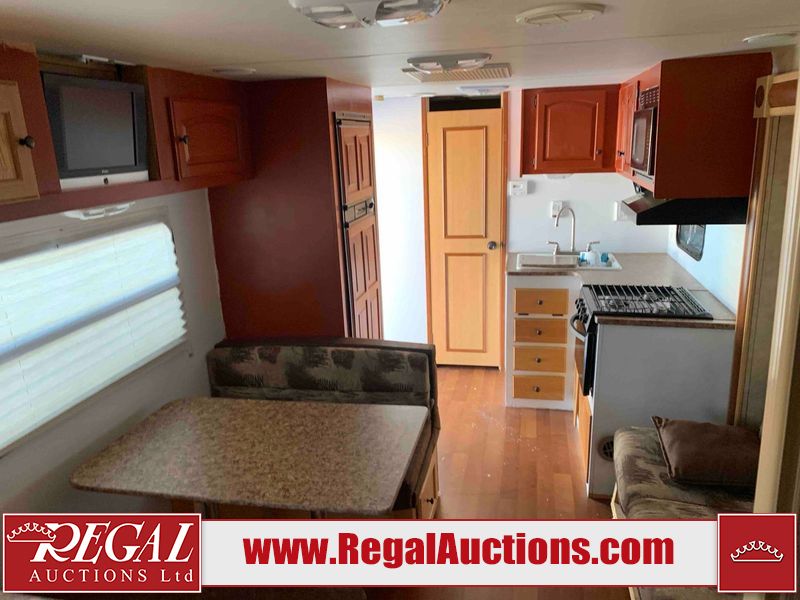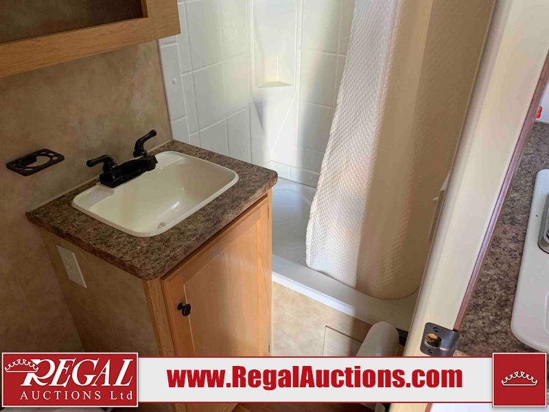 This RV is a 2009 KZ inc Spree 240 RBS model bumper pull travel trailer. This unit has two entry doors, roof air and a single slide out accommodating the living area/kitchen. The interior is dirty. The sink is cracked. The kitchen cabinets are poorly painted. Some of the wood paneling has scratches and scuffs. The slide out couch bed is missing trim. The kitchen drawer is broken. The bedroom roof has water damage. The exterior walls are made of hard wall fiberglass. The front end has moderate chips, scratches and peeling paint. Both plastic fenders are cracked. The rear walls have water delamination. Some of the wall trim is peeling and the decal is cracked. The awning is cracked. The slide is operational. This unit is equipped with one battery and two propane tanks. The tires are mounted on alloy rims. The side walls are cracked and will need to be replaced. The layout of this unit consists of a master bedroom at the front kitchen, living area at the centre and a washroom at the rear. This unit is equipped with a three burner stove top, oven microwave, a flat screen television for and a refrigerator .