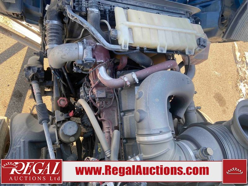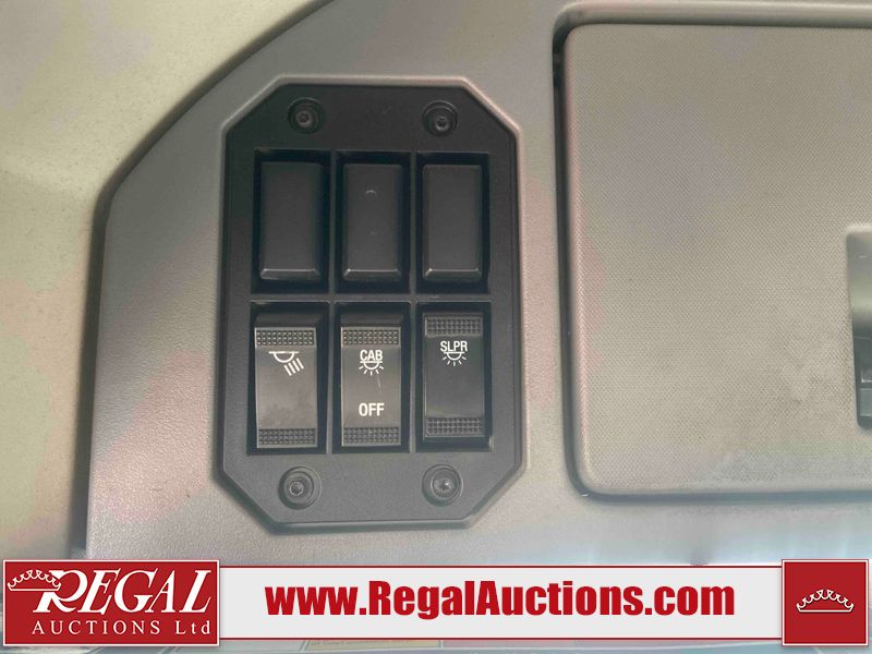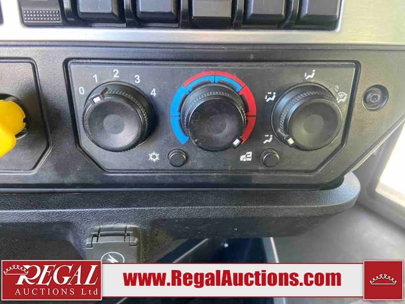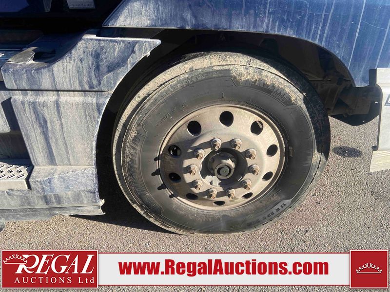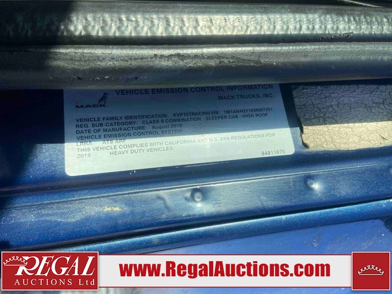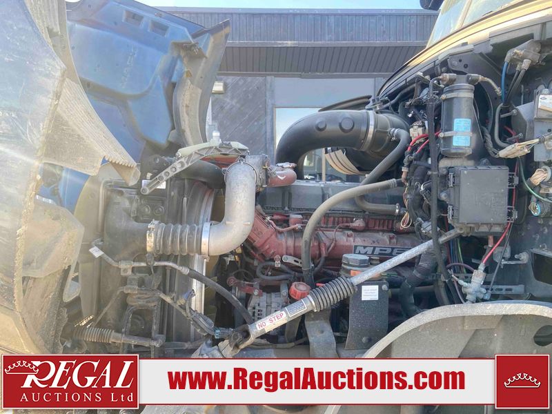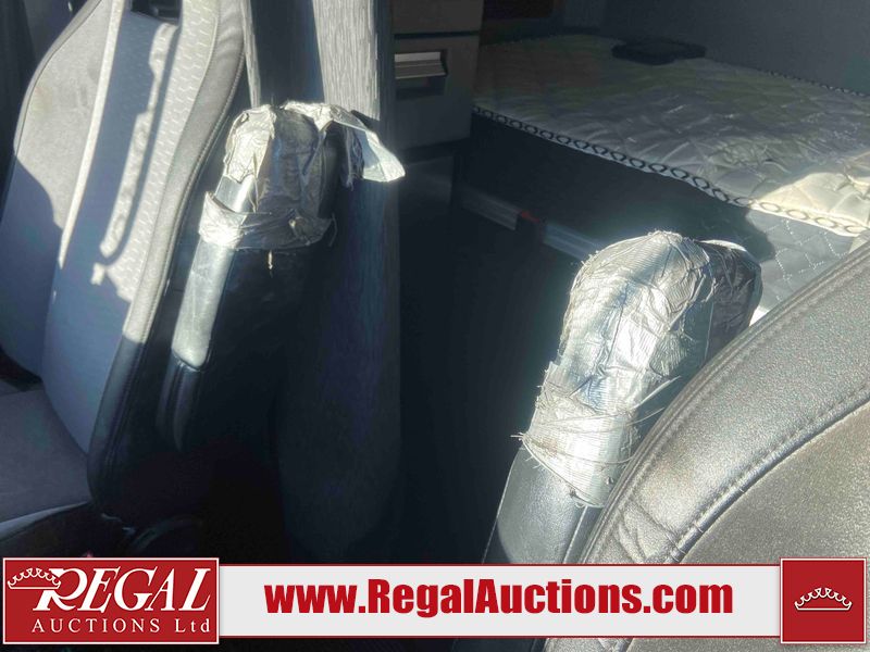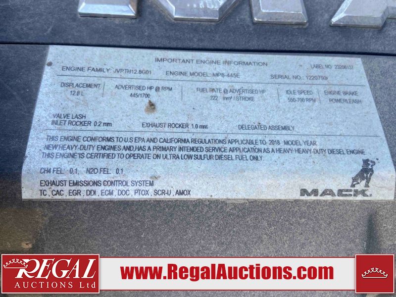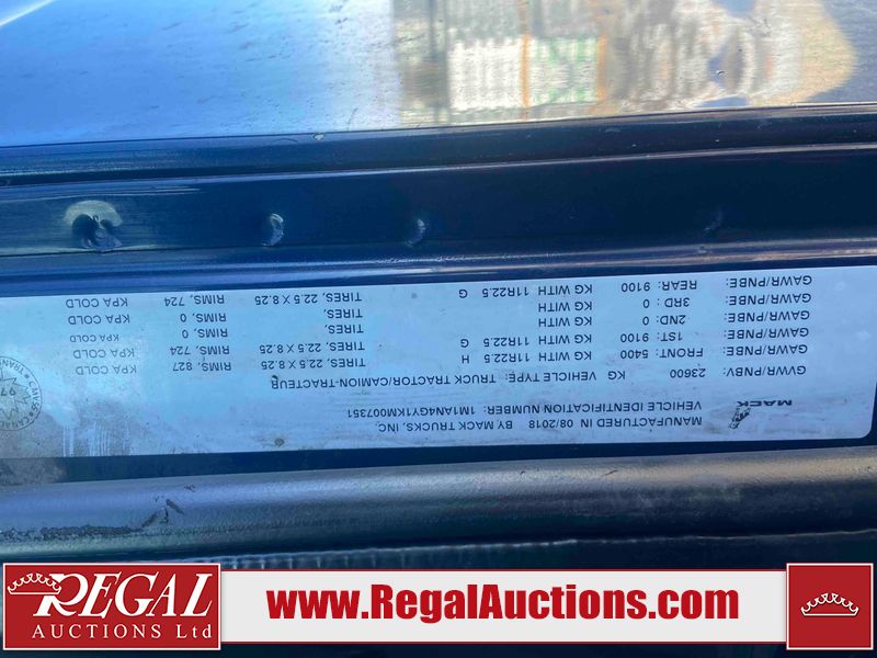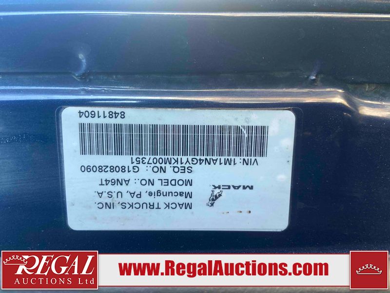 This unit is a 2019 Mack Anthem AN614 tandem axle sleeper highway tractor. The odometer shows 1,222,011 kilometers and 24,079 engine hours. It’s GVWR is 23,600 KG. It has a CIP of 01/2026. The interior is dirty. The steering wheel is damaged. Both seats are worn, with the armrest, torn and been poorly resealed. The lower mattress is worn, and the upper mattress sustained. This unit is equipped with a stereo system, rear climate controls, and a refrigerator. All panels are showing chips, scratches, and scuffs. The crash bar is gouge. The windshield is cracked. The driver‘s door has peeling paint. Both cab sides have peeling paint. The right rear mudflap bracket is misaligned. This unit starts and runs without a boost. The check engine light is on. Miscommunication from ECU code, and Check engine fault codes. There is an audible air leak near the rear axles. This unit is powered by a MP8-445E 12.8L six cylinder turbo, diesel engine and an automatic transmission. The tires are mounted to alloy rims and appeared to be in good enough condition for use. This unit is equipped with air brakes, air, suspension, sliding fifth wheel, rear differential lock, and rear sliding axles. It has a 5400 kg front axle and a 9100 kg rear axis.