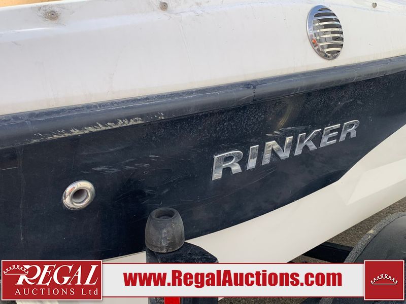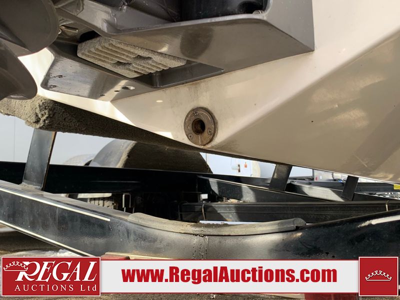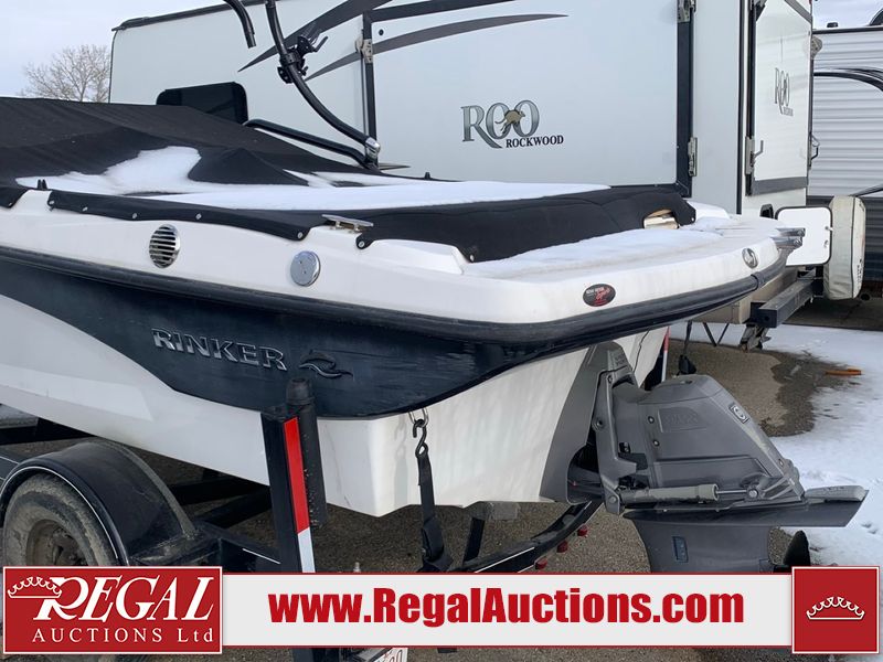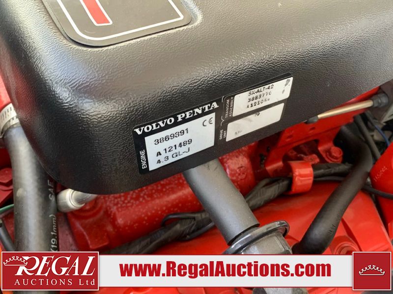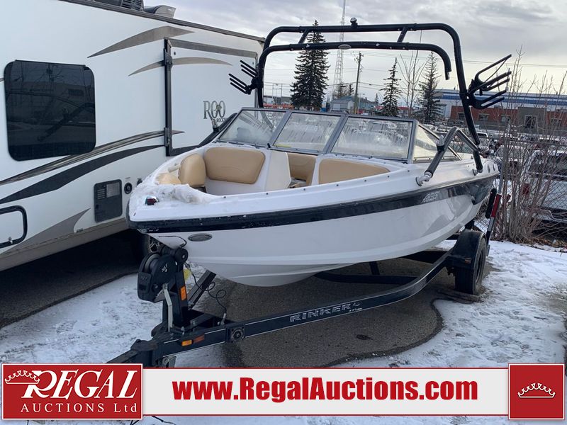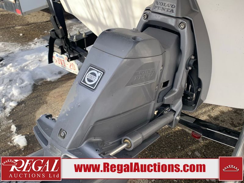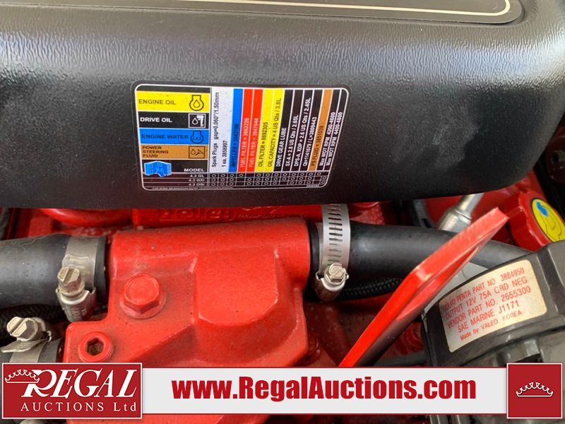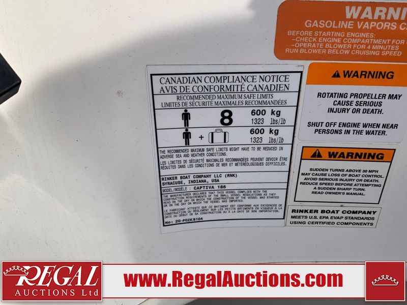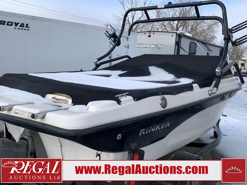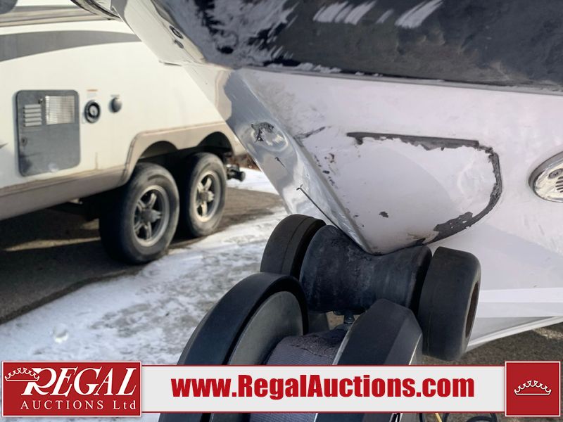 This watercraft is a 18 foot 2010 Rinker 186 bow rider model with a fibreglass v type hull. The hour metre reads 202 hours. This unit has a maximum capacity of 8 occupants or 1323lbs. The interior is dirty. The leather has stains. There are minor scuffs to the inside of the cap. The sides and bottom of the hull have deep scrapes. The hummingbird sensor has broken off of the transom. The trailer has surface rust. Steel rims are mounted, the tires have plenty of tread remaining. The engine block may be cracked. The unit is powered by a 4.3 Litre six cylinder Volvo GL engine and a stern drive. The propeller and Skegg are both damaged and may require repair. The drain plug is missing. The unit is equipped with a stereo system, hummingbird helix 5 model and a wake tower. This unit is also equipped with a canvas two piece cover.