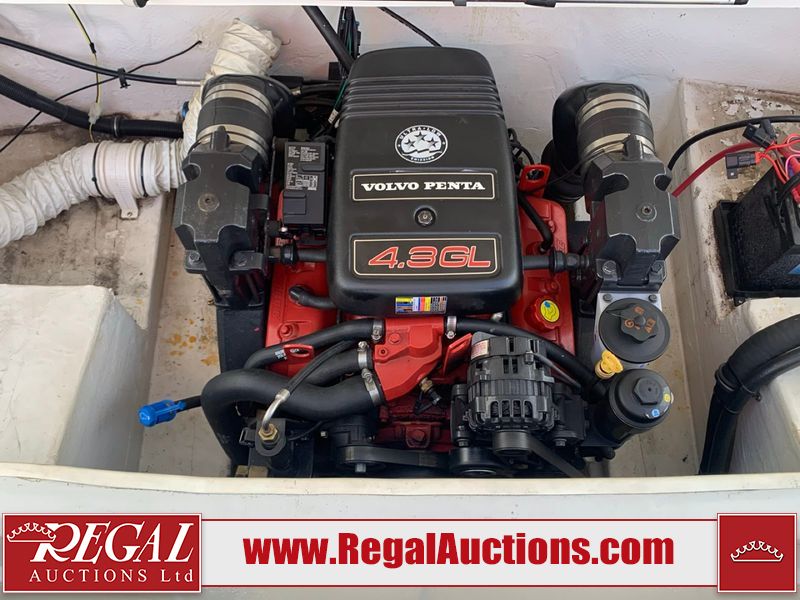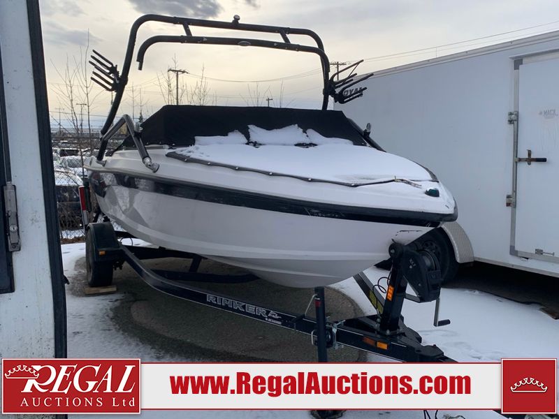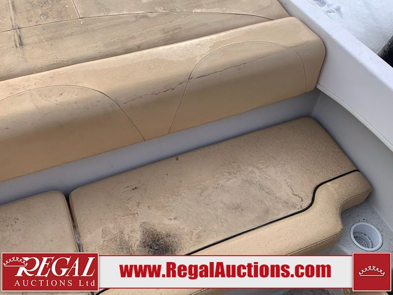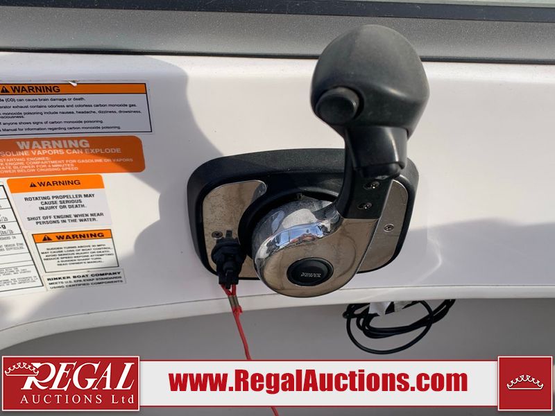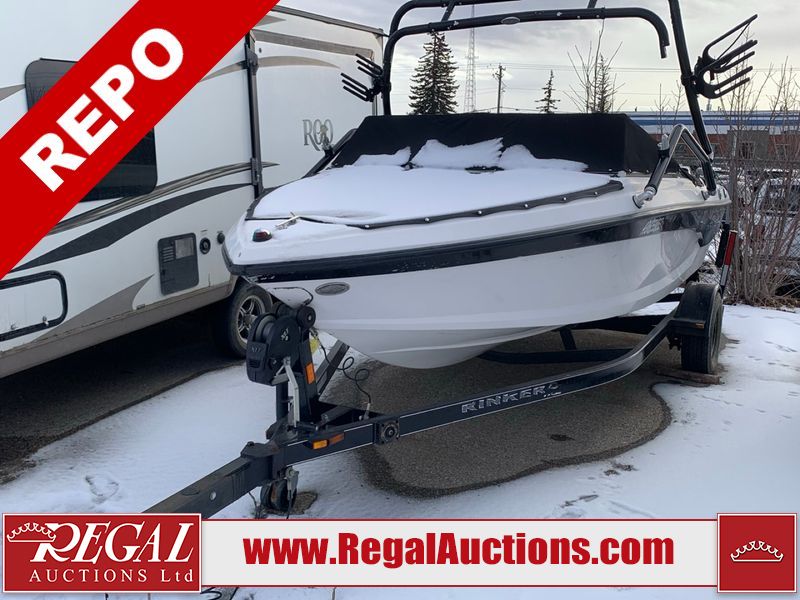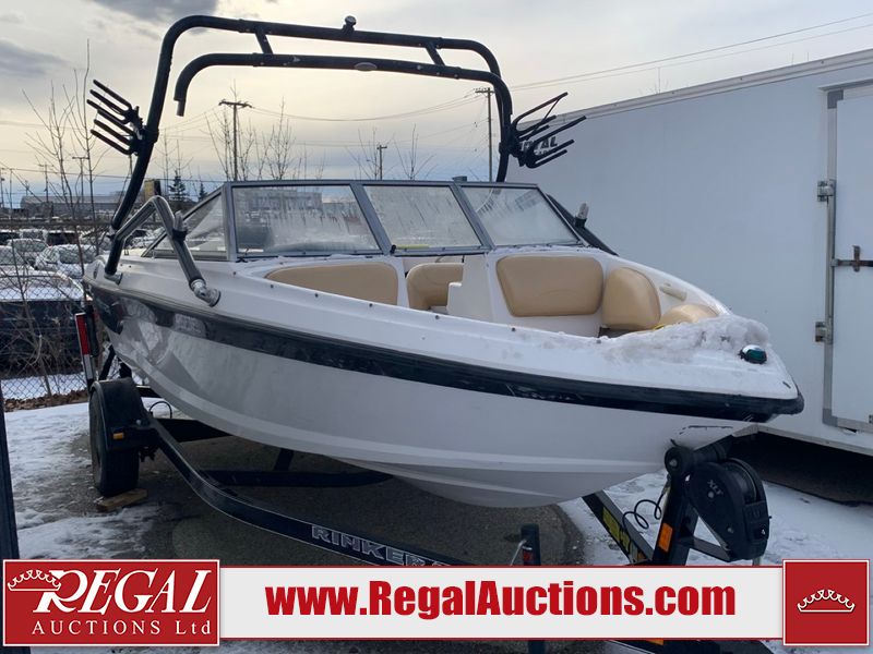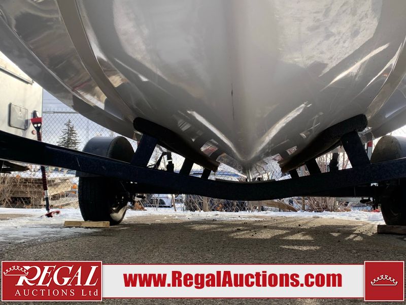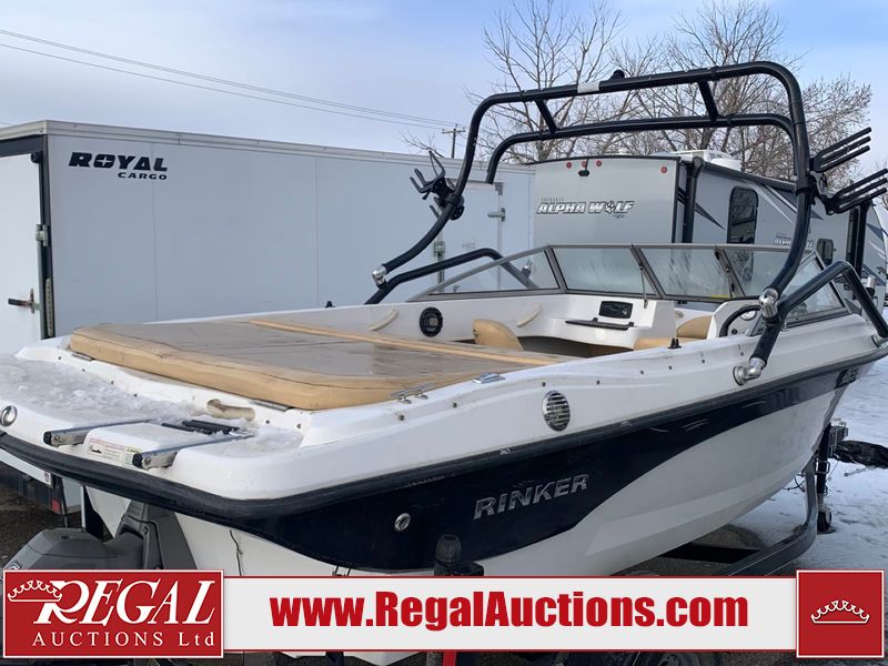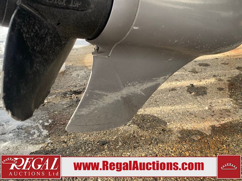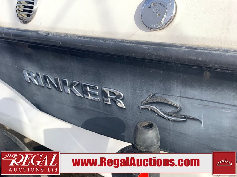 This watercraft is a 18 foot 2010 Rinker 186 bow rider model with a fibreglass v type hull. The hour metre reads 202 hours. This unit has a maximum capacity of 8 occupants or 1323lbs. The interior is dirty. The leather has stains. There are minor scuffs to the inside of the cap. The sides and bottom of the hull have deep scrapes. The hummingbird sensor has broken off of the transom. The trailer has surface rust. Steel rims are mounted, the tires have plenty of tread remaining. The engine block may be cracked. The unit is powered by a 4.3 Litre six cylinder Volvo GL engine and a stern drive. The propeller and Skegg are both damaged and may require repair. The drain plug is missing. The unit is equipped with a stereo system, hummingbird helix 5 model and a wake tower. This unit is also equipped with a canvas two piece cover.