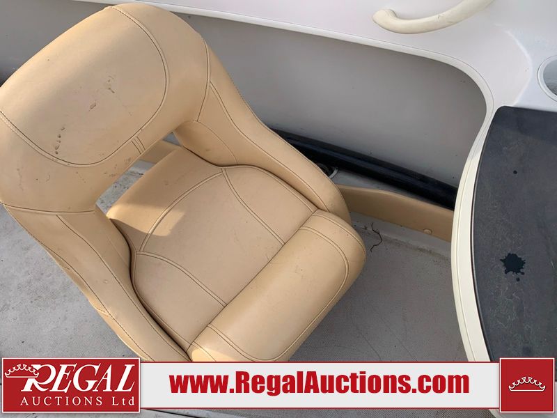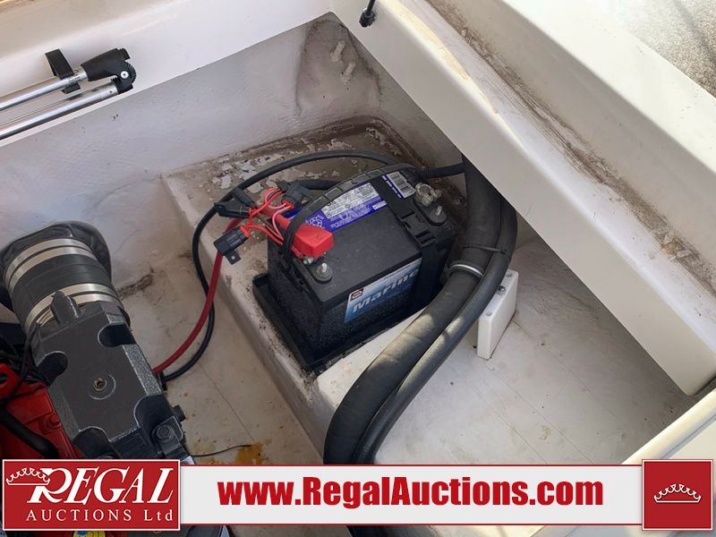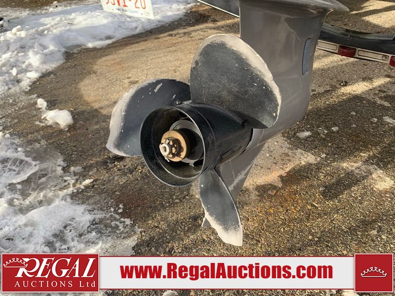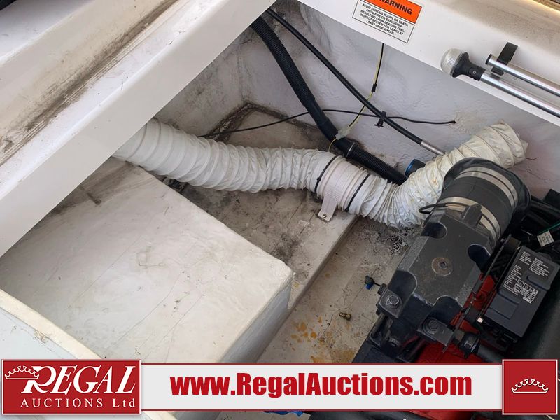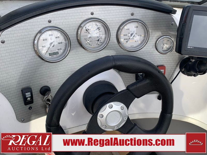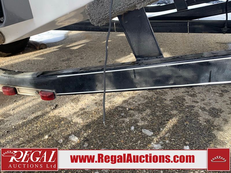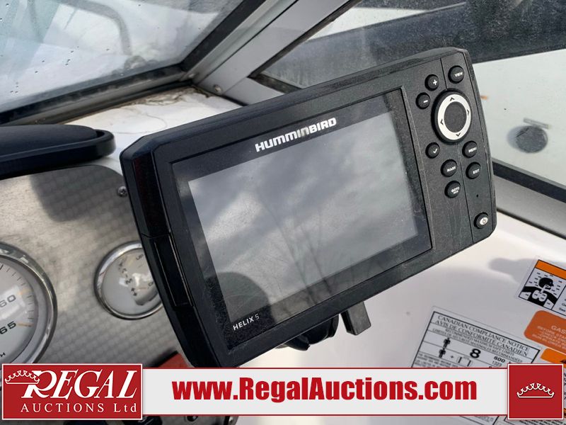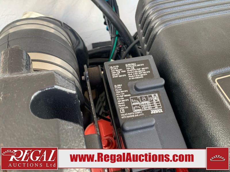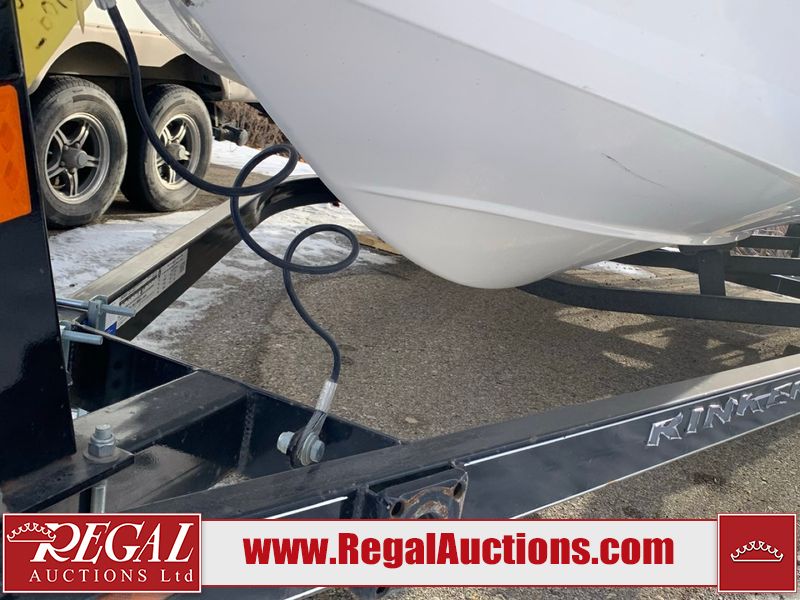 This watercraft is a 18 foot 2010 Rinker 186 bow rider model with a fibreglass v type hull. The hour metre reads 202 hours. This unit has a maximum capacity of 8 occupants or 1323lbs. The interior is dirty. The leather has stains. There are minor scuffs to the inside of the cap. The sides and bottom of the hull have deep scrapes. The hummingbird sensor has broken off of the transom. The trailer has surface rust. Steel rims are mounted, the tires have plenty of tread remaining. The engine block may be cracked. The unit is powered by a 4.3 Litre six cylinder Volvo GL engine and a stern drive. The propeller and Skegg are both damaged and may require repair. The drain plug is missing. The unit is equipped with a stereo system, hummingbird helix 5 model and a wake tower. This unit is also equipped with a canvas two piece cover.