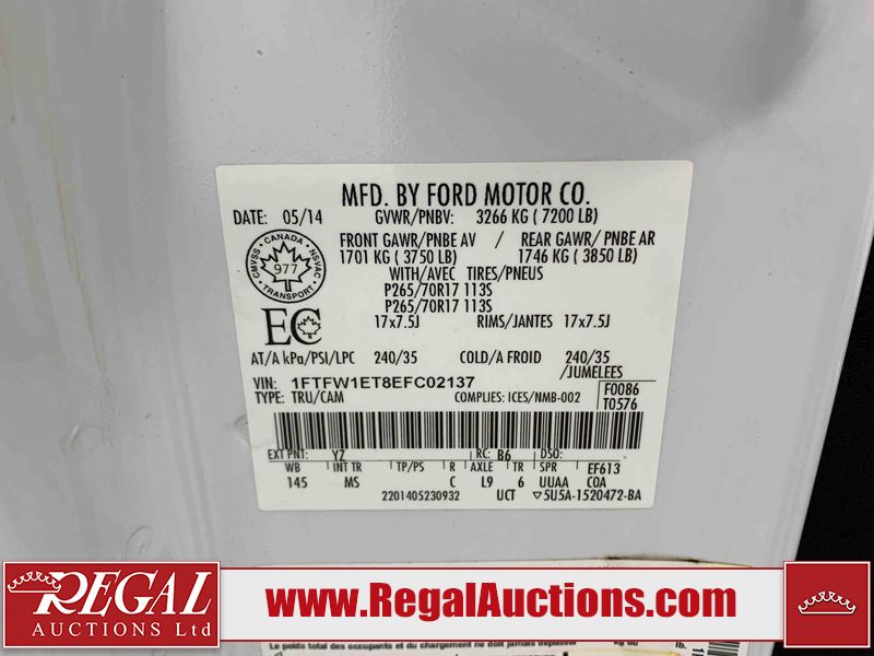 This 2014 FORD F-150 4D XLT 4WD is powered by a 3.5L 6 cylinder gasoline engine and an automatic transmission. It is equipped with four wheel drive. The truck has seats for 6 people. The truck has high mileage for its age. The vehicle has high value options including a backup camera. The Maintenance light is on. The tailgate does not open. The body looks to be in rough condition overall. There is a fair amount of rust on the roof, left rear fender, and right rear fender. There are minor chips on the front bumper, hood, roof, left front fender, left front door, left rear door, left rear fender, rear bumper, tail gate, right rear fender, right rear door, right front door, and right front fender. There are minimal scratches on the front bumper, hood, roof, left front fender, left front door, left rear door, left rear fender, rear bumper, tail gate, right rear fender, right rear door, right front door, and right front fender. There is minimal rust on the hood, left front fender, left front door, right rear door, and right front fender. There is paint peeling on the left rear fender, tail gate, and right rear fender. There are very minor chips on the grille. The tail lights are broken. The interior looks to be in fair condition overall. There is pronounced stained on the driver's seat, passenger seat, and rear seats. The doors are dirty. The windshield is damaged. All of the tires have lots of tread remaining. This truck is being sold by a franchise dealership. The vehicle will be sold with the following declarations: Dealership Trade-In (See Footnote 1). Footnotes: 1) This vehicle is being sold on behalf of a franchise dealership. Franchise Dealerships are automotive sales companies who are directly connected to an automotive manufacturer like Ford, Tesla, Honda, BMW, or similar. Regal Auctions Ltd. makes no guarantee or warranty, either express or implied, with respect to the data provided in this report. The information has been provided from the consignor and from sources generally believed to be reliable, however the accuracy of this information cannot be guaranteed by Regal Auctions.