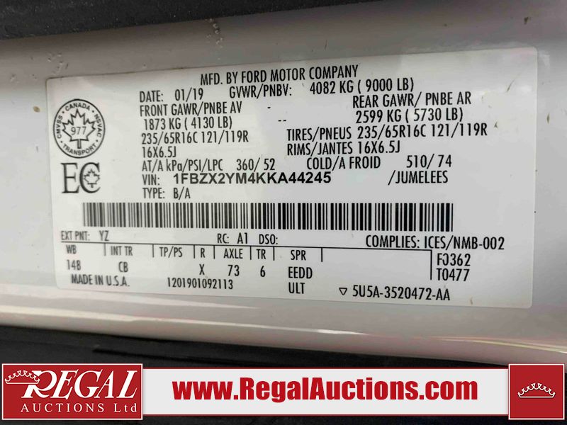 This 2019 FORD TRANSIT 350 XLT 4D VAN is powered by a 3.7L 6 cylinder gasoline engine and an automatic transmission. The van has seats for 15 people. The van has low mileage for its age. The vehicle has high value options including a backup camera. The body looks to be in good condition overall. There is moderate dent damage on the rear bumper. There are chips on the front bumper and hood. There are scratches on the rear door. There are very minor scratches in many areas around the body. There are very minor chips on the right front fender. The interior looks to be in good condition overall. The windshield looks to be in good condition. All of the tires have lots of tread remaining. This van is being sold by an automotive broker. Regal Auctions Ltd. makes no guarantee or warranty, either express or implied, with respect to the data provided in this report. The information has been provided from the consignor and from sources generally believed to be reliable, however the accuracy of this information cannot be guaranteed by Regal Auctions.