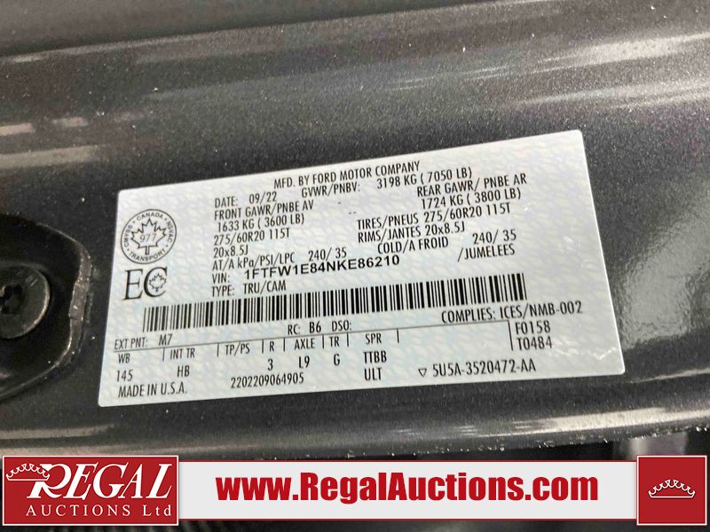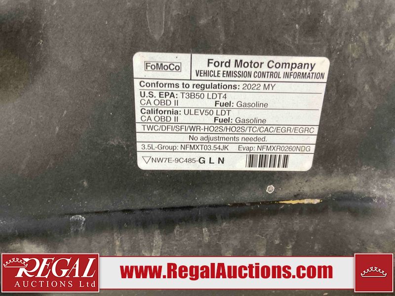 This 2022 FORD F-150 CREW CAB PICKUP is powered by a turbocharged 3.5L V6 gasoline engine and an automatic transmission. It is equipped with four-wheel drive. The truck has seats for 5 people. The truck has high mileage for its age. The vehicle has high-value options, including leather upholstery, power seats, heated seats, navigation, and a backup camera. The body looks to be in fair condition overall. There are minor chips on the front bumper, hood, and left front fender. There are very minor scratches in many areas around the body. There are very minor chips in many areas around the body. The interior looks to be in good condition overall. The windshield is chipped. All of the tires have lots of tread remaining. This truck is being sold by the fleet department of a corporation or government body. The vehicle will be sold with the following declarations: Fleet Vehicle (See Footnote 1). Footnotes: 1) This vehicle is a commercially owned work vehicle. Regal Auctions Ltd. makes no guarantee or warranty, either express or implied, with respect to the data provided in this report. The information has been provided from the consignor and from sources generally believed to be reliable, however the accuracy of this information cannot be guaranteed by Regal Auctions.
