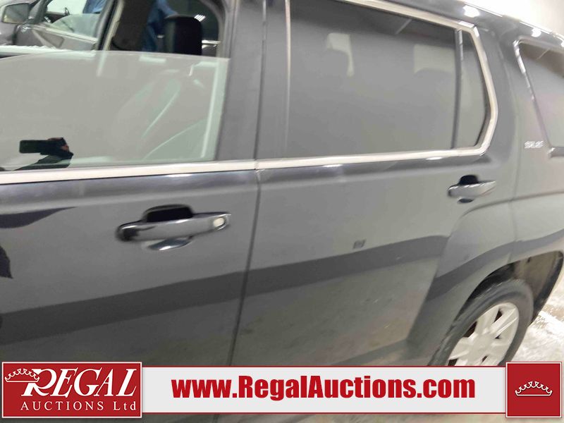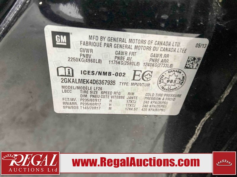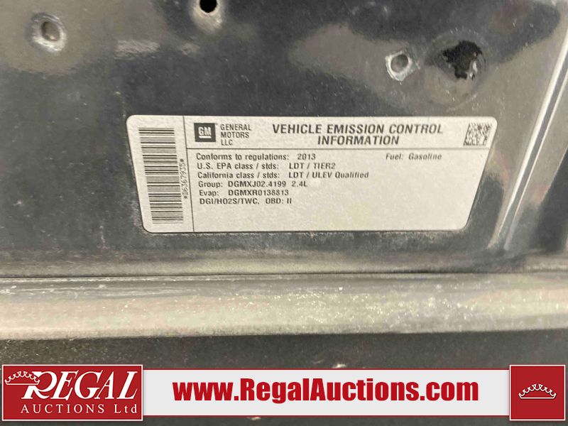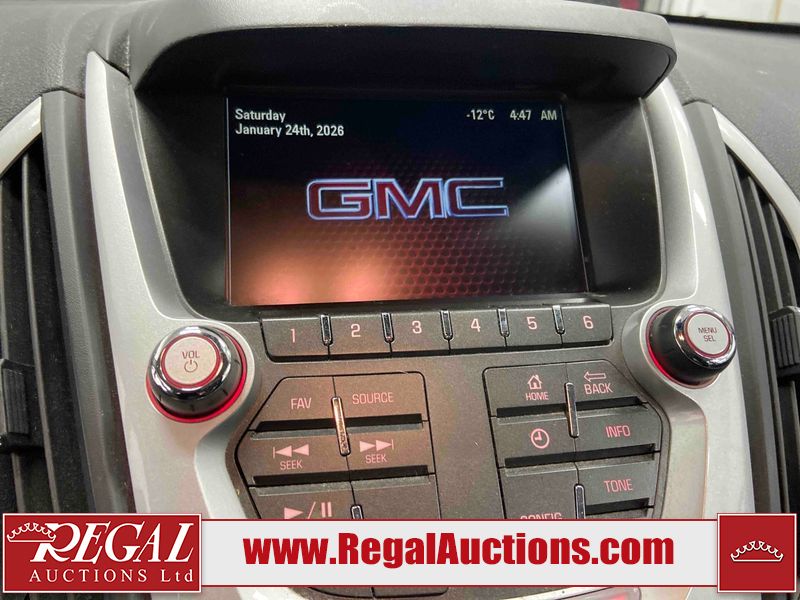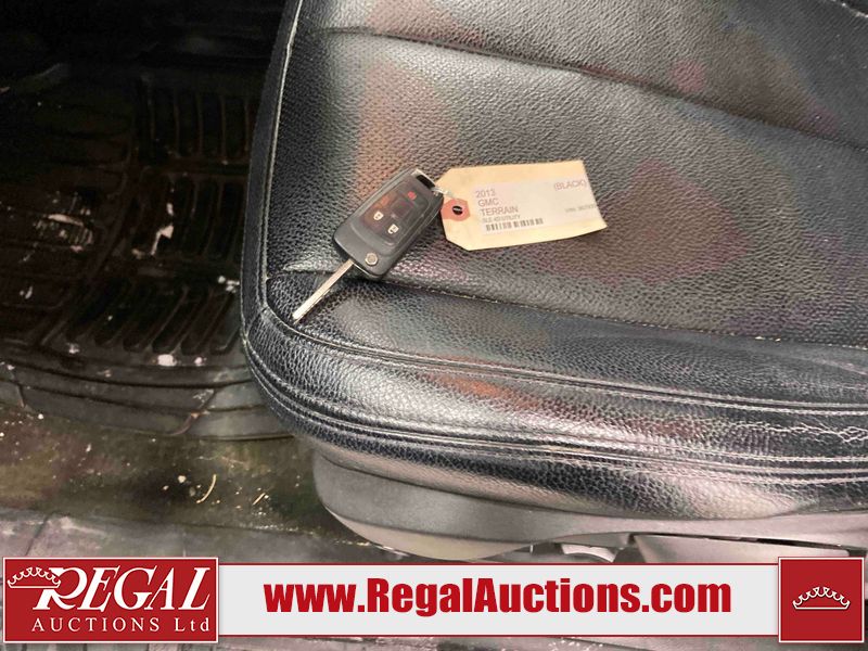 This 2013 GMC TERRAIN SLE 4D UTILITY is powered by a 2.4L 4-cylinder gasoline engine and an automatic transmission. It is a two-wheel drive model. The SUV has seats for 5 people. The SUV has low mileage for its age. The vehicle has high-value options, including leather upholstery, power seats, heated seats, navigation, and a backup camera. The body looks to be in good condition overall. There are very minor chips in many areas around the body. There are very minor scratches in many areas around the body. The interior looks to be in good condition overall. The windshield looks to be in good condition. The tires are all worn. This SUV is being sold by an automotive broker. The vehicle will be sold with the following declarations: Claims Total $3000 - $4999 (See Footnote 1), Out of Province - BC (See Footnote 2), and Out of Province - AB OVERRIDE (See Footnote 3). Footnotes: 1) The vehicle's total recorded insurance claims history is between $3,000 - $4,999. This is the amount of money that was paid out by an insurance company for repairs to cover claims against the vehicle's insurance policy. This information is provided by CarFax. 2) The vehicle's last registered jurisdiction is British Columbia. The purchaser must have the vehicle undergo and pass an Out of Province inspection before it can be registered in Alberta. 3) Out of province inspection for registering the vehicle in Alberta has been completed. Regal Auctions Ltd. makes no guarantee or warranty, either express or implied, with respect to the data provided in this report. The information has been provided from the consignor and from sources generally believed to be reliable, however the accuracy of this information cannot be guaranteed by Regal Auctions.