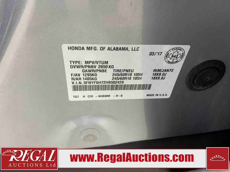 This 2017 HONDA PILOT 4D UTILITY 4WD is powered by a 3.5L 6 cylinder gasoline engine and an automatic transmission. It is equipped with four wheel drive. The SUV has seats for 8 people. The mileage is average considering the SUV's age. The vehicle has high value options including a sunroof, leather upholstery, power seats, heated seats, navigation, and a backup camera. The body looks to be in good condition overall. There are slight chips on the front bumper. There is dent damage on the right rear door. There are very minor scratches in many areas around the body. There are very minor chips in many areas around the body. The interior looks to be in good condition overall. The windshield is damaged. The tires are all worn. This SUV is being sold by a franchise dealership. The vehicle will be sold with the following declarations: Dealership Trade-In (See Footnote 1). Footnotes: 1) This vehicle is being sold on behalf of a franchise dealership. Franchise Dealerships are automotive sales companies who are directly connected to an automotive manufacturer like Ford, Tesla, Honda, BMW, or similar. Regal Auctions Ltd. makes no guarantee or warranty, either express or implied, with respect to the data provided in this report. The information has been provided from the consignor and from sources generally believed to be reliable, however the accuracy of this information cannot be guaranteed by Regal Auctions.