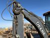 This unit is a 2014 John Deere 310S model excavator. The meter reads 5,947 hours. The interior is dirty. The interior is equipped with air conditioning. Cab glass appears intact. The exterior is covered with scratches, dents, and some rust. The unit may have limited operation but requires repair for use. Third gear on the transmission does not function. Transmission housing has a hole. Swing frame requires pins and bushings. It is equipped with front and rear buckets