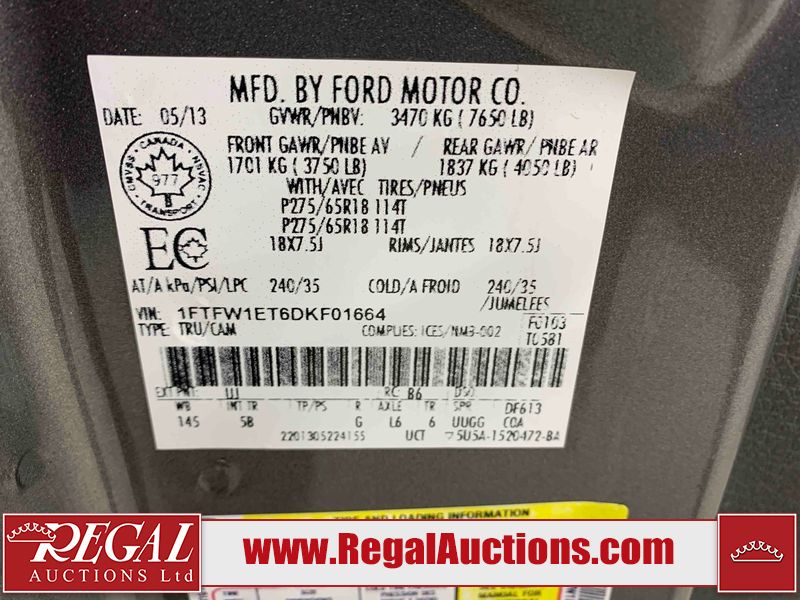 This 2013 FORD F-150 FX4 SUPERCREW 4WD is powered by a turbocharged 3.5L 6 cylinder gasoline engine and an automatic transmission. It is equipped with four wheel drive. The truck has seats for 5 people. The vehicle has high value options including leather upholstery, power seats, heated seats, navigation, and a backup camera. The Check Engine light is on. The vehicle has some mechanical problems. The battery is dead. The vehicle requires a boost to start and may require a booster pack in order to stay running. (See Footnote 1) The body looks to be in fair condition overall. There is pronounced rust on the front bumper. There are minor chips on the hood, left front fender, left front door, left rear fender, right rear fender, and right front fender. There are minor scratches on the left rear door, left rear fender, rear bumper, tail gate, and right rear fender. There is minor dent damage on the tail gate and right rear door. There is very minor dent damage in a few areas around the body. There are very minor chips in a few areas around the body. There are very minor scratches in a few areas around the body. The interior looks to be in good condition overall. The windshield is cracked. All of the tires have lots of tread remaining. This truck is being sold by the fleet department of a company or government body. The vehicle will be sold with the following declarations: Abandoned Vehicle (See Footnote 2), As Is - Where Is (See Footnote 3), and True Mileage Unknown (See Footnote 4). Footnotes: 1) We've identified some mechanical problems with the vehicle. However, the vehicle has not undergone a mechanical inspection and our findings are not to be considered a complete evaluation of the vehicle's mechanical condition. Review our Buyer Protection Policy to see how Regal Auctions protects you from undisclosed mechanical problems. 2) This vehicle has been abandoned by its owner and is being sold by the government. The Vehicle Seizure and Removal Regulation of the Traffic Safety Act of Alberta provides that the purchaser will get good title to the vehicle. Any liens registered against the vehicle will be unenforceable by the creditor. However, the vehicle may continue to have lien registrations against it in the Alberta Registries System. It is the the responsibility of the purchaser to have any lien registrations removed. Regal Auctions will not provide any lien discharge or other paperwork with the exception of a letter from the Government of Alberta authorizing the sale of the vehicle. 3) This vehicle will be sold "AS IS and WHERE IS". The sale will be final. The Buyer Protection Policy will not apply to the purchase of this vehicle. This vehicle is not eligible for return. 4) The accuracy and history of the odometer reading cannot be verified and the current odometer reading is not believed to be correct. Regal Auctions Ltd. makes no guarantee or warranty, either express or implied, with respect to the data provided in this report. The information has been provided from the consignor and from sources generally believed to be reliable, however the accuracy of this information cannot be guaranteed by Regal Auctions.