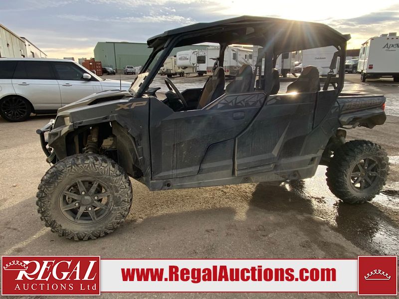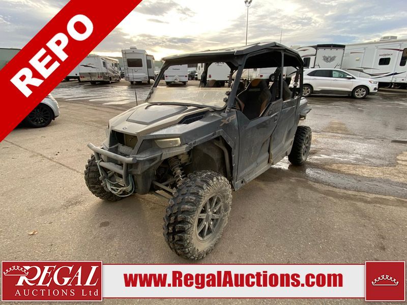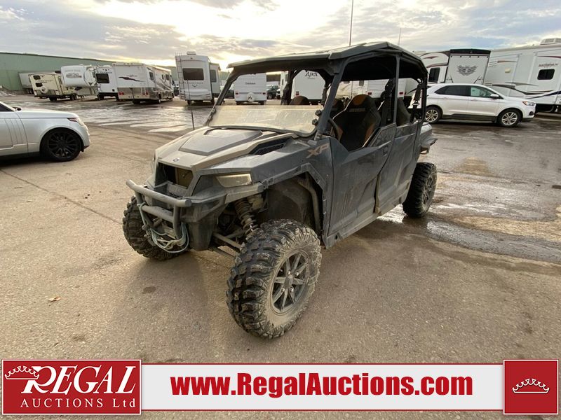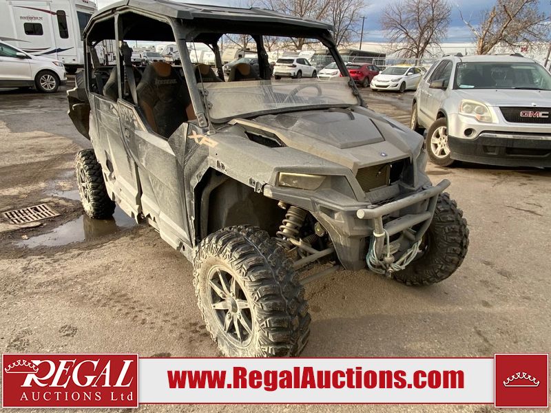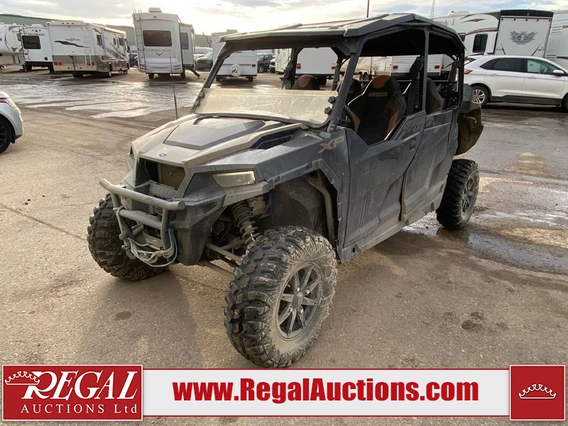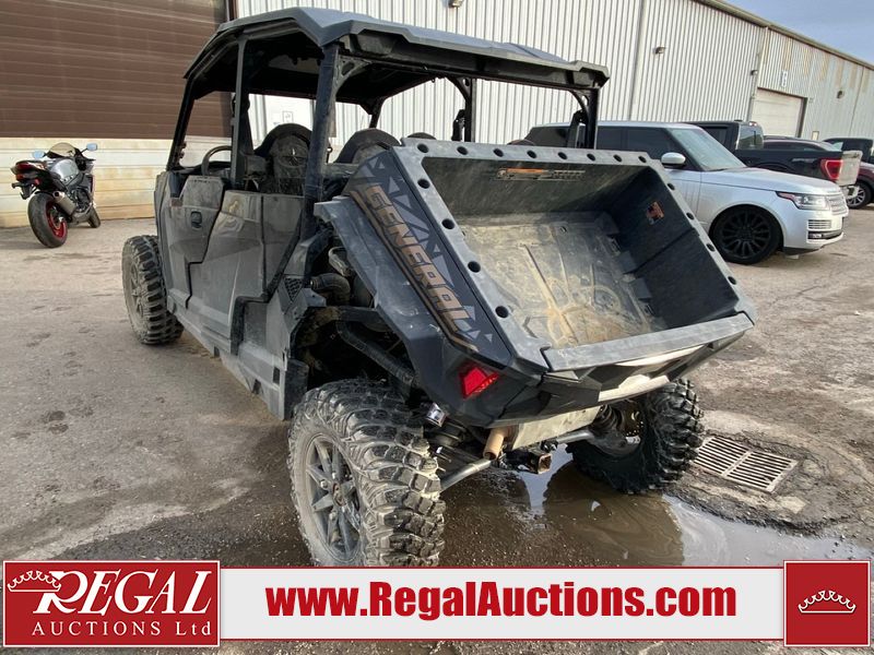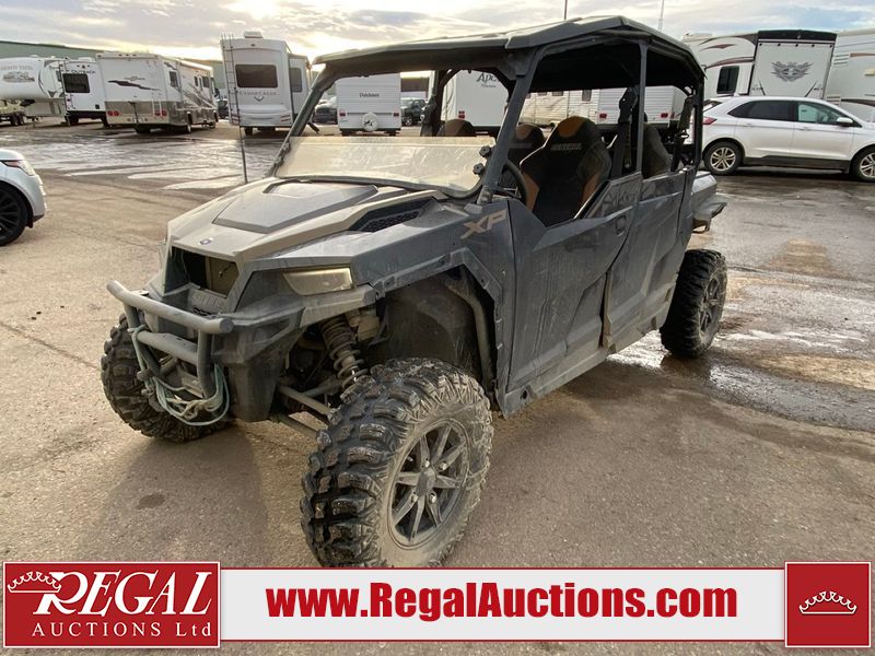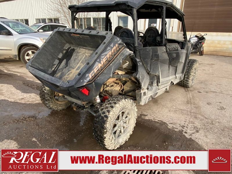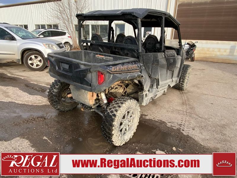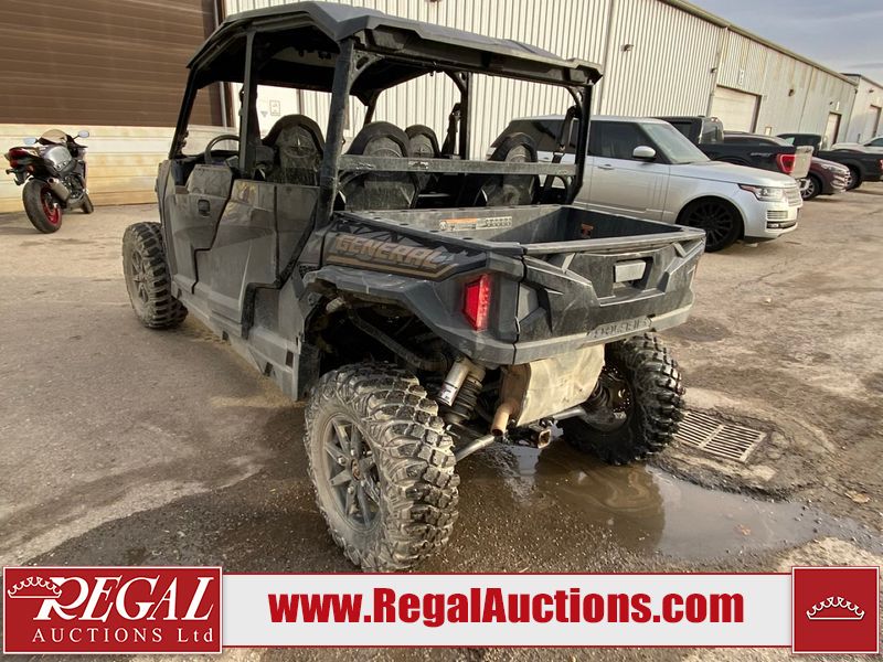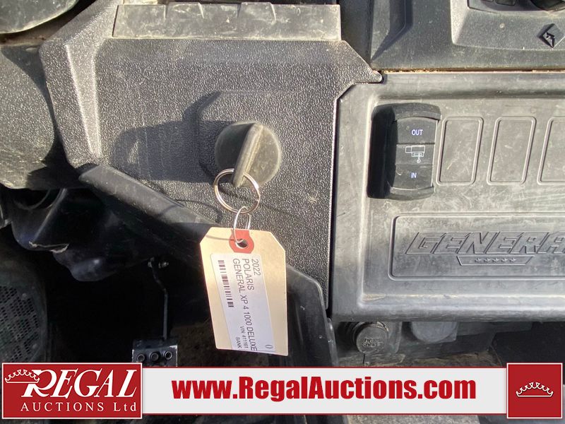 This ATV is a 2022 Polaris general XP four 1000 deluxe model. The odometer shows 2,908 km and 143 engine hours. The interior is dirty. Most panels are showing chips, scratches, and scuffs. Both the front vendors are missing plastics. He hood panel is missing an air vent, and the grille. The left rear door is misaligned. The exhaust shield is bent. The rear right fender is cracked. The left rear door has a missing piece. The front right door panel is broken. The rear right brake caliber is not mounted and has been taped. This unit starts and runs without a boost. The brakes are inoperable. This unit is powered by a 1000 cc two cylinder liquid cooled engine with a continuously variable transmission and a shaft vinyl drive. The tires are mounted to alloy rims and appear to be in good enough condition for use. This unit is equipped with a front winch, 2WD/4WD selector, and a stereo system.