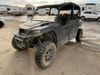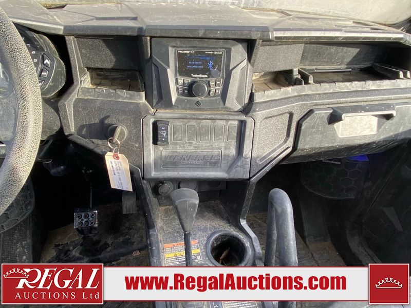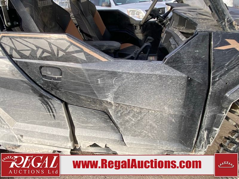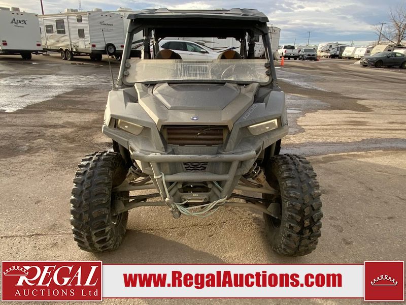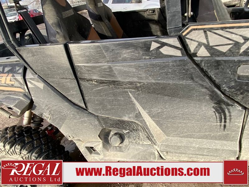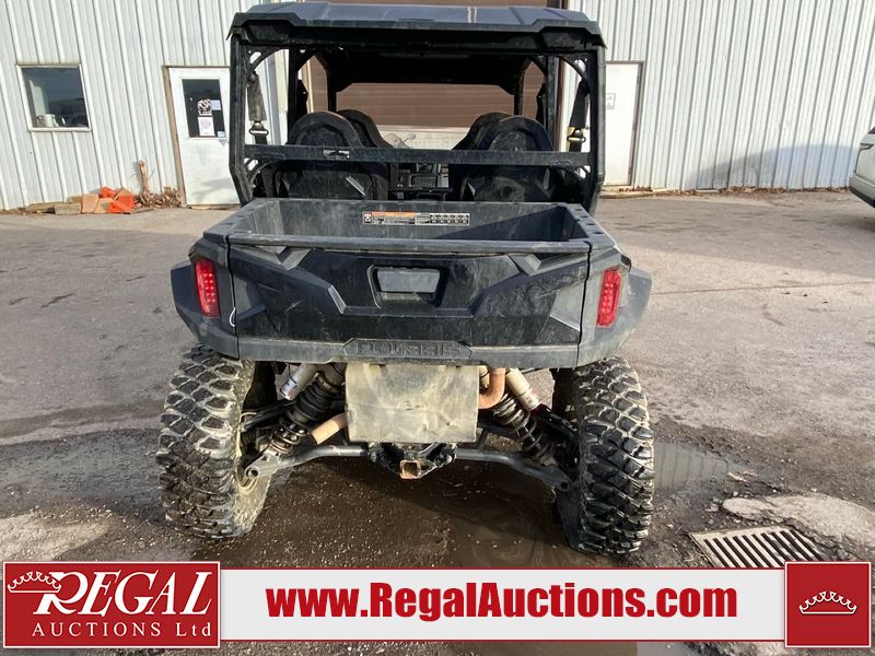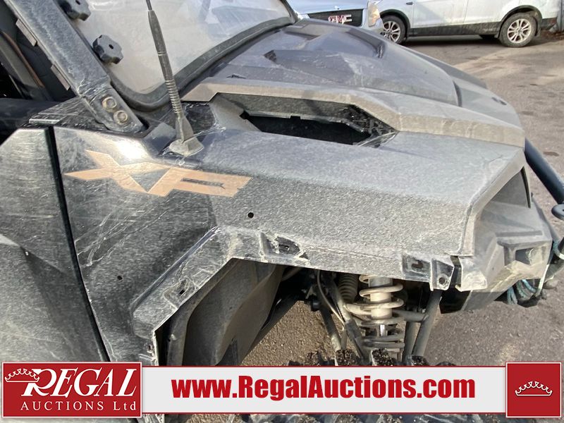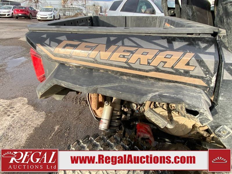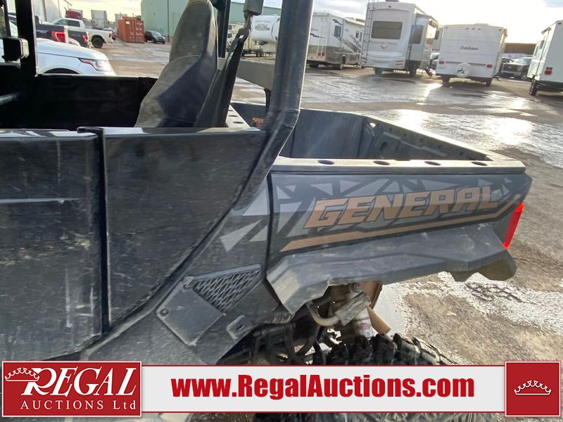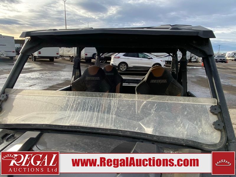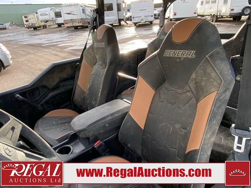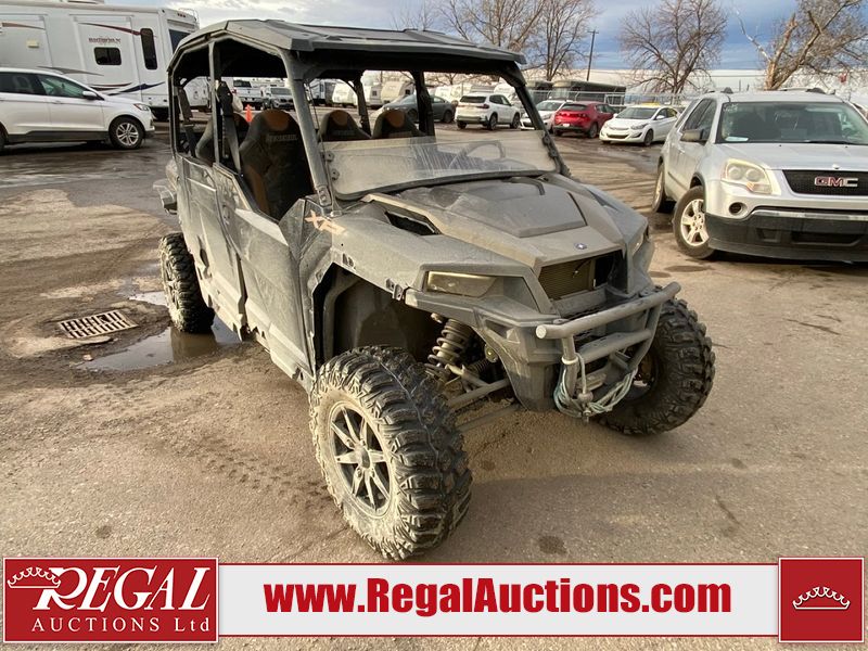 This ATV is a 2022 Polaris general XP four 1000 deluxe model. The odometer shows 2,908 km and 143 engine hours. The interior is dirty. Most panels are showing chips, scratches, and scuffs. Both the front vendors are missing plastics. He hood panel is missing an air vent, and the grille. The left rear door is misaligned. The exhaust shield is bent. The rear right fender is cracked. The left rear door has a missing piece. The front right door panel is broken. The rear right brake caliber is not mounted and has been taped. This unit starts and runs without a boost. The brakes are inoperable. This unit is powered by a 1000 cc two cylinder liquid cooled engine with a continuously variable transmission and a shaft vinyl drive. The tires are mounted to alloy rims and appear to be in good enough condition for use. This unit is equipped with a front winch, 2WD/4WD selector, and a stereo system.