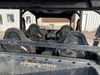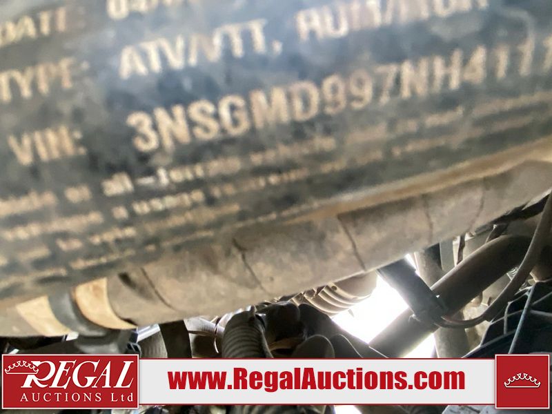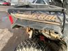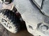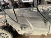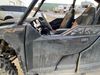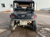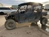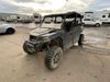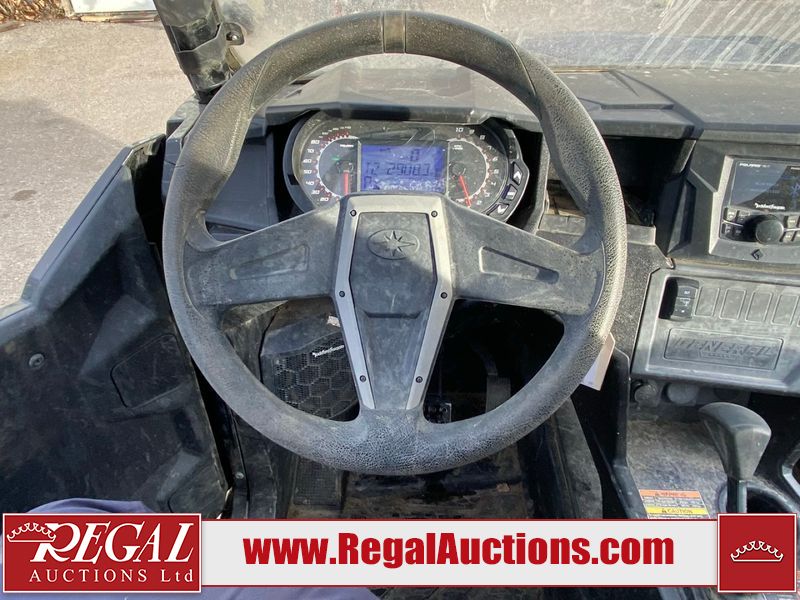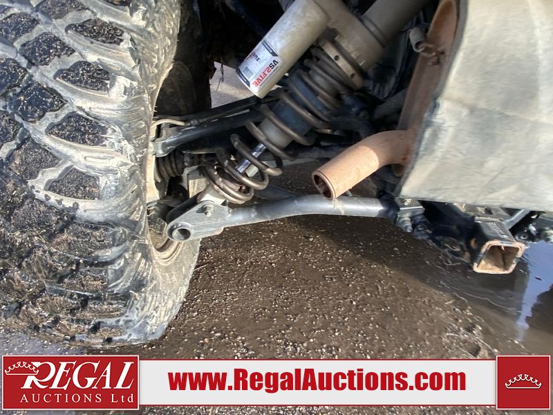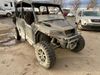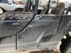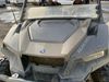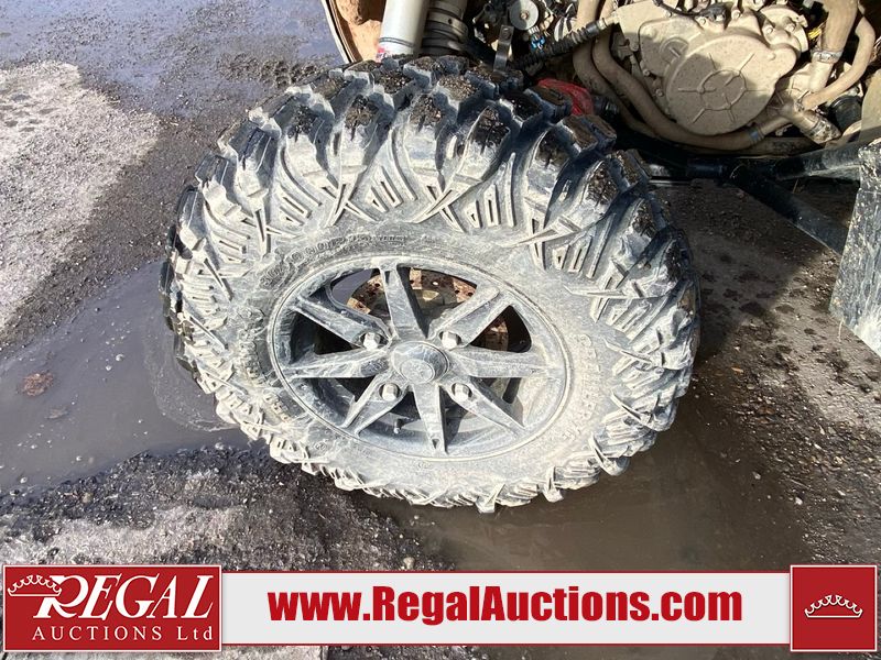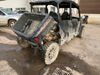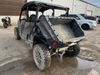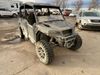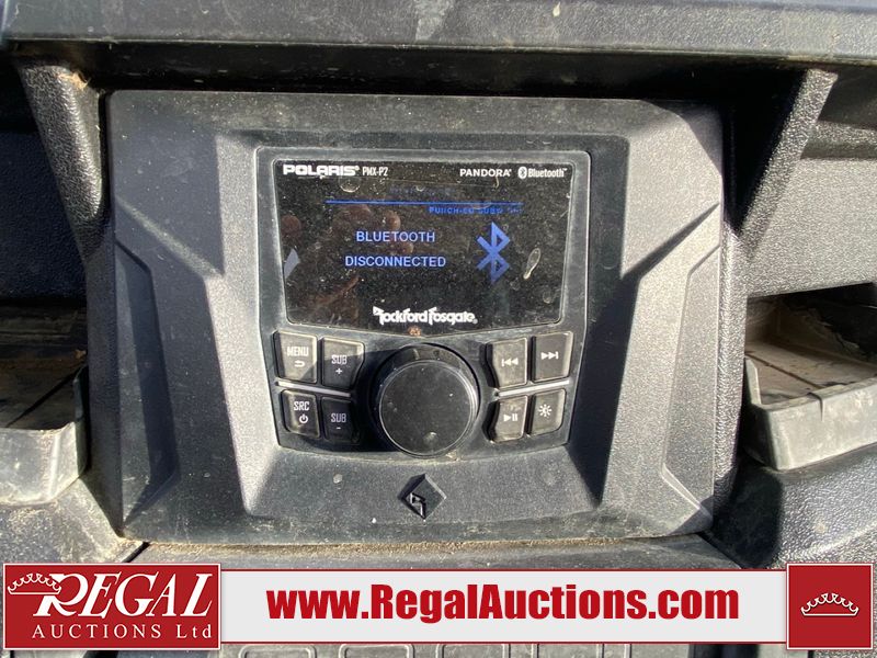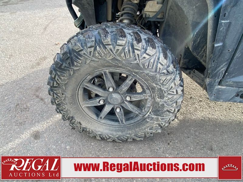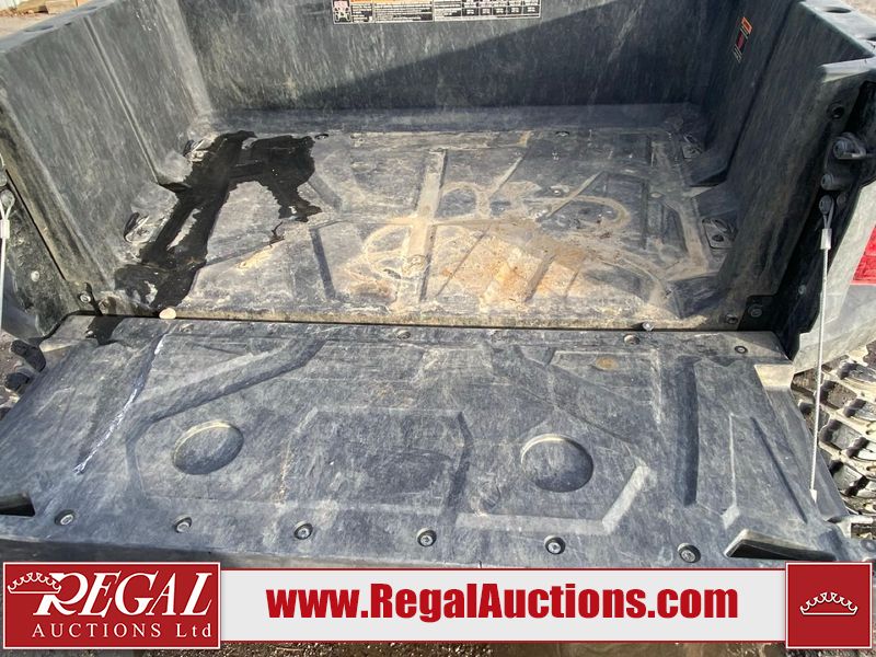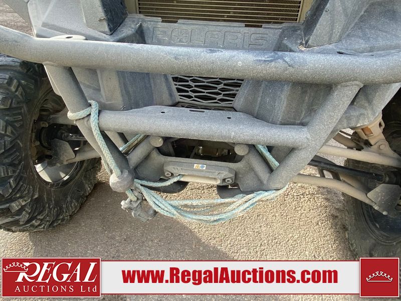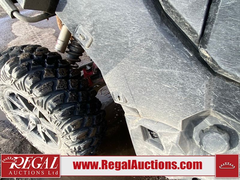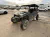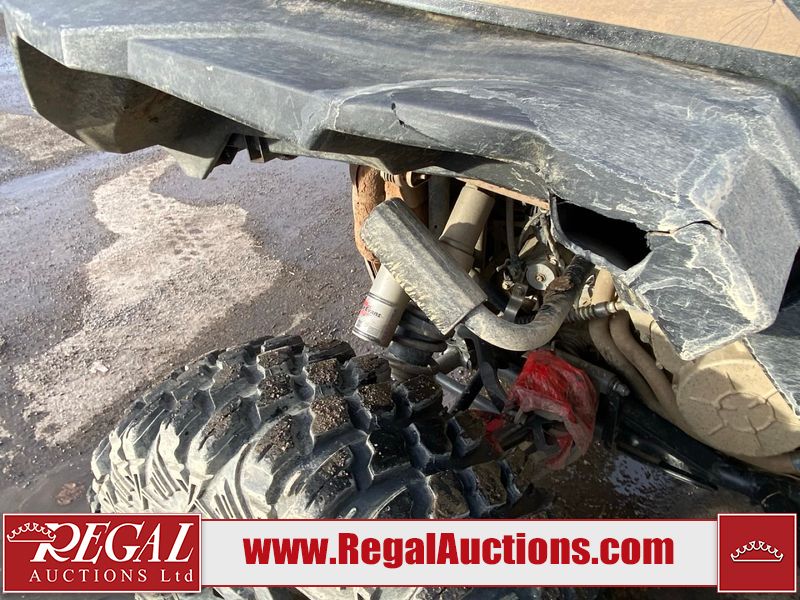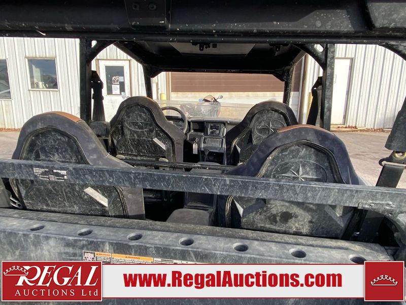 This ATV is a 2022 Polaris general XP four 1000 deluxe model. The odometer shows 2,908 km and 143 engine hours. The interior is dirty. Most panels are showing chips, scratches, and scuffs. Both the front vendors are missing plastics. He hood panel is missing an air vent, and the grille. The left rear door is misaligned. The exhaust shield is bent. The rear right fender is cracked. The left rear door has a missing piece. The front right door panel is broken. The rear right brake caliber is not mounted and has been taped. This unit starts and runs without a boost. The brakes are inoperable. This unit is powered by a 1000 cc two cylinder liquid cooled engine with a continuously variable transmission and a shaft vinyl drive. The tires are mounted to alloy rims and appear to be in good enough condition for use. This unit is equipped with a front winch, 2WD/4WD selector, and a stereo system.