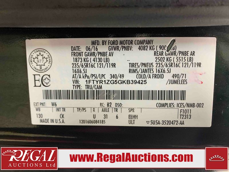 This 2016 FORD TRANSIT 250 CARGO VAN is powered by a turbocharged 3.5L V6 gasoline engine and an automatic transmission. The van has seats for 2 people. The mileage is average considering the van's age. The vehicle has high-value options, including a backup camera. The body looks to be in fair condition overall. There is a fair amount of dent damage on the left rear fender. There are chips on the front bumper, hood, and left front fender. There is rust on the hood. There are slight scratches on the left rear fender, rear bumper, right rear fender, right rear door, and right front door. There is incidental dent damage on the rear door. There are very minor scratches in a few areas around the body. There are very minor chips in a few areas around the body. The interior looks to be in fair condition overall. The passenger seat is stained. There are stains on the driver's seat. The driver's seat is torn. The windshield is chipped. All of the tires have lots of tread remaining. This van is being sold by an automotive broker. The vehicle will be sold with the following declarations: Claims Total $1000 - $2999 (See Footnote 1). Footnotes: 1) The vehicle's total recorded insurance claims history is between $1,000 - $2,999. This is the amount of money that was paid out by an insurance company for repairs to cover claims against the vehicle's insurance policy. This information is provided by CarFax. Regal Auctions Ltd. makes no guarantee or warranty, either express or implied, with respect to the data provided in this report. The information has been provided from the consignor and from sources generally believed to be reliable, however the accuracy of this information cannot be guaranteed by Regal Auctions.