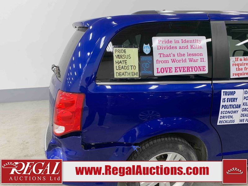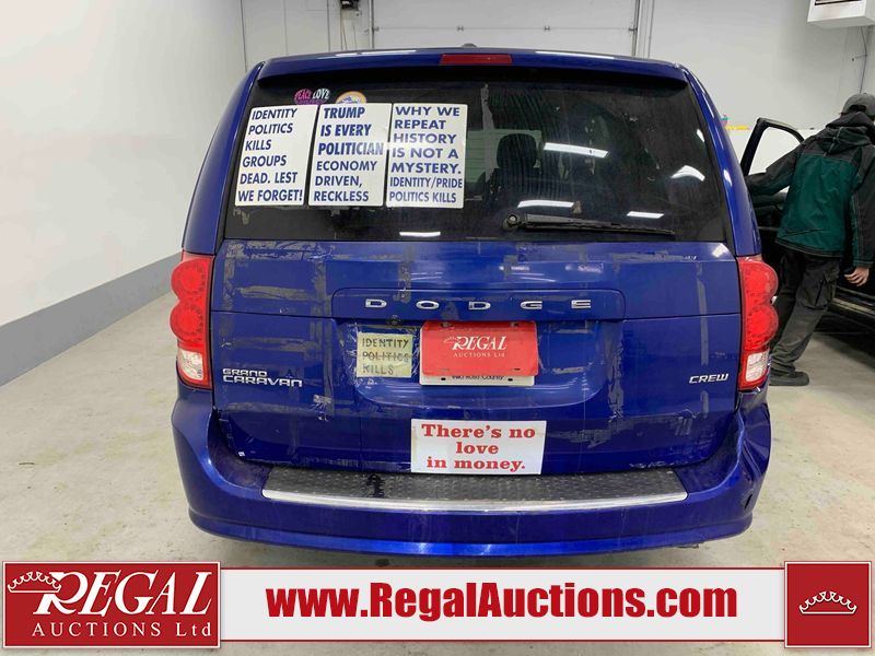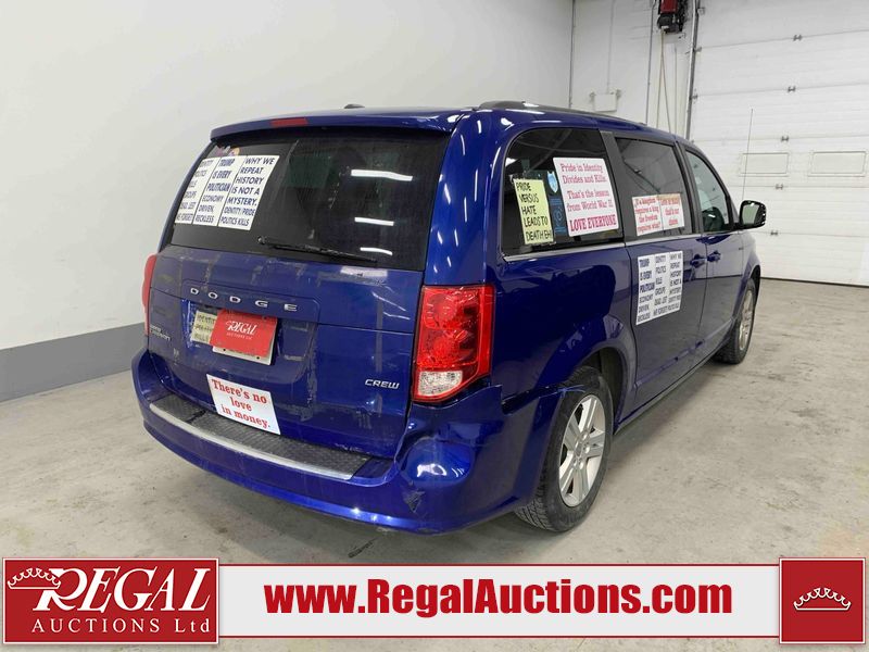This 2020 DODGE GRAND CARAVAN CREW PLUS 4D VAN FWD 3.6L is powered by a 6 cylinder gasoline engine and an automatic transmission. The van has seats for 7 people. The van has high mileage for its age. The vehicle has high value options including leather upholstery, power seats, heated seats, a DVD Player, and a backup camera. The body looks to be in rough condition overall. The rear bumper is cracked. There is extensive dent damage on the rear bumper. There is a fair amount of paint peeling on the front bumper. There are chips on the front bumper, grille, hood, roof, left front fender, rear bumper, right front door, and right front fender. There are scratches on the hood. There are very minor scratches in many areas around the body. There are very minor chips in many areas around the body. The rear bumper has been held on by zip ties. There is adhesive damage to the rear door. The right tail light is broken. The interior looks to be in good condition overall. The carpet is dirty. The passenger side mirror housing is broken. The windshield is cracked. The tires are all worn.